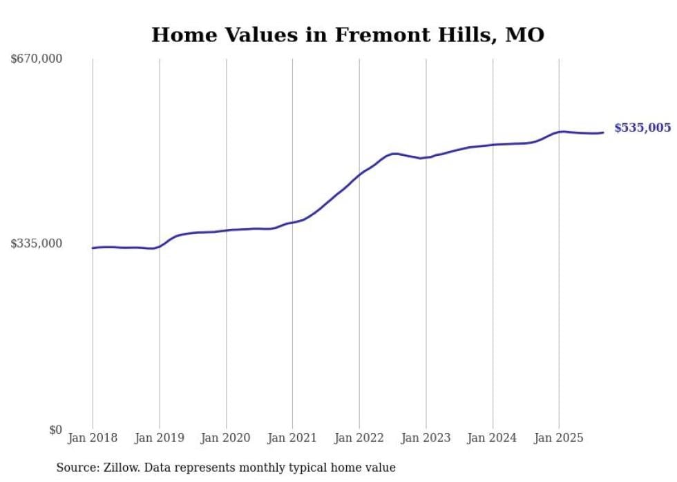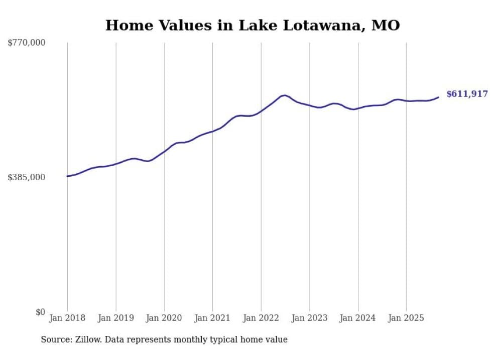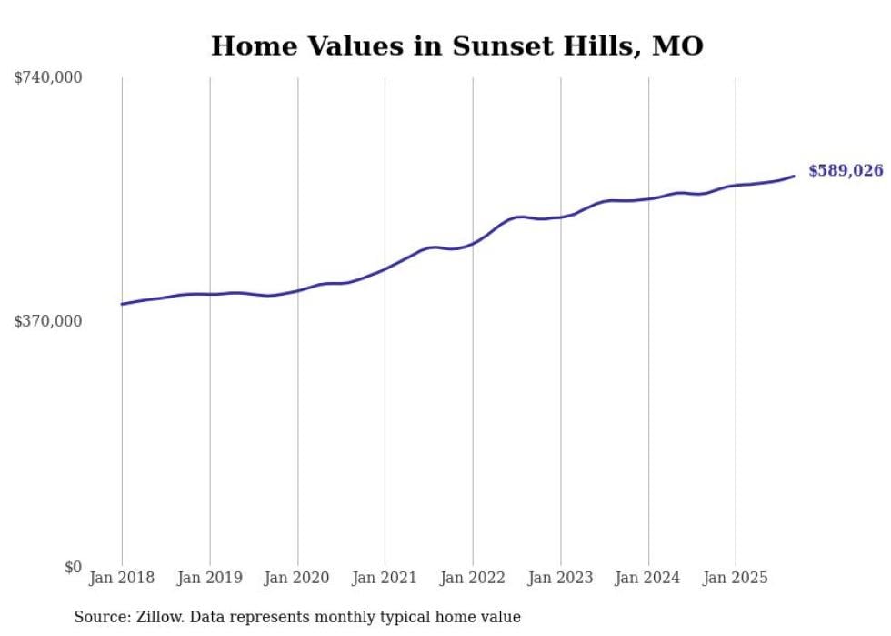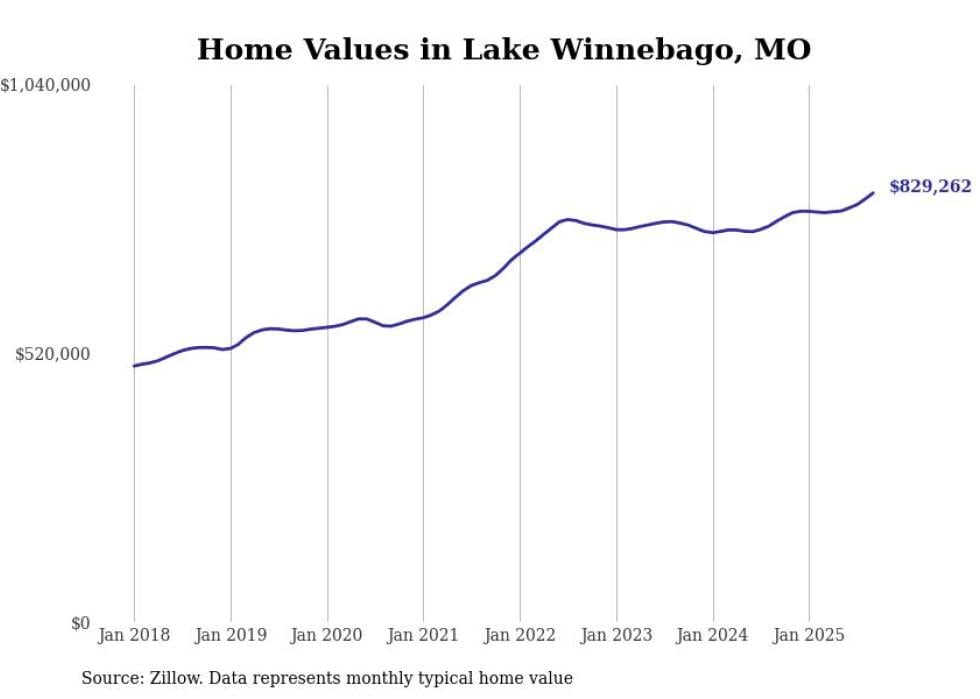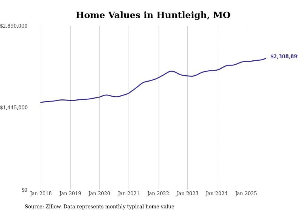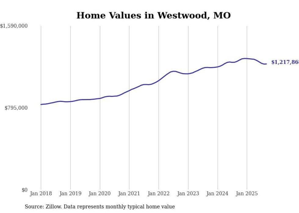 Stacker compiled a list of cities with the most expensive homes in Missouri using data from Zillow. Cities are ranked by the Zillow Home Values Index for all homes as of September 2025. The charts in this story were created automatically using Matplotlib.