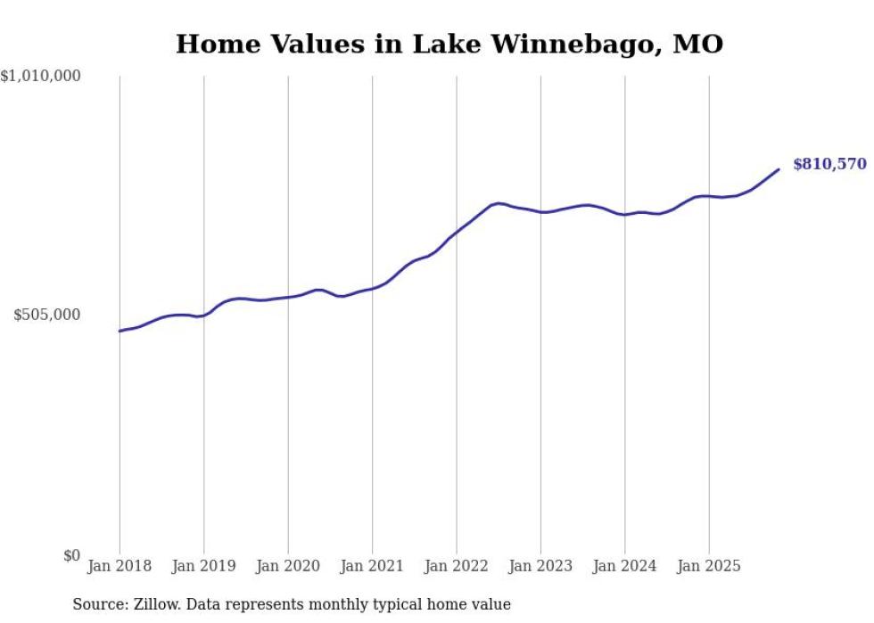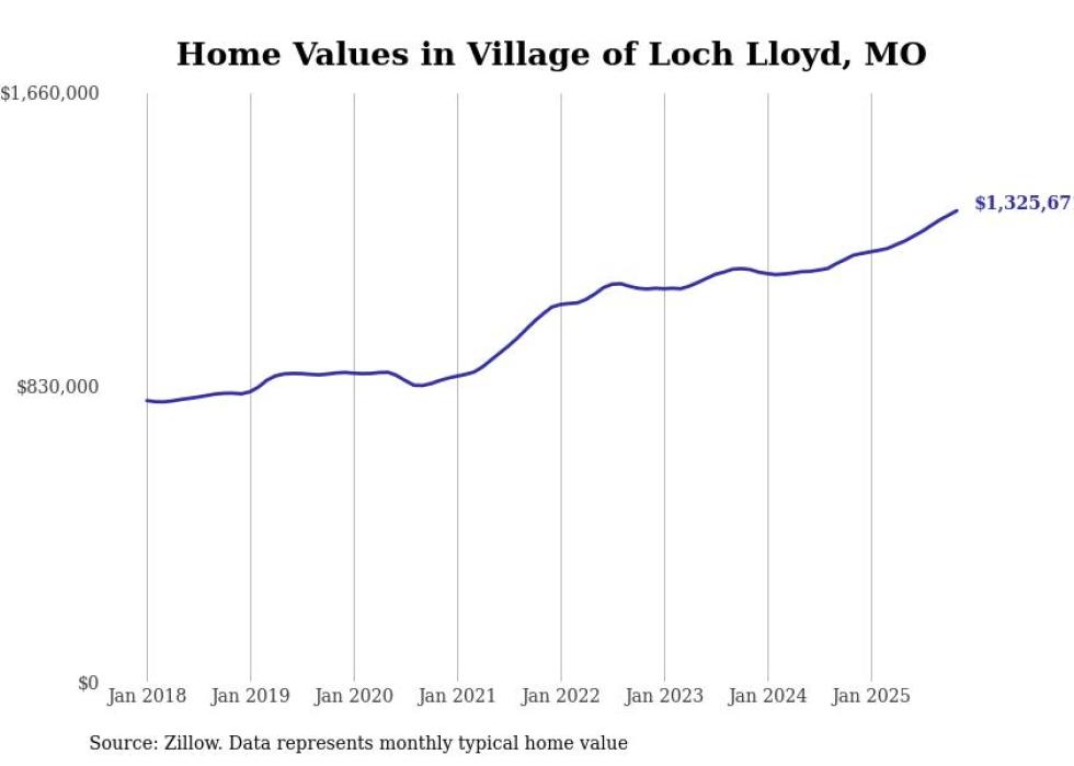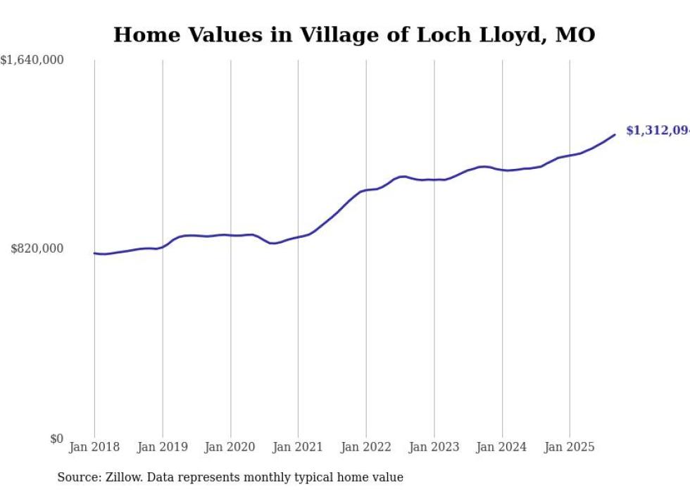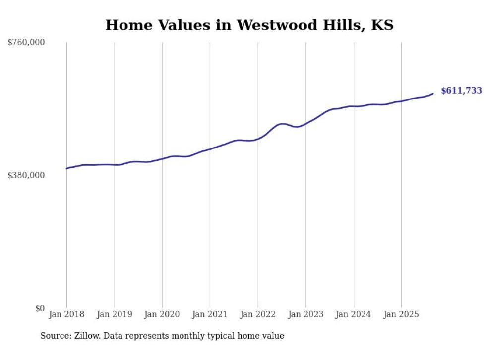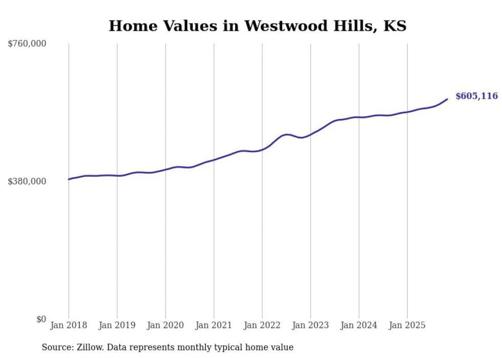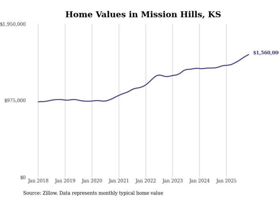 Stacker compiled a list of cities with the most expensive homes in the Kansas City, MO-KS metro area using data from Zillow. Charts show the monthly typical home value since January 2018.