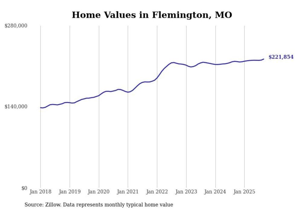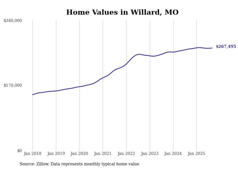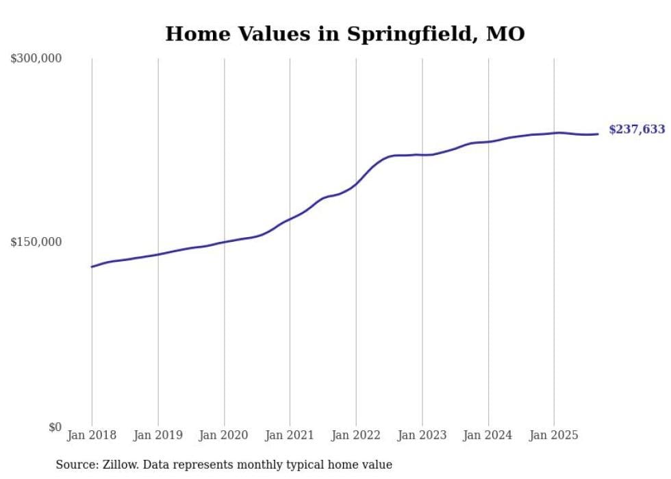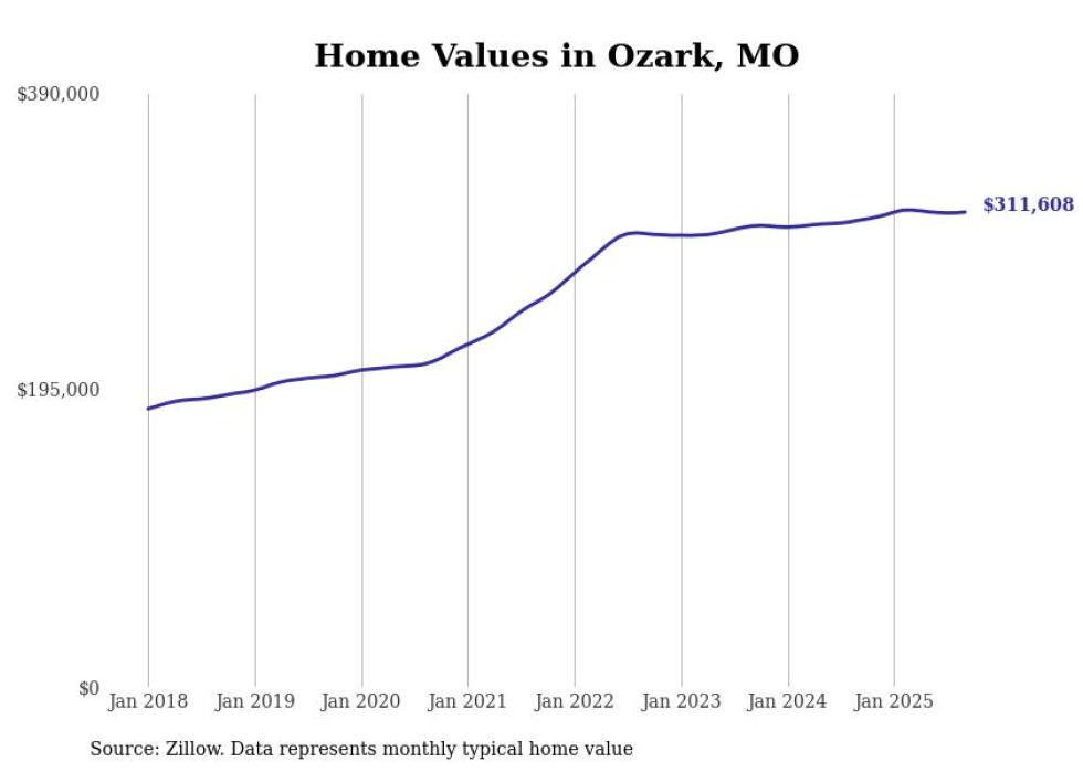 Stacker compiled a list of cities with the most expensive homes in the Springfield, MO metro area using data from Zillow. Charts show the monthly typical home value since January 2018.