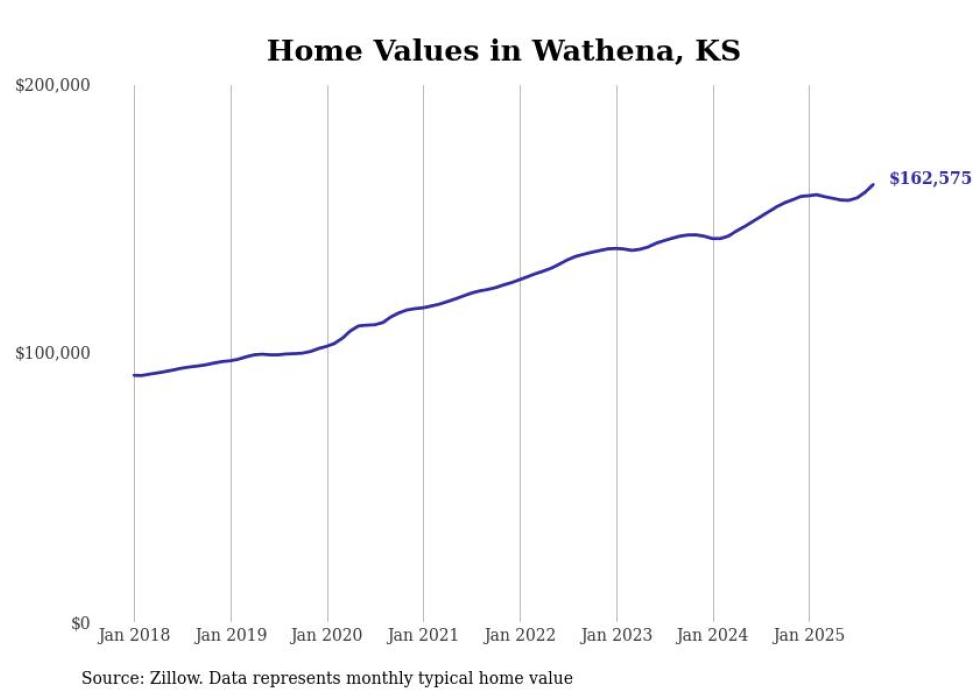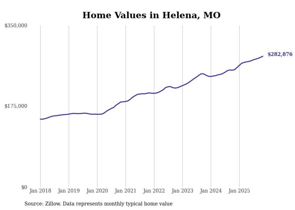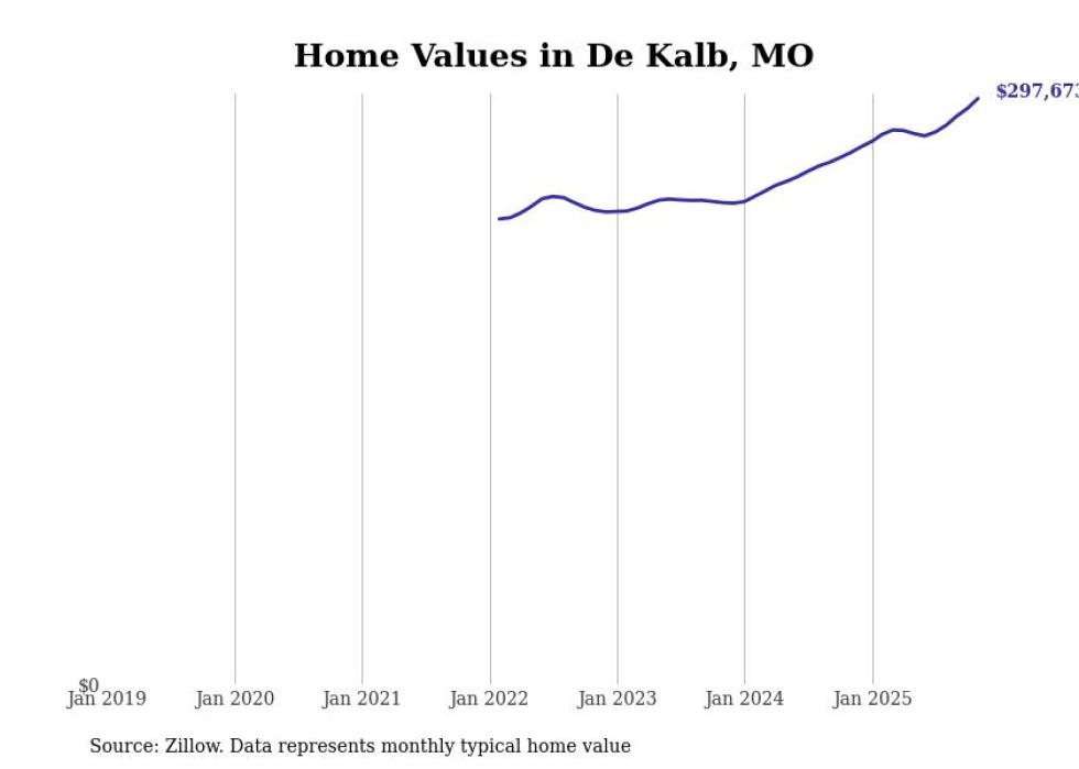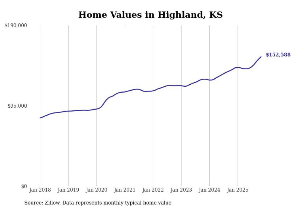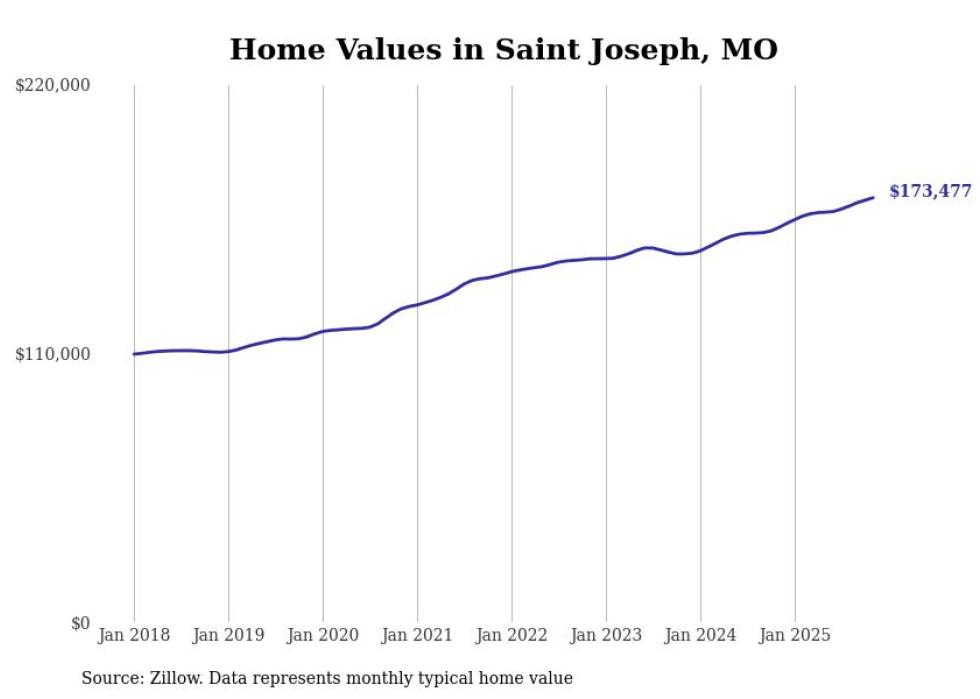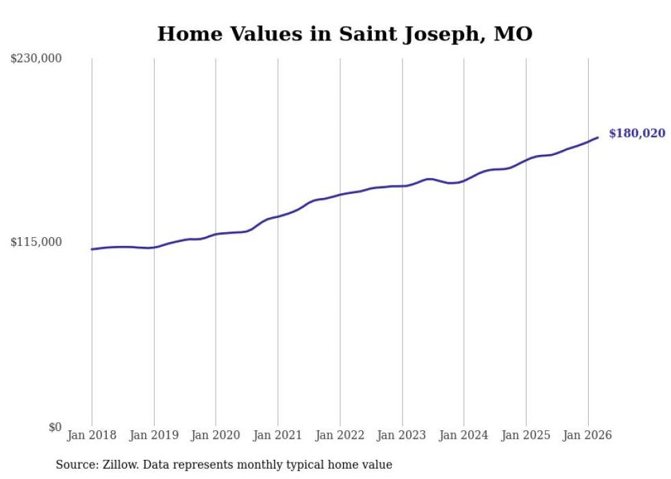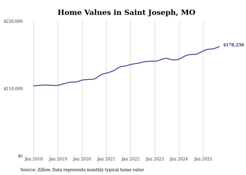 Stacker compiled a list of cities with the most expensive homes in the St. Joseph, MO-KS metro area using data from Zillow. Charts show the monthly typical home value since January 2018.
