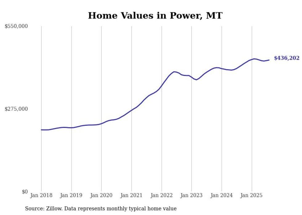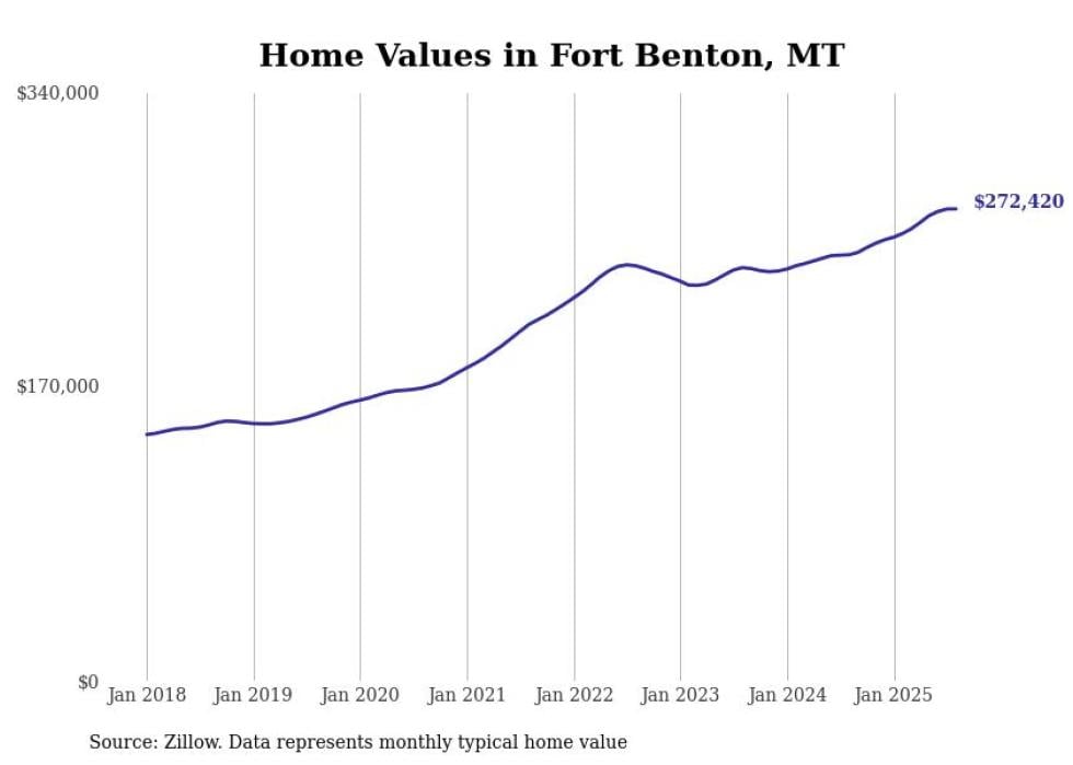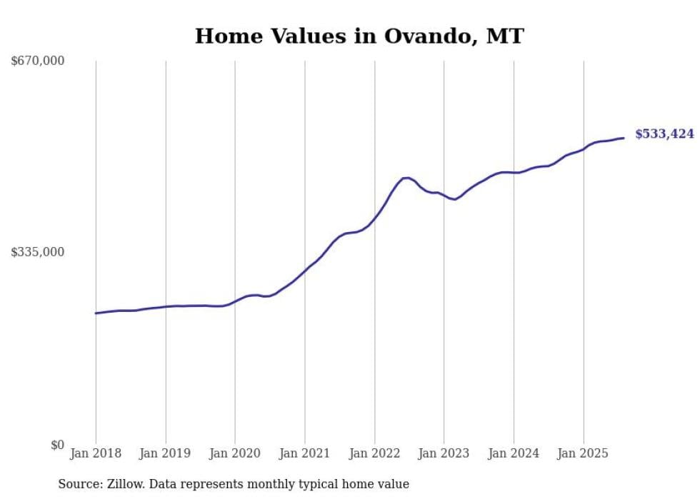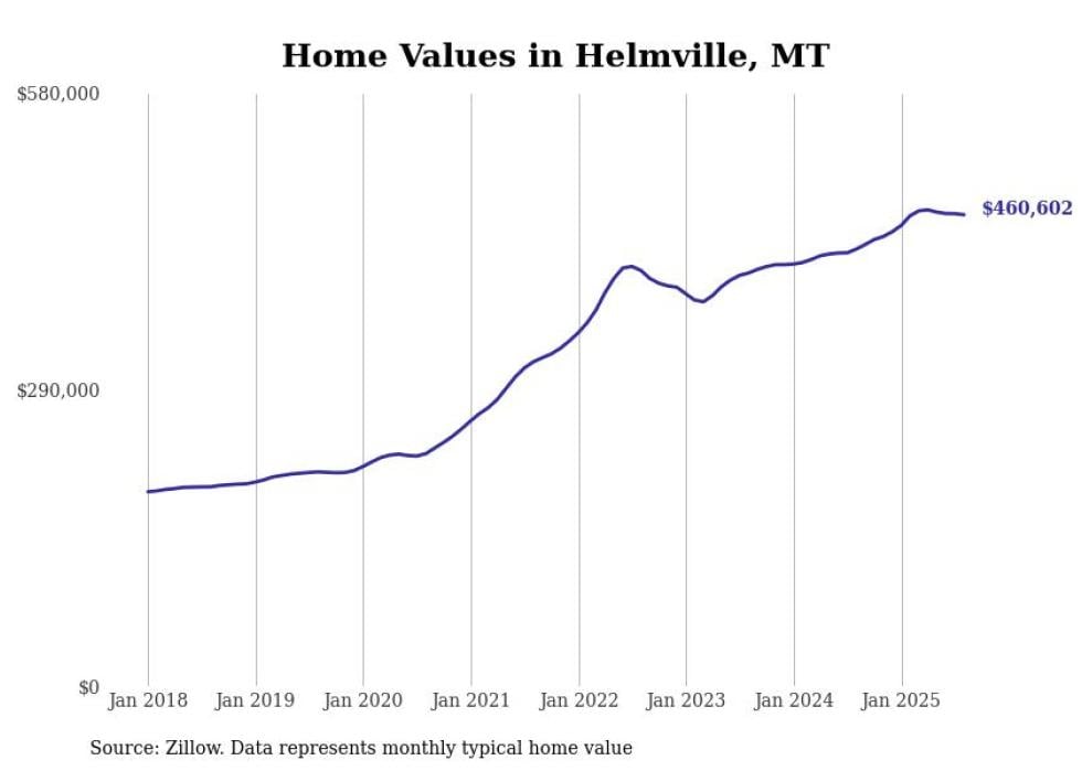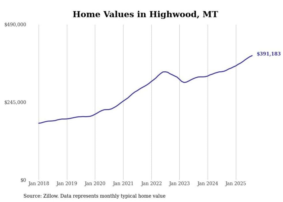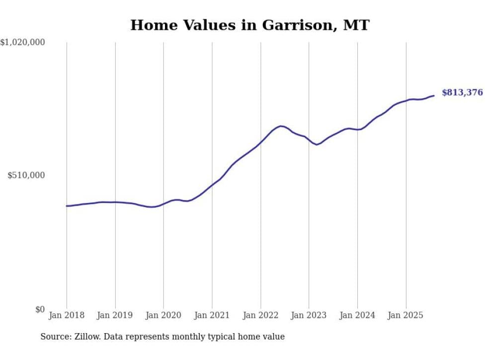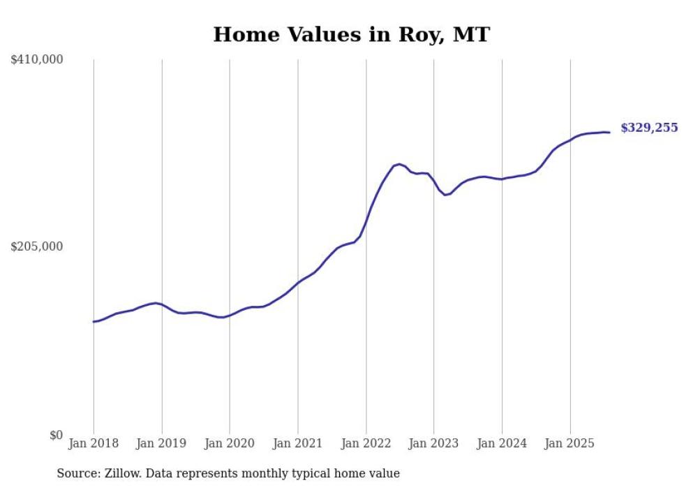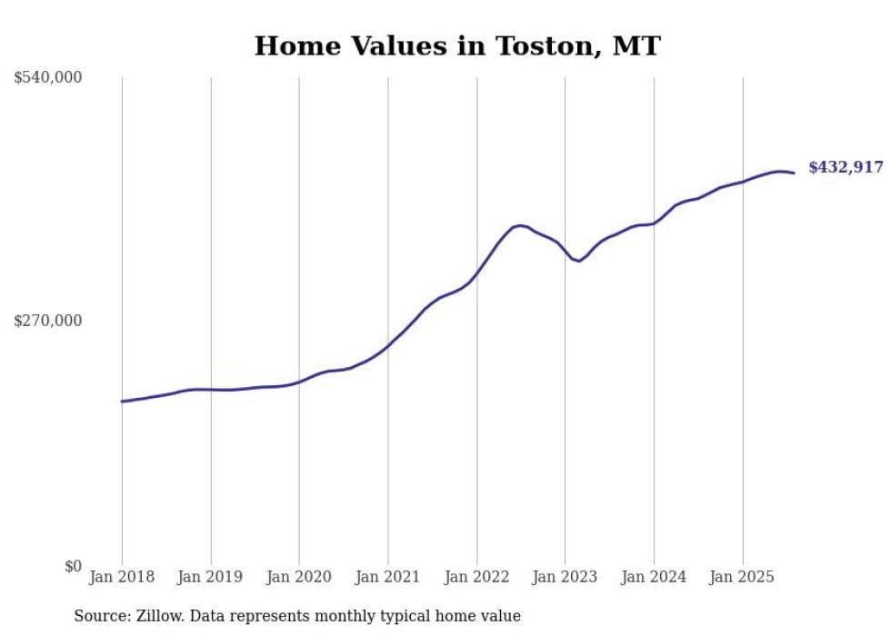 Stacker compiled a list of cities with the fastest-growing home prices in Montana using data from Zillow. Cities are ranked by the dollar change in the Zillow Home Values Index for all homes from the 12 months ending August 2025. The charts in this story were created automatically using Matplotlib. Data was available for 50 cities and towns in Montana.