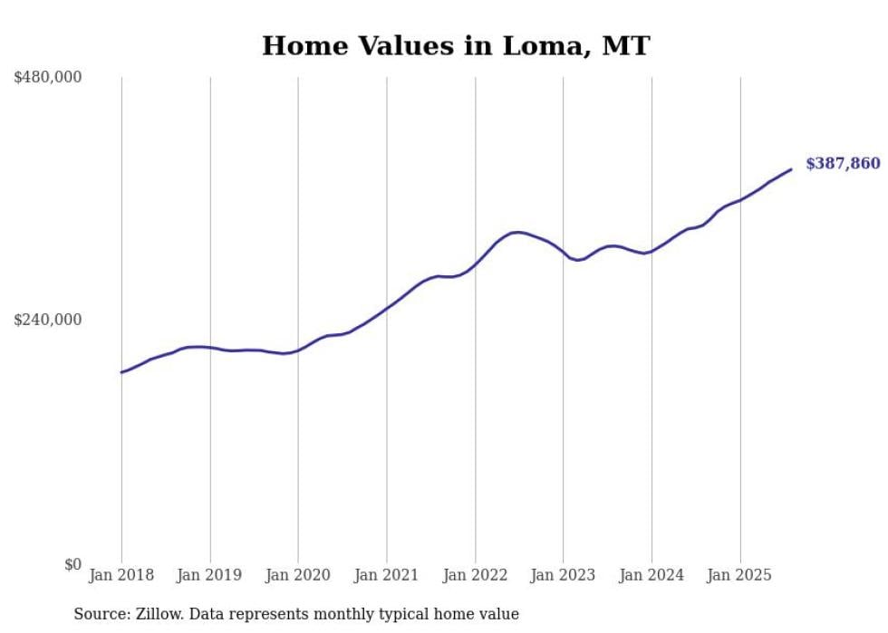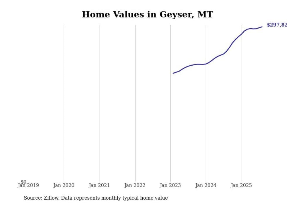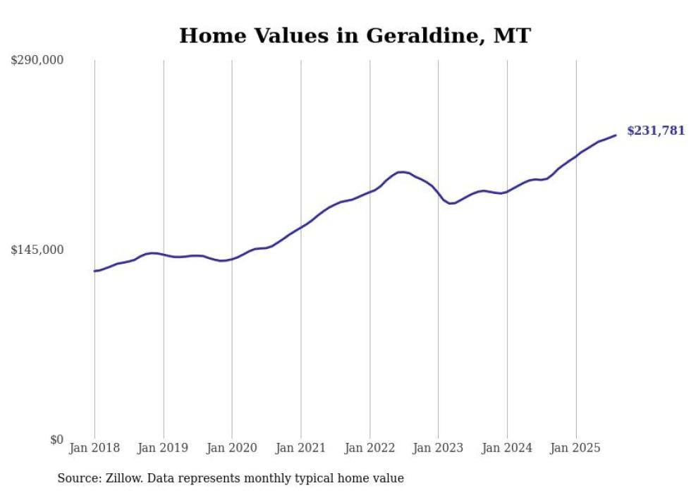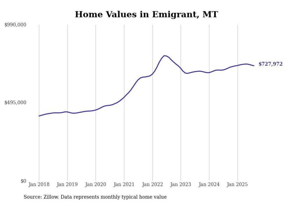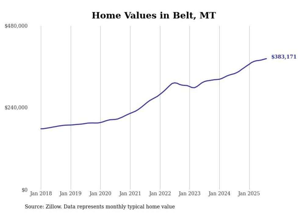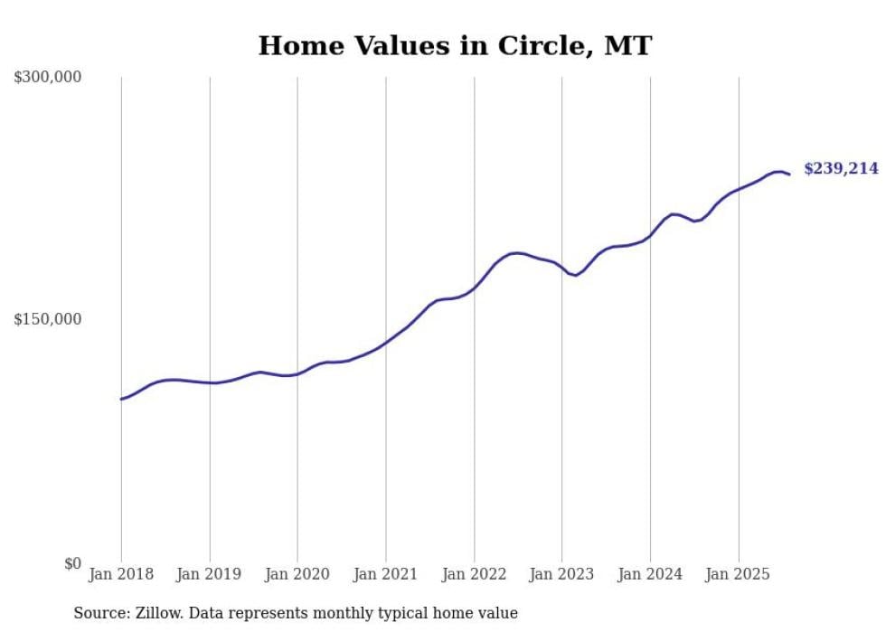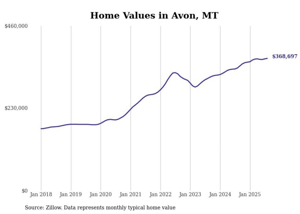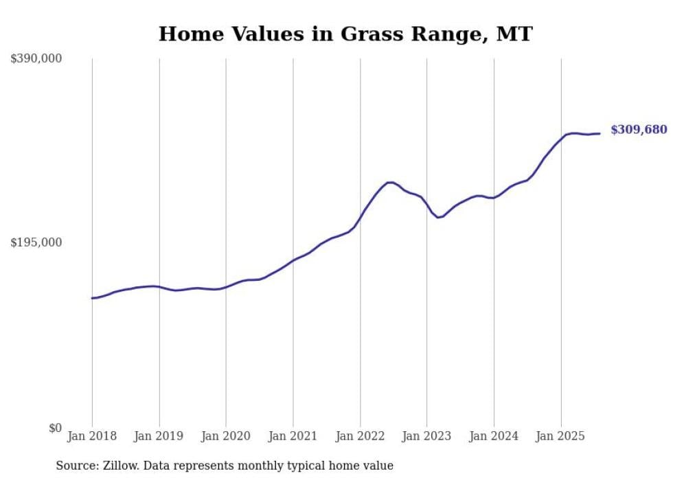 Stacker compiled a list of cities with the fastest-growing home prices in Montana using data from Zillow. Cities are ranked by the dollar change in the Zillow Home Values Index for all homes from the 12 months ending August 2025. The charts in this story were created automatically using Matplotlib. Data was available for 50 cities and towns in Montana.