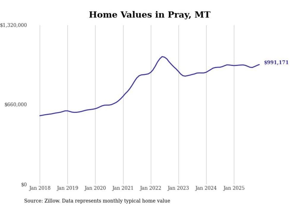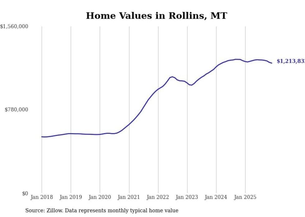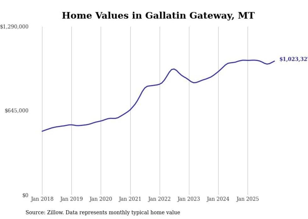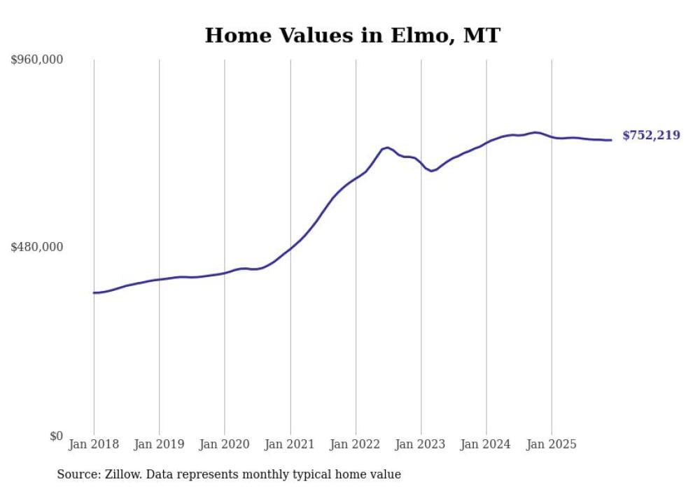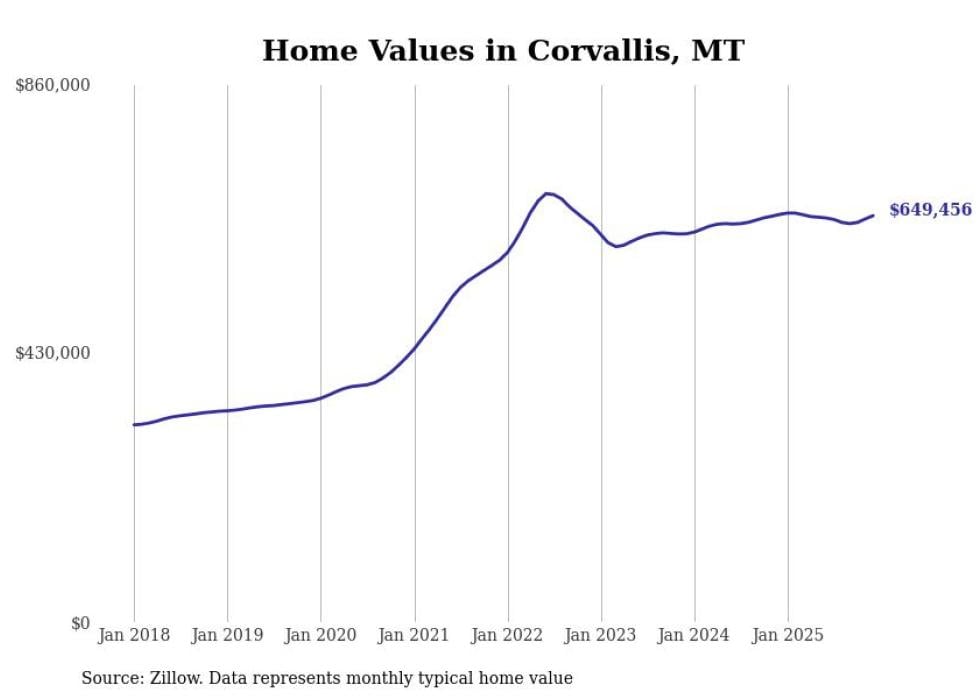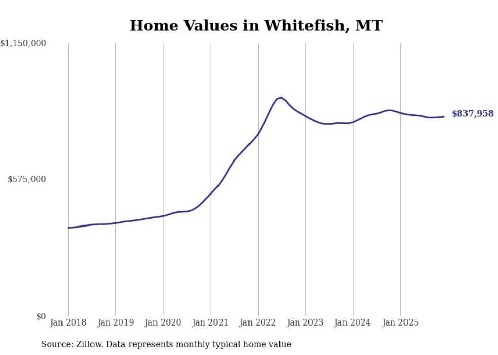 Stacker compiled a list of cities with the most expensive homes in Montana using data from Zillow. Cities are ranked by the Zillow Home Values Index for all homes as of December 2025. The charts in this story were created automatically using Matplotlib.