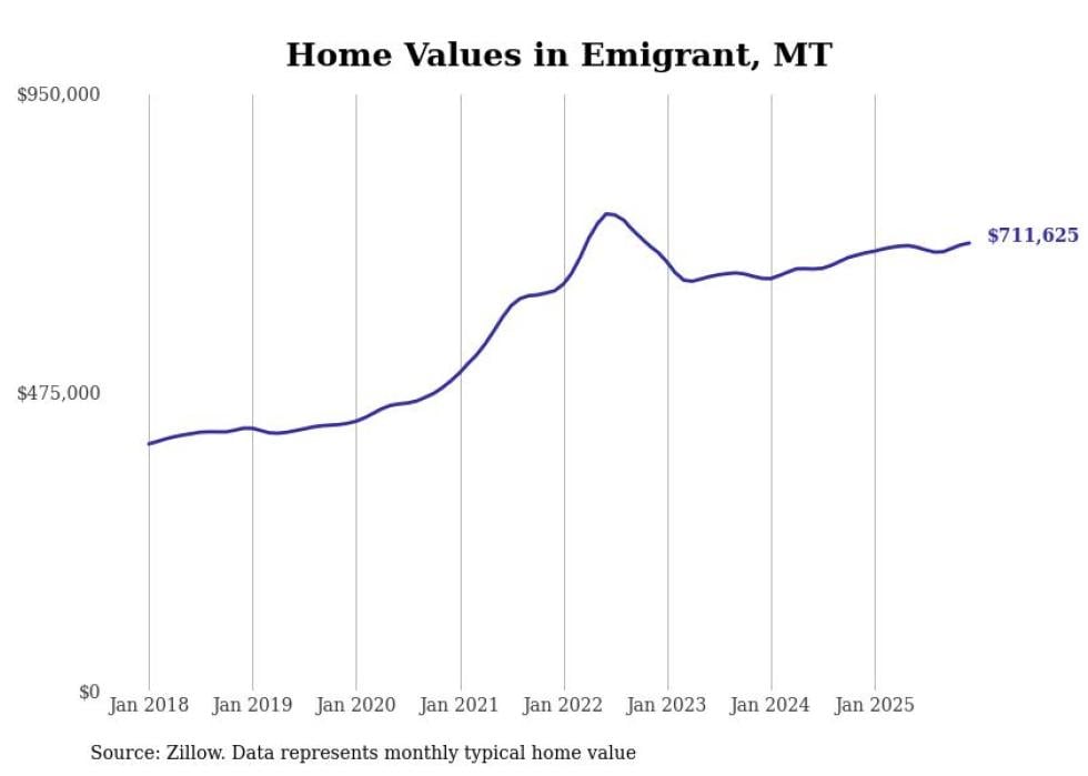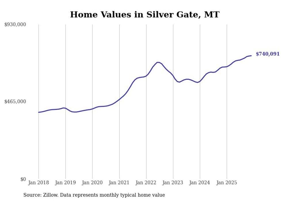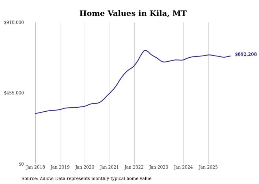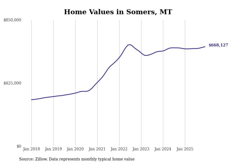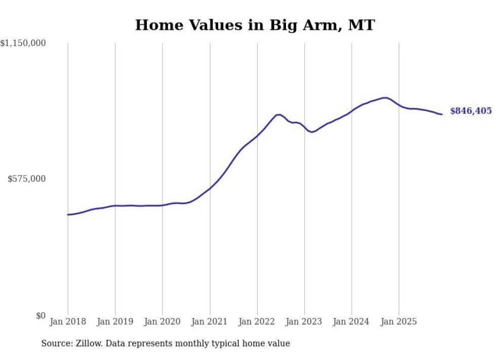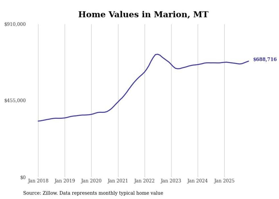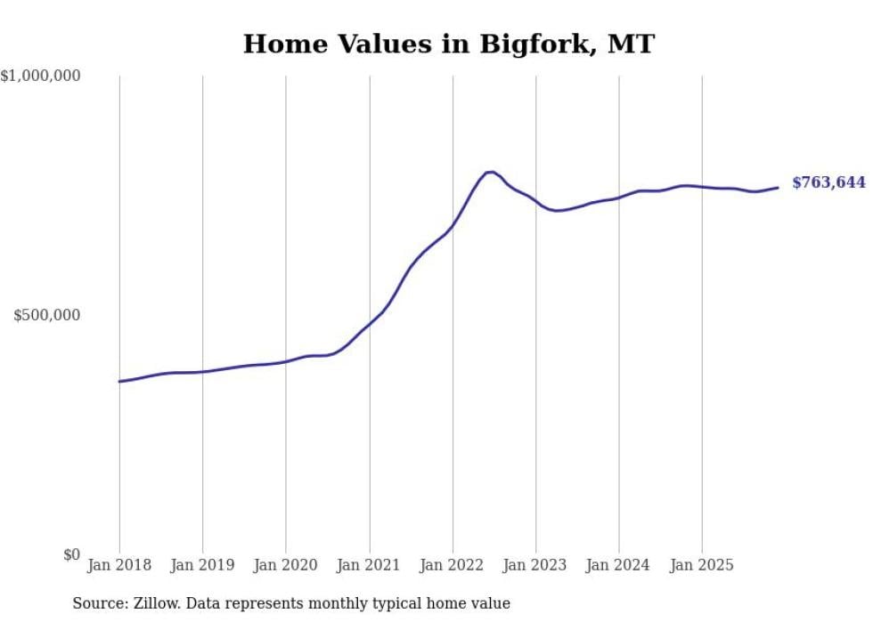 Stacker compiled a list of cities with the most expensive homes in Montana using data from Zillow. Cities are ranked by the Zillow Home Values Index for all homes as of December 2025. The charts in this story were created automatically using Matplotlib.