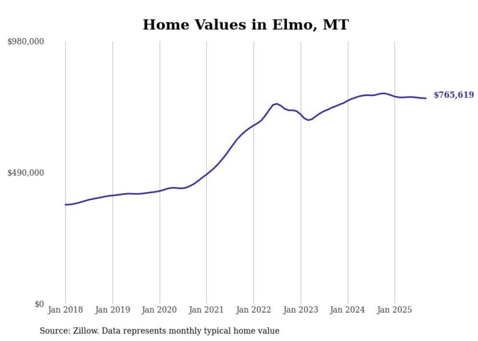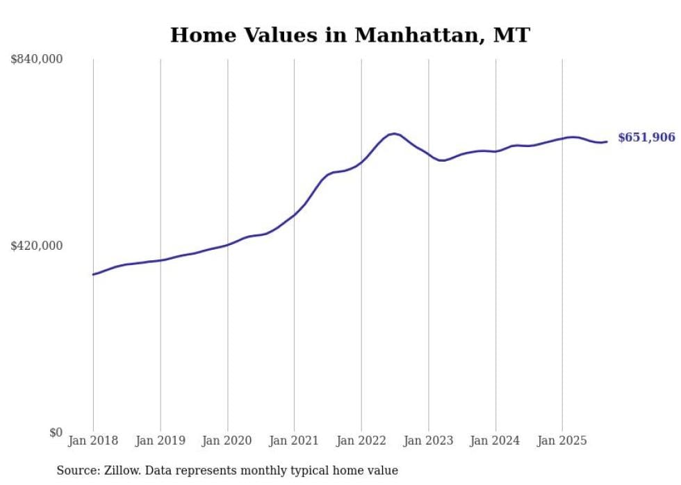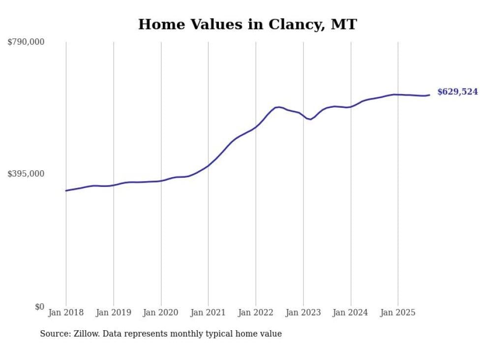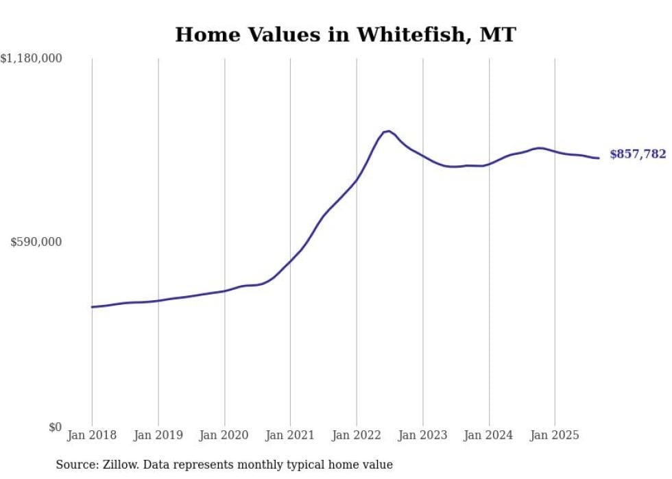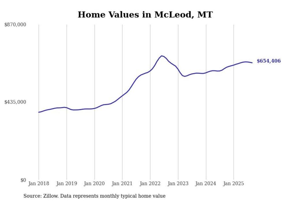 Stacker compiled a list of cities with the most expensive homes in Montana using data from Zillow. Cities are ranked by the Zillow Home Values Index for all homes as of September 2025. The charts in this story were created automatically using Matplotlib.