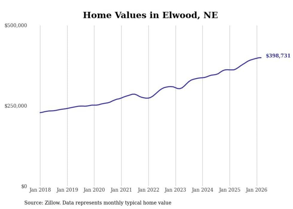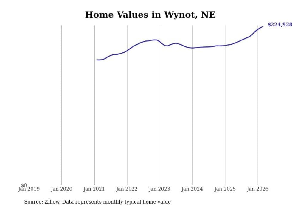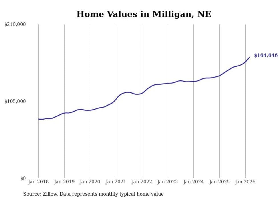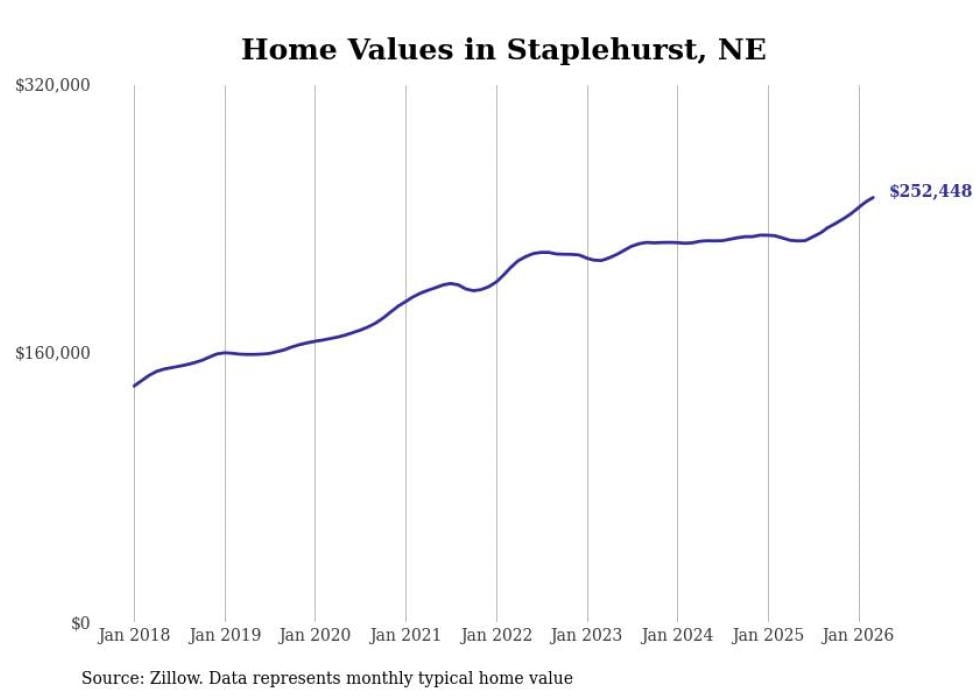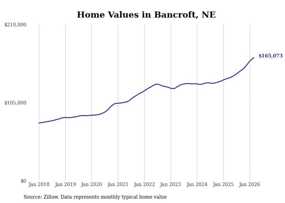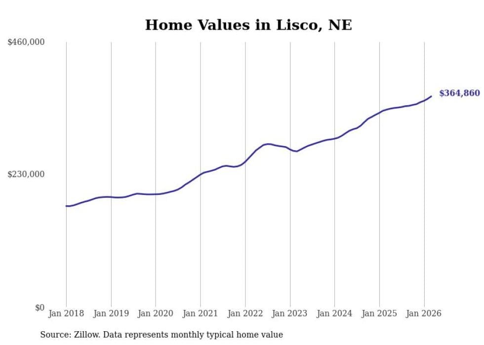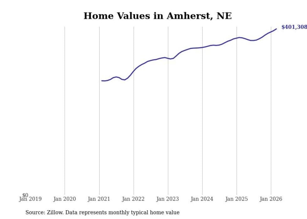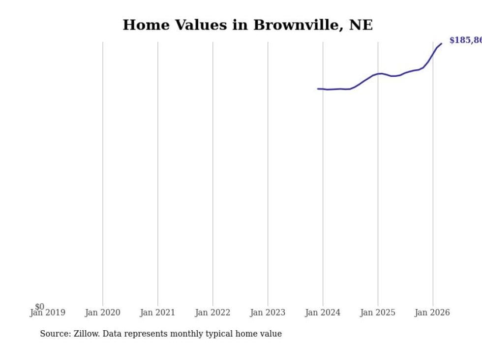 Stacker compiled a list of cities with the fastest-growing home prices in Nebraska using data from Zillow. Cities are ranked by the dollar change in the Zillow Home Values Index for all homes from the 12 months ending March 2026. The charts in this story were created automatically using Matplotlib. Data was available for 50 cities and towns in Nebraska.