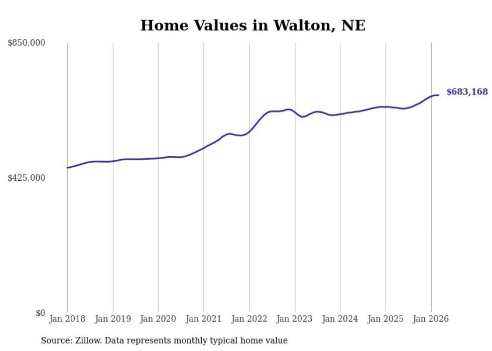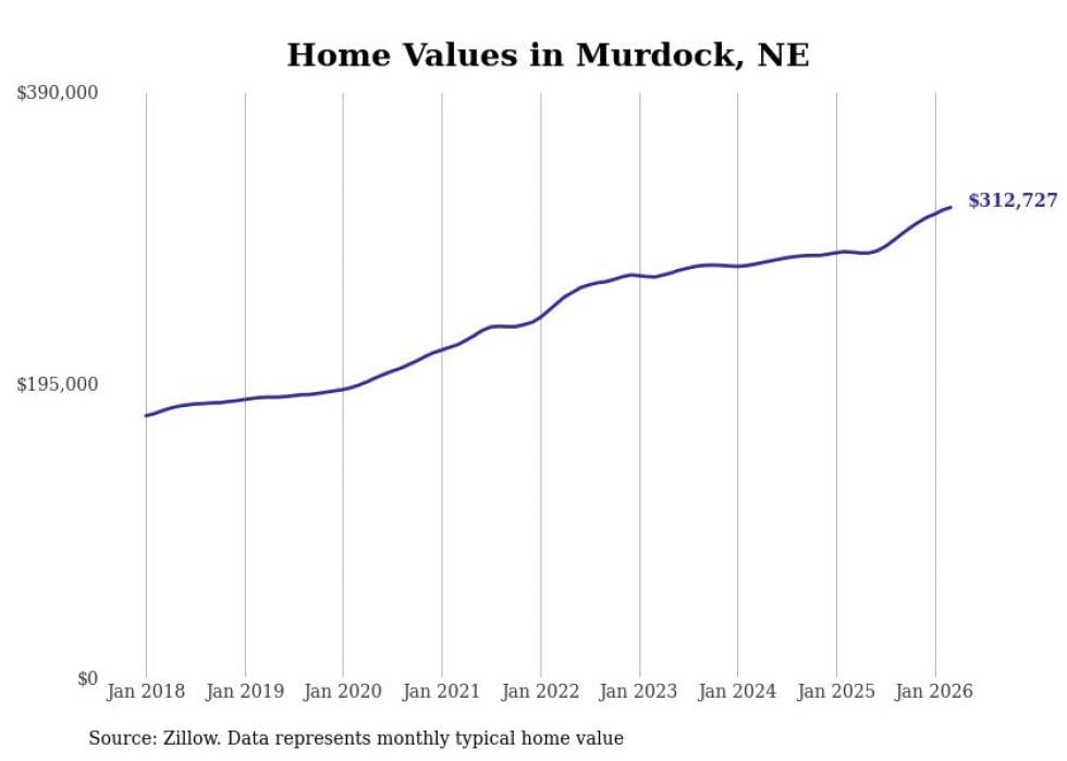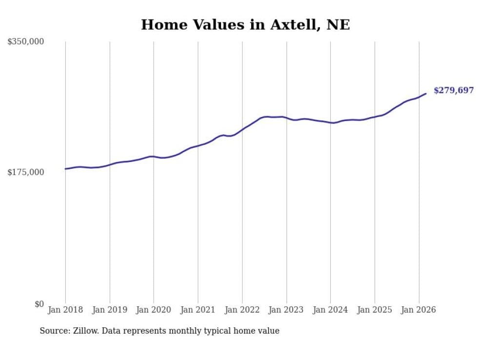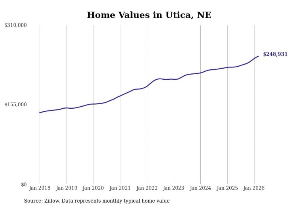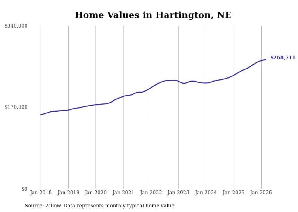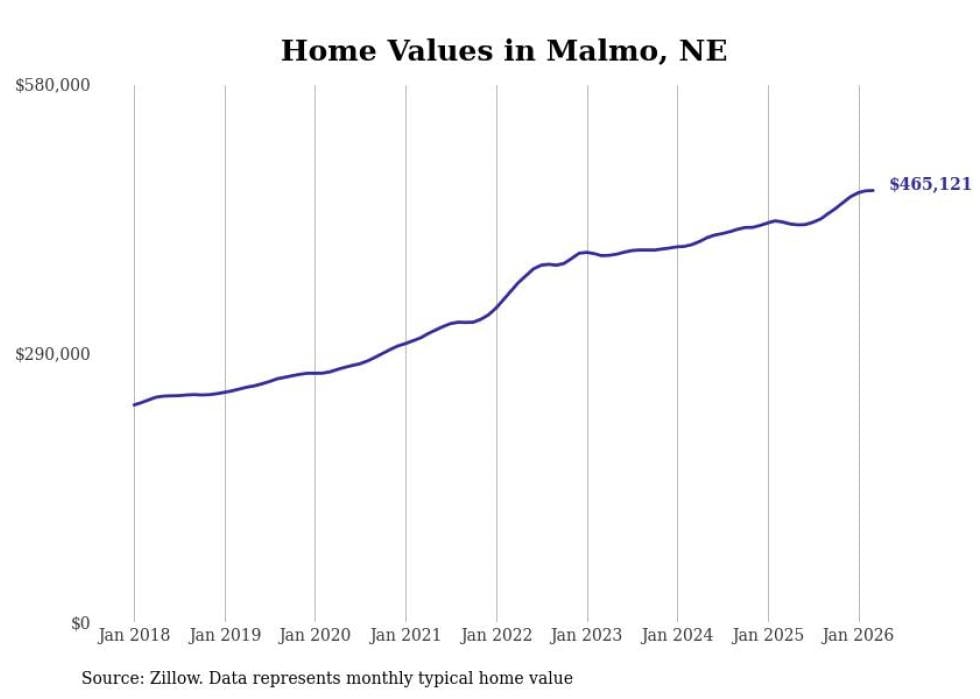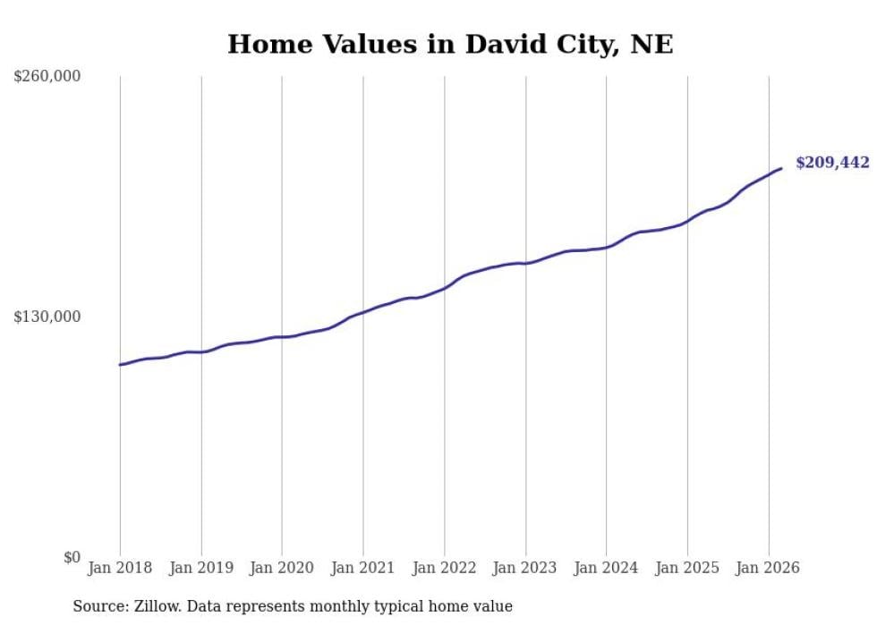 Stacker compiled a list of cities with the fastest-growing home prices in Nebraska using data from Zillow. Cities are ranked by the dollar change in the Zillow Home Values Index for all homes from the 12 months ending March 2026. The charts in this story were created automatically using Matplotlib. Data was available for 50 cities and towns in Nebraska.
