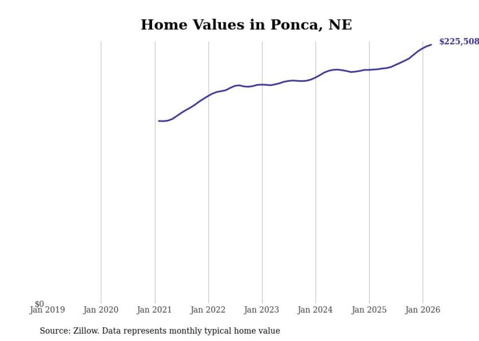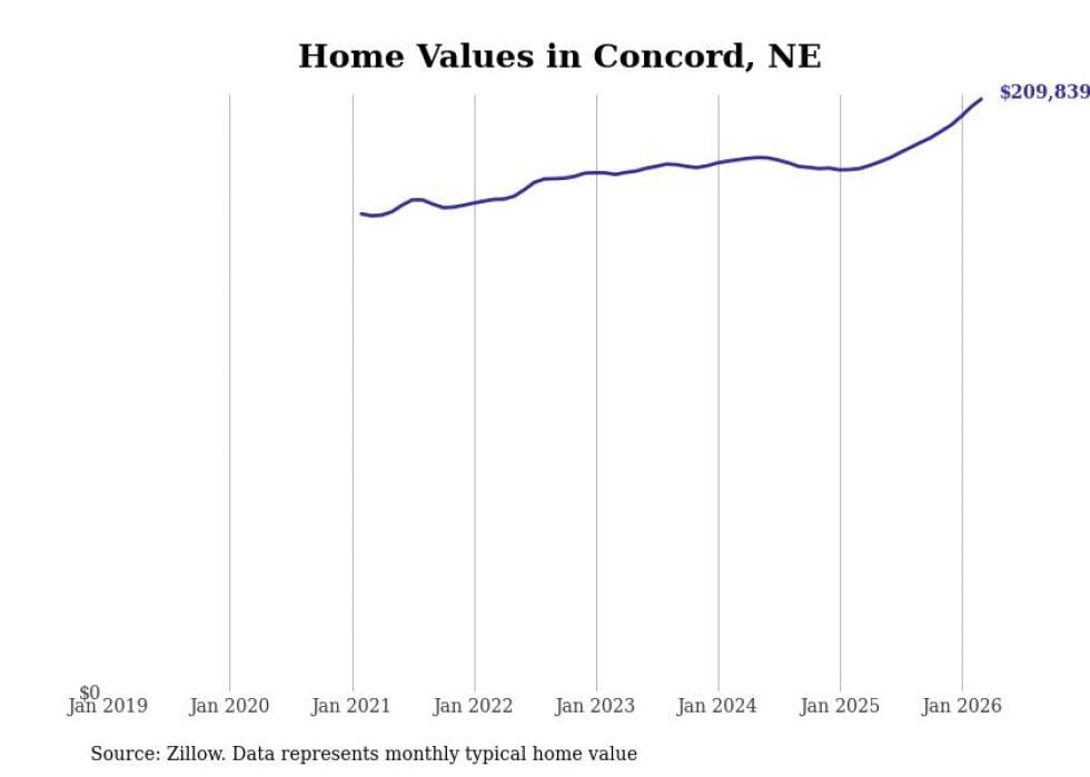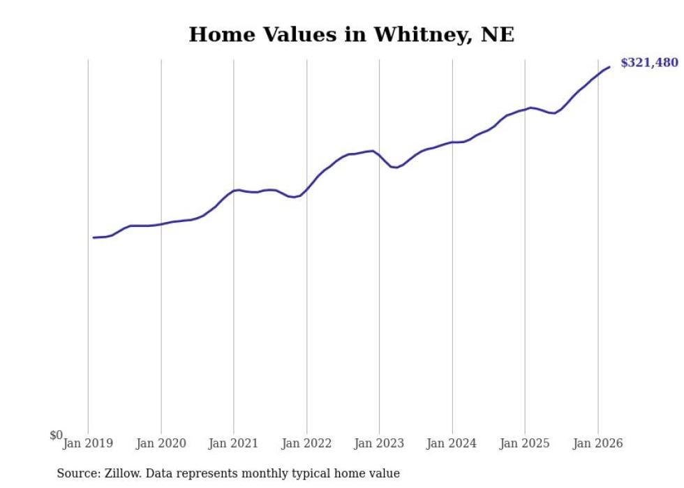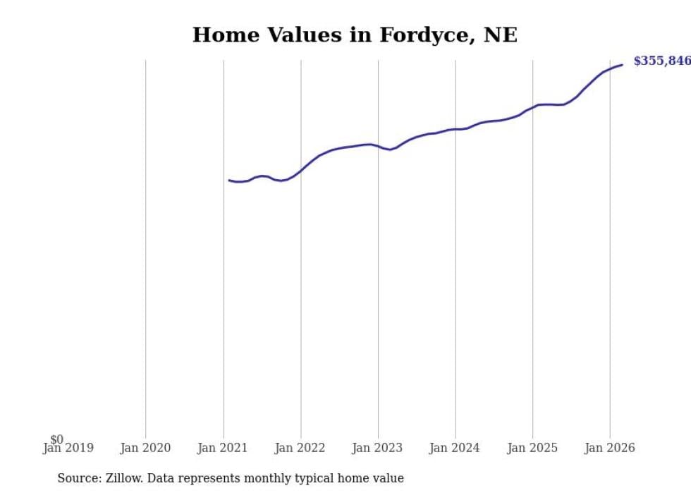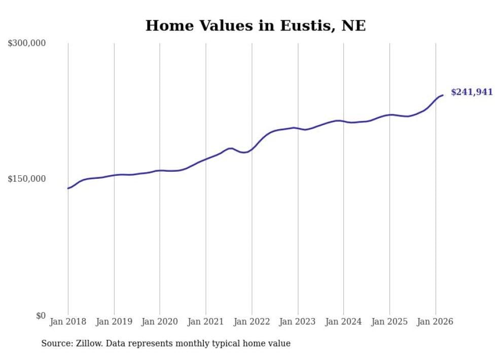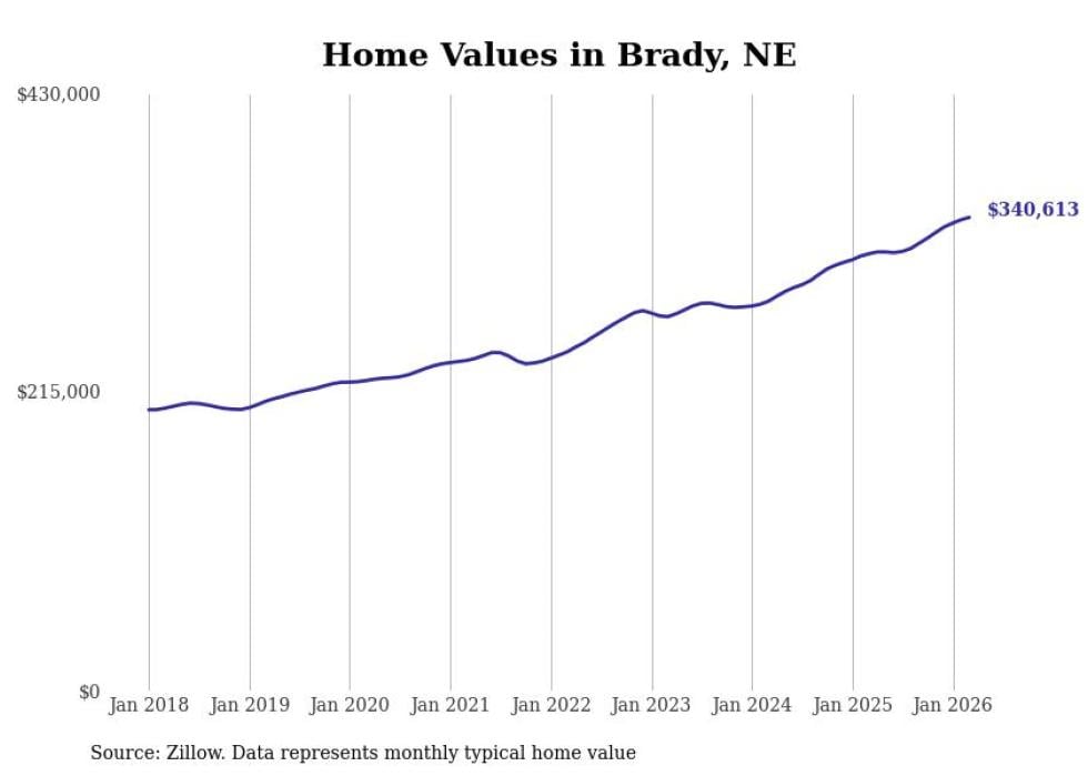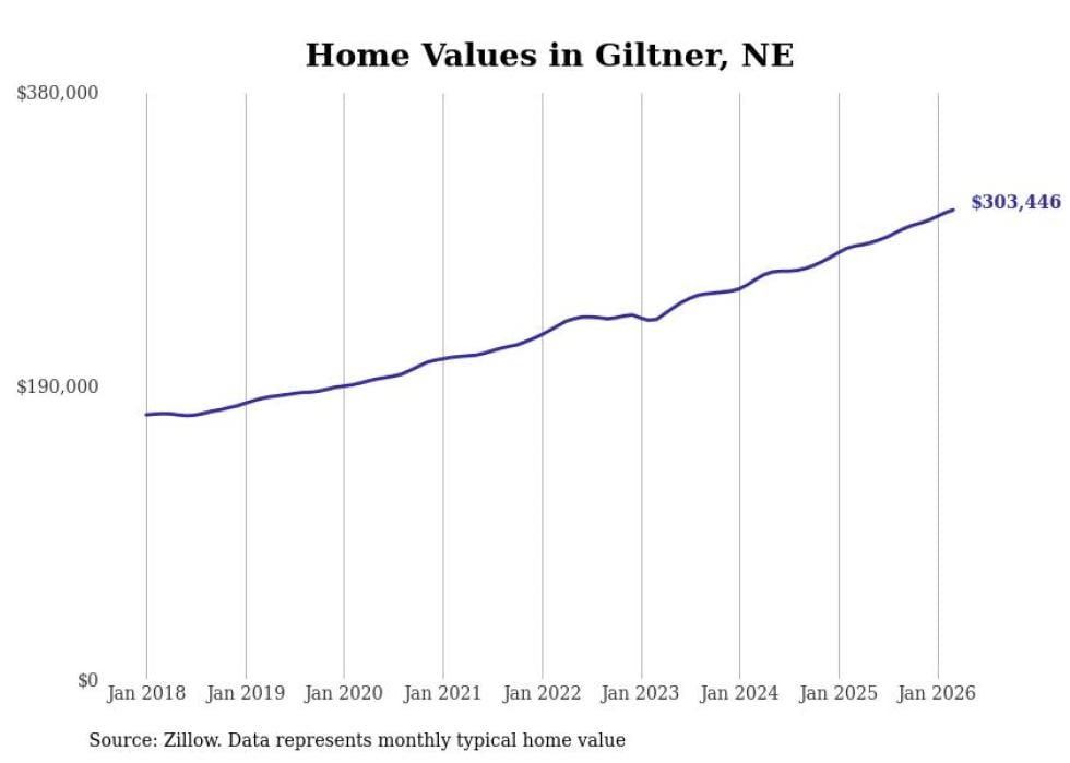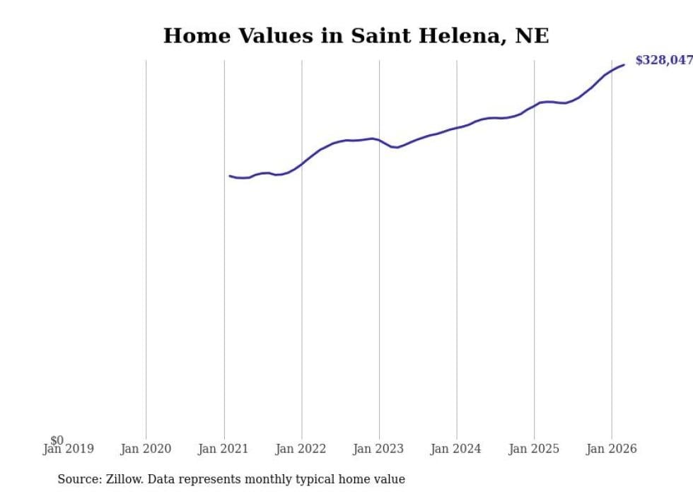 Stacker compiled a list of cities with the fastest-growing home prices in Nebraska using data from Zillow. Cities are ranked by the dollar change in the Zillow Home Values Index for all homes from the 12 months ending March 2026. The charts in this story were created automatically using Matplotlib. Data was available for 50 cities and towns in Nebraska.