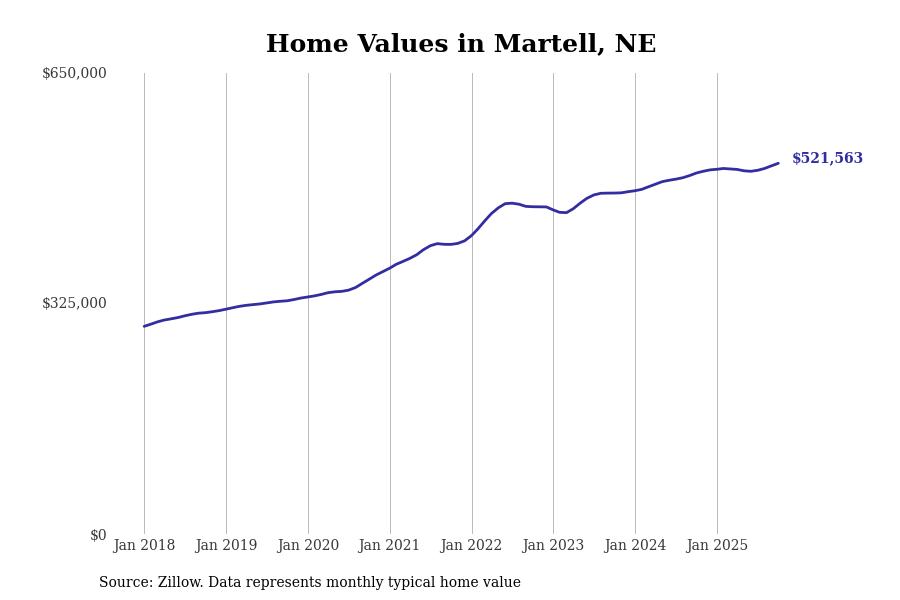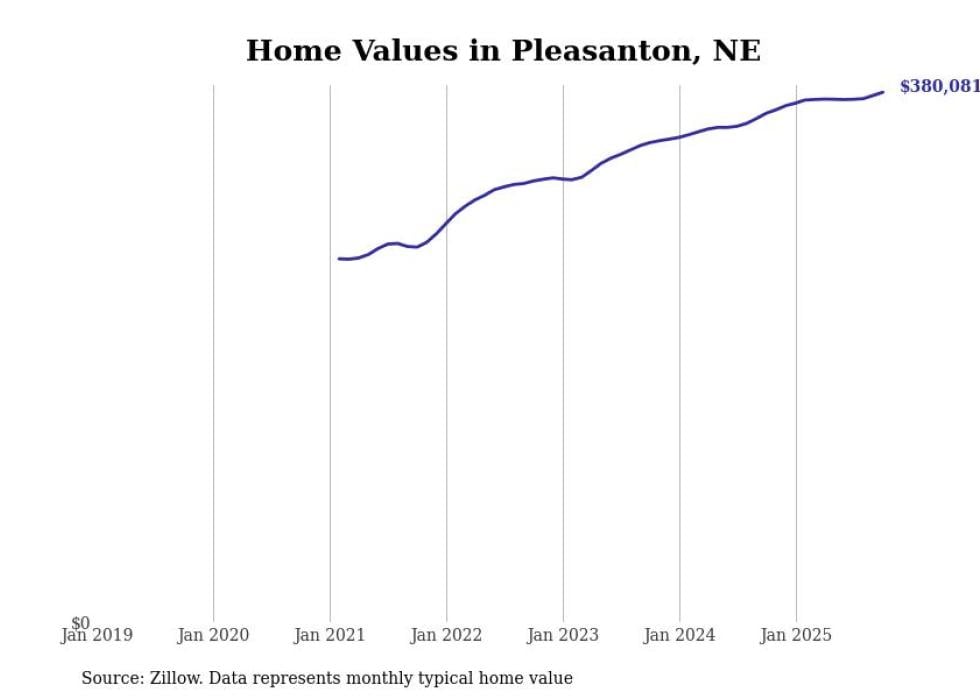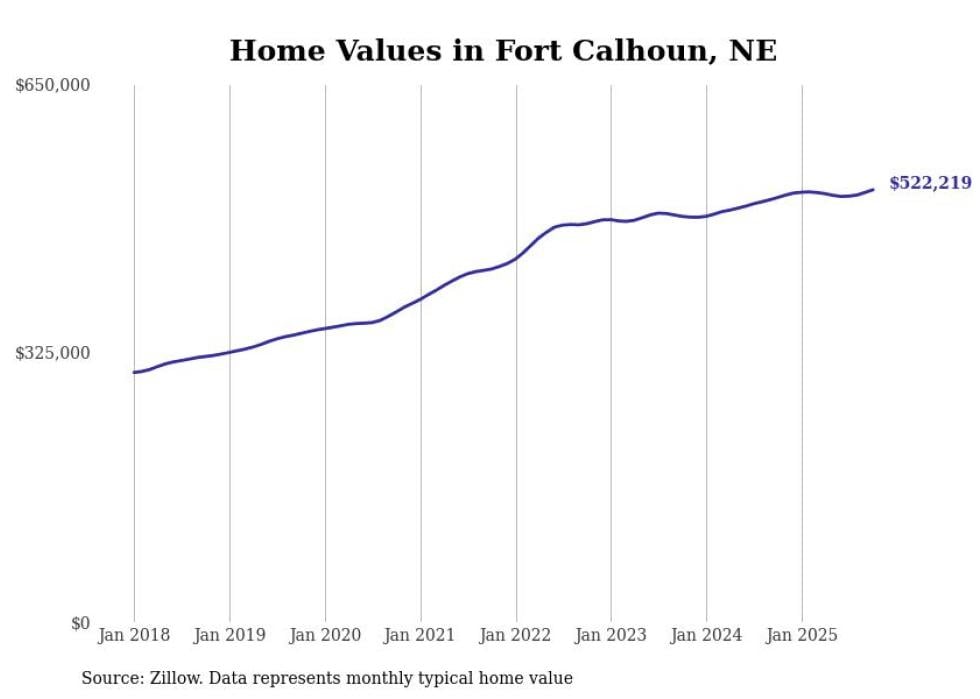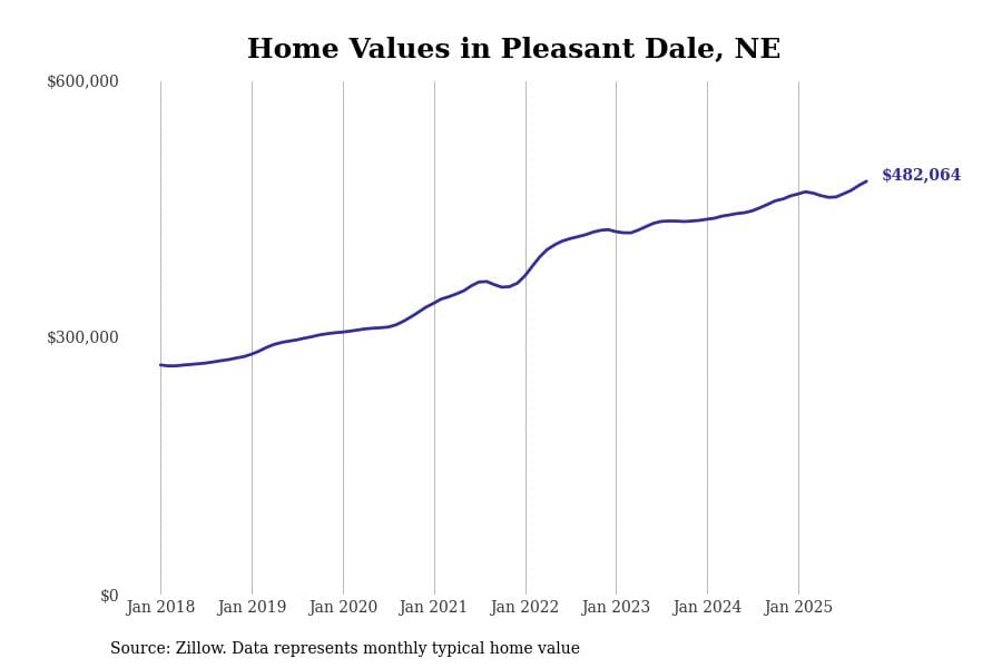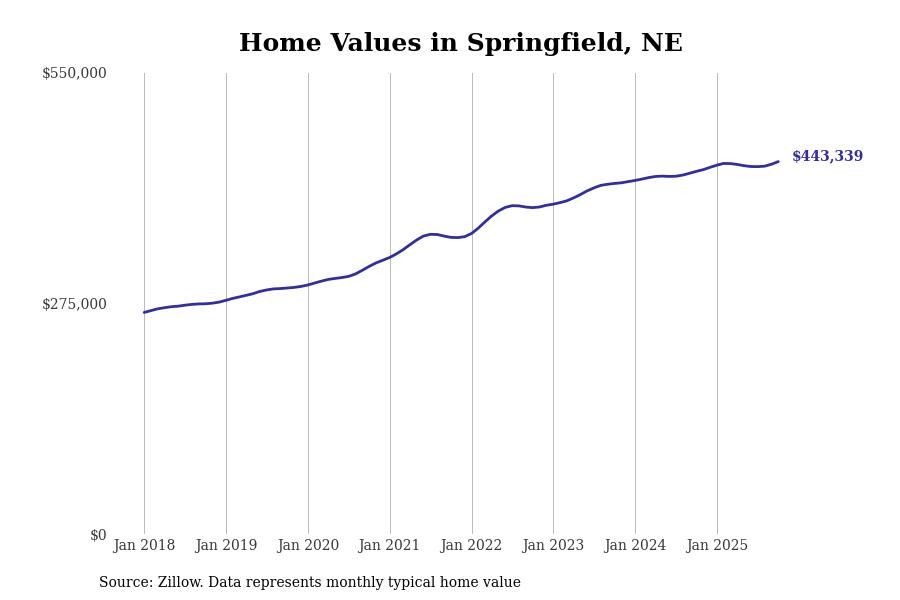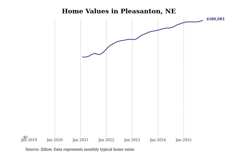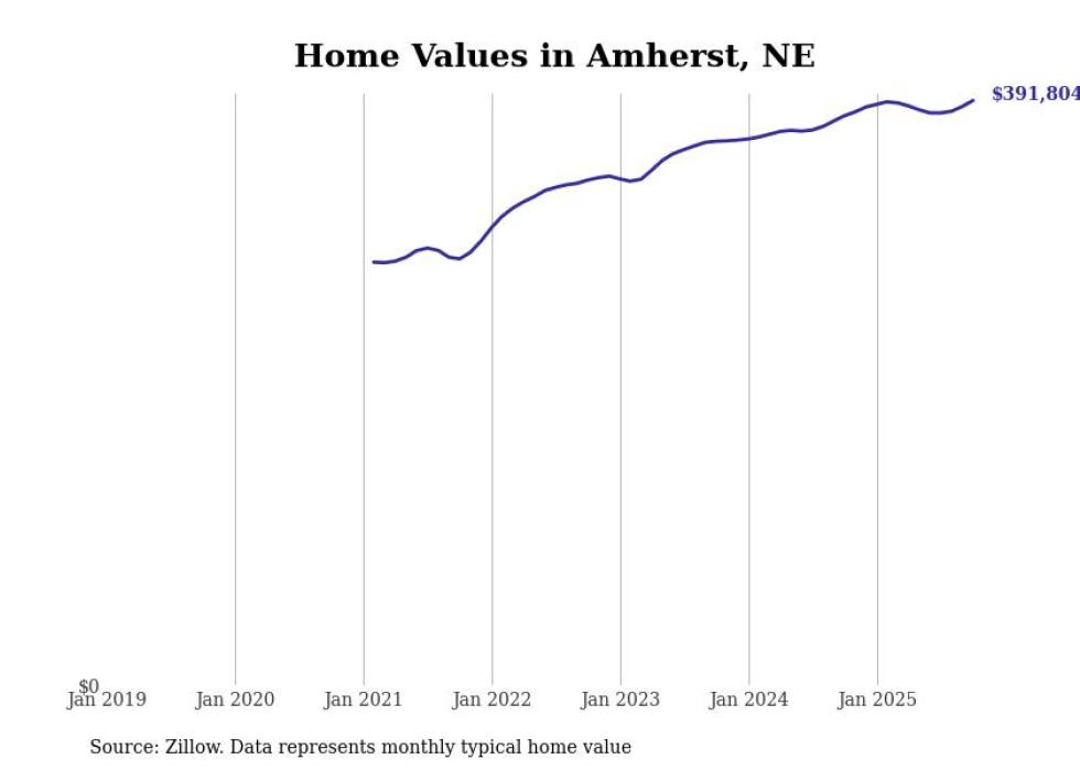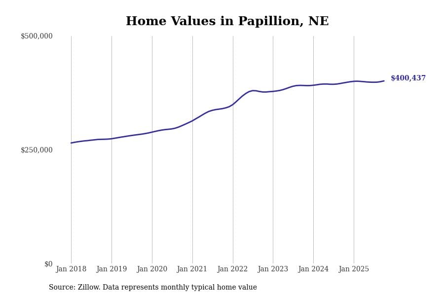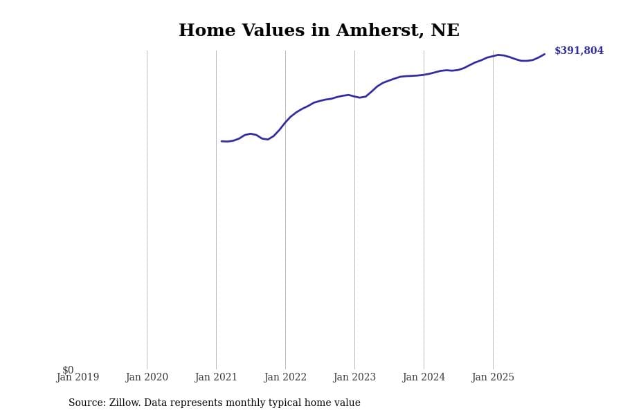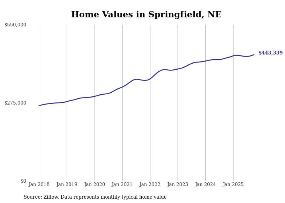 Stacker compiled a list of cities with the most expensive homes in Nebraska using data from Zillow. Cities are ranked by the Zillow Home Values Index for all homes as of October 2025. The charts in this story were created automatically using Matplotlib.