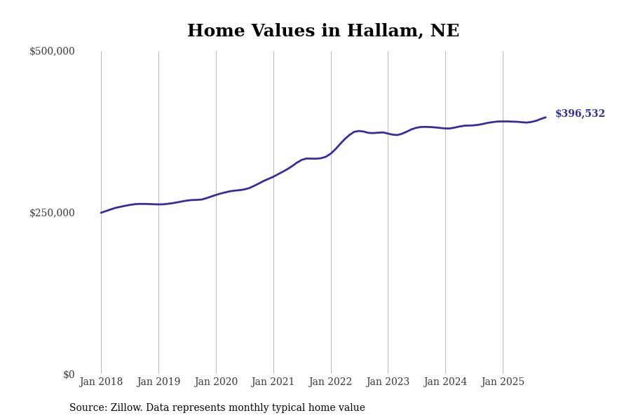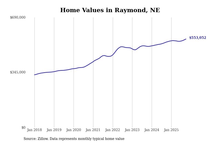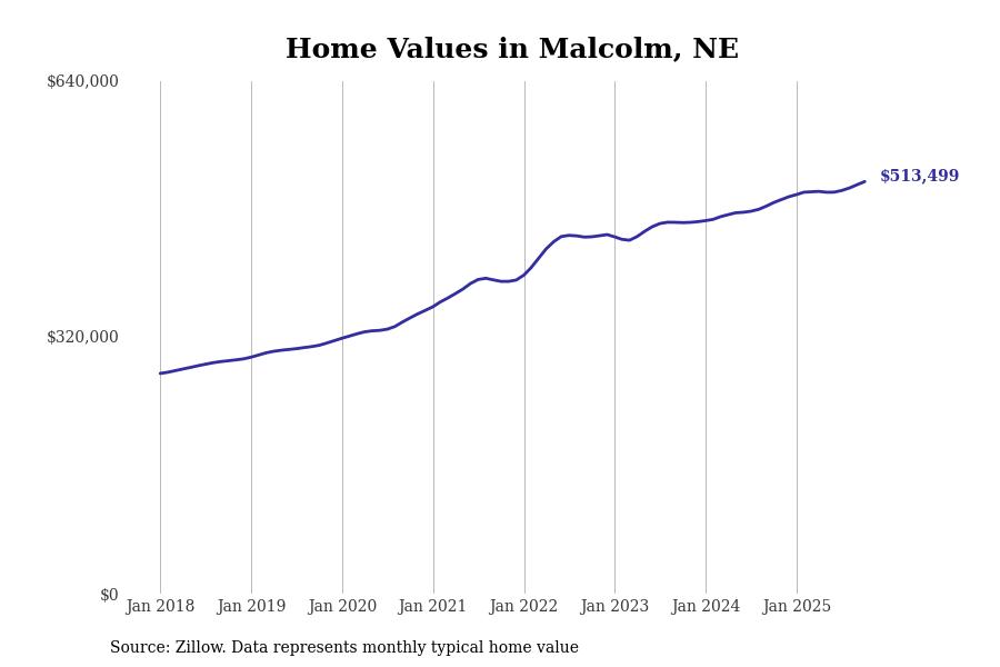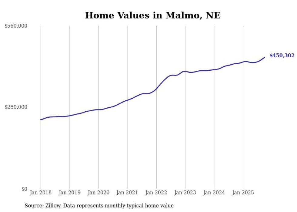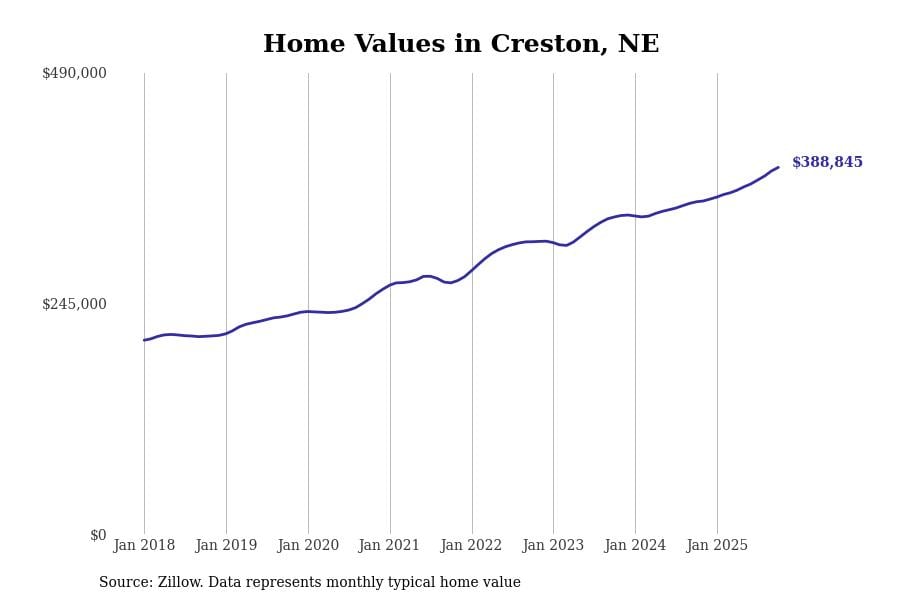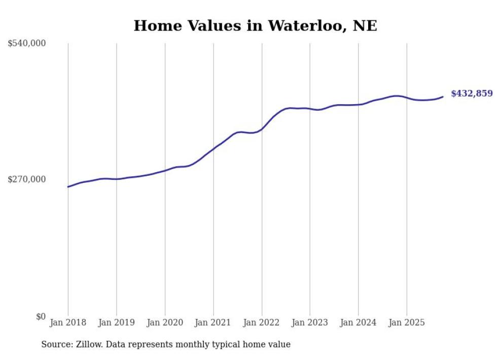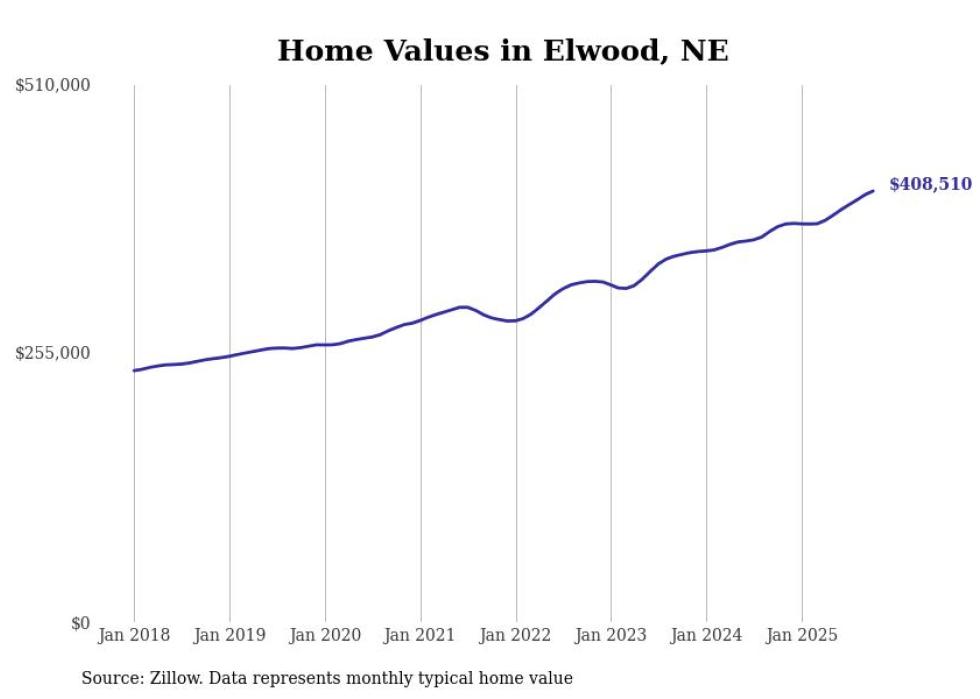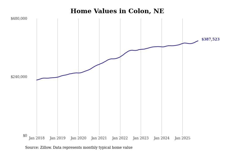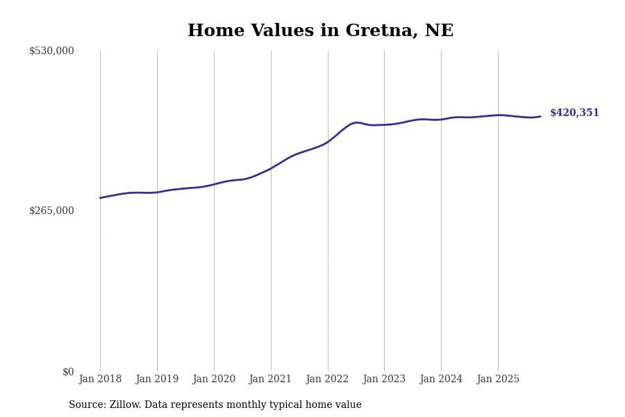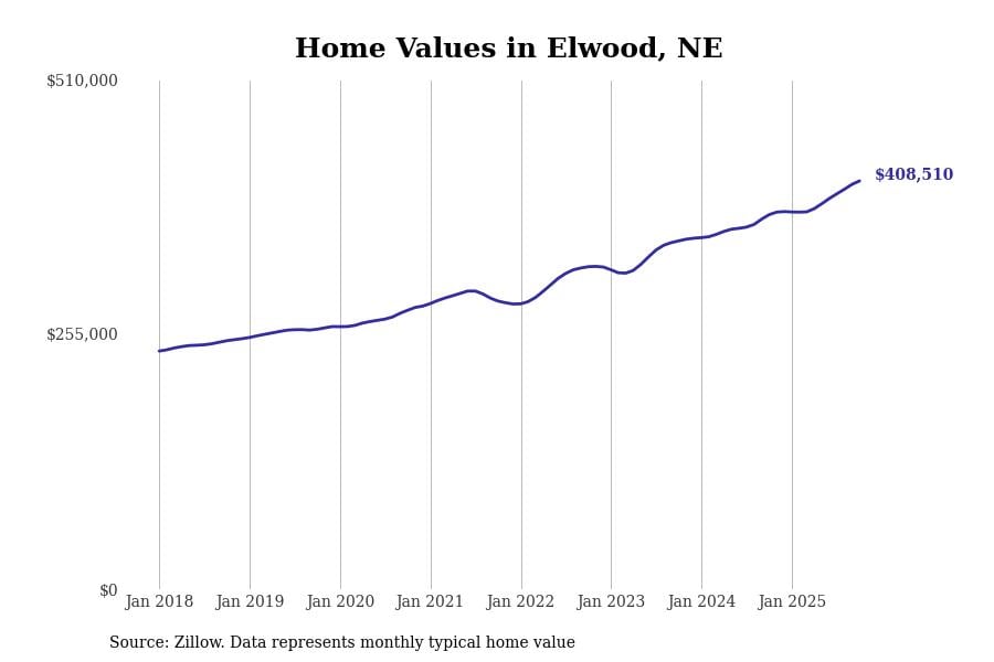 Stacker compiled a list of cities with the most expensive homes in Nebraska using data from Zillow. Cities are ranked by the Zillow Home Values Index for all homes as of October 2025. The charts in this story were created automatically using Matplotlib.