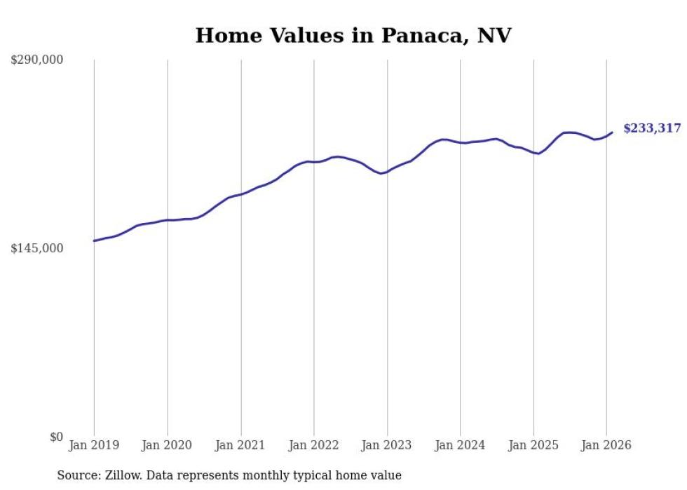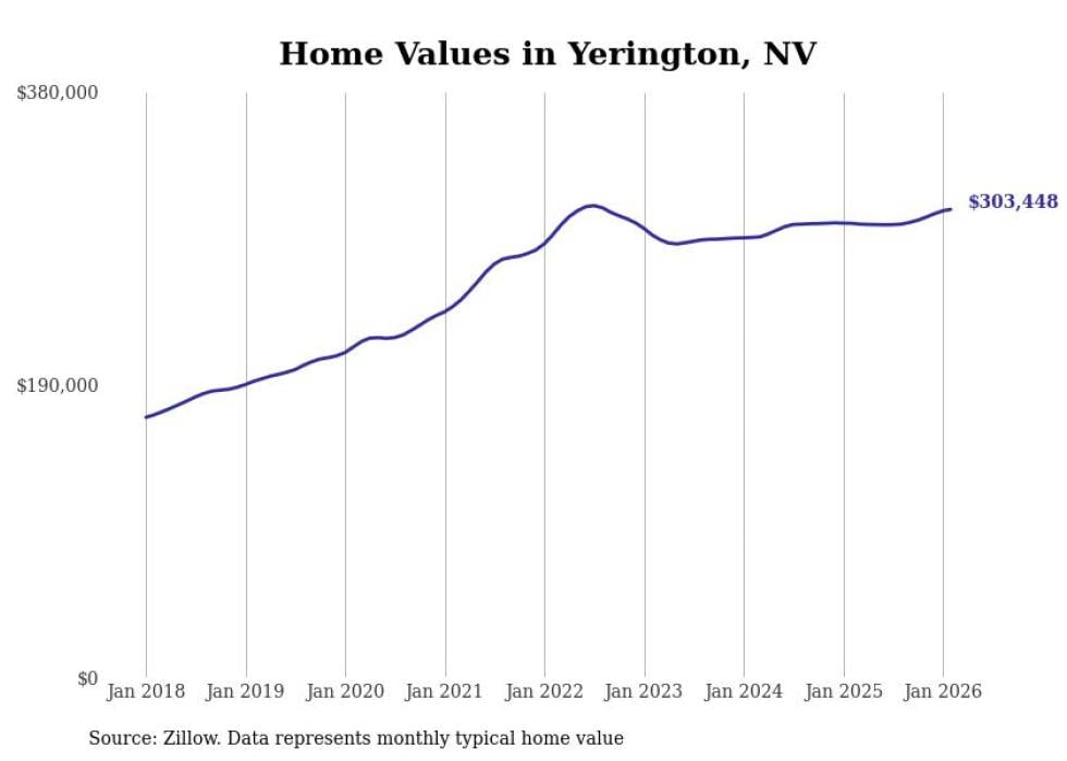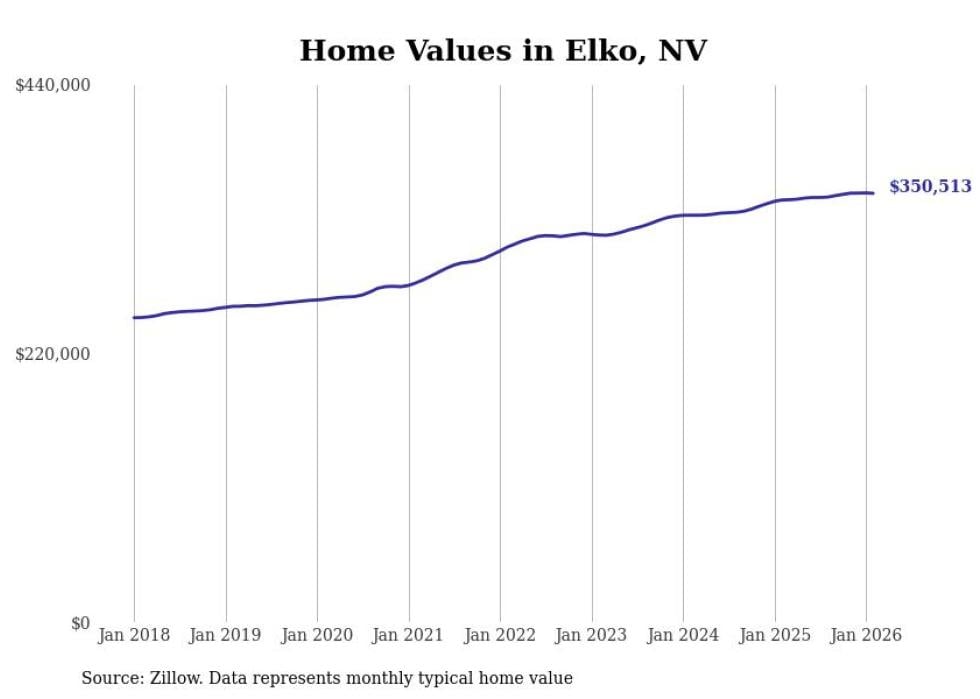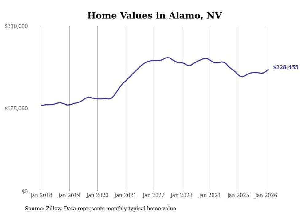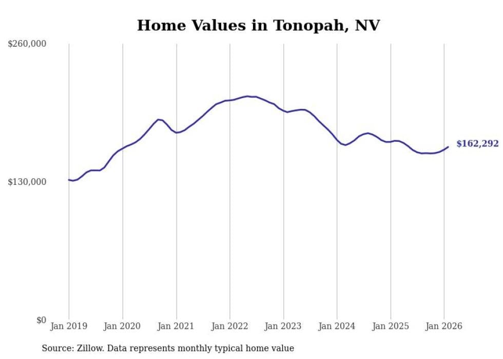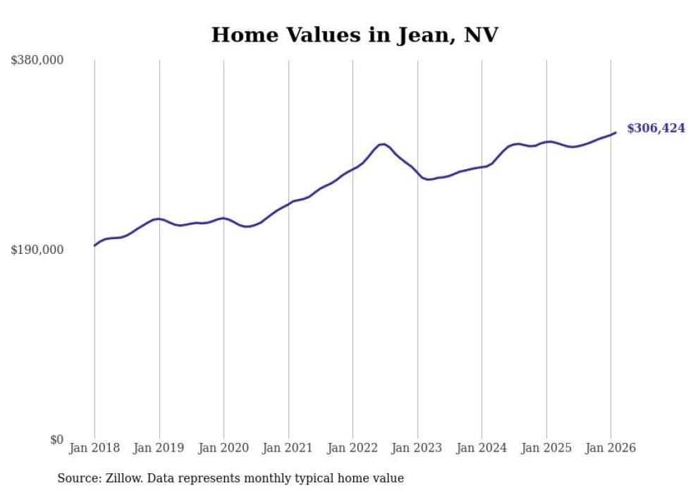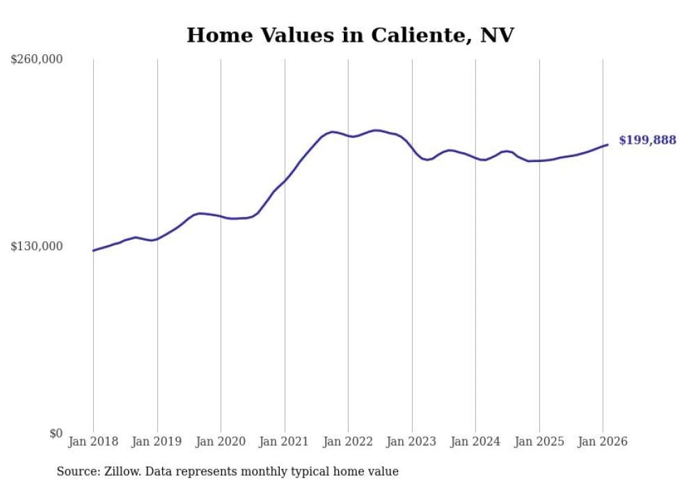 Stacker compiled a list of cities with the fastest-growing home prices in Nevada using data from Zillow. Cities are ranked by the dollar change in the Zillow Home Values Index for all homes from the 12 months ending February 2026. The charts in this story were created automatically using Matplotlib. Data was available for 50 cities and towns in Nevada.