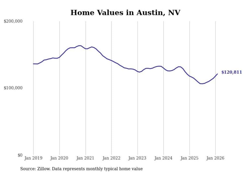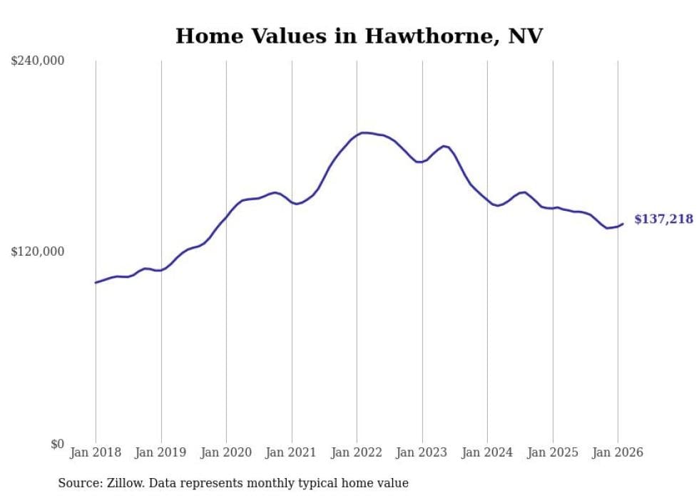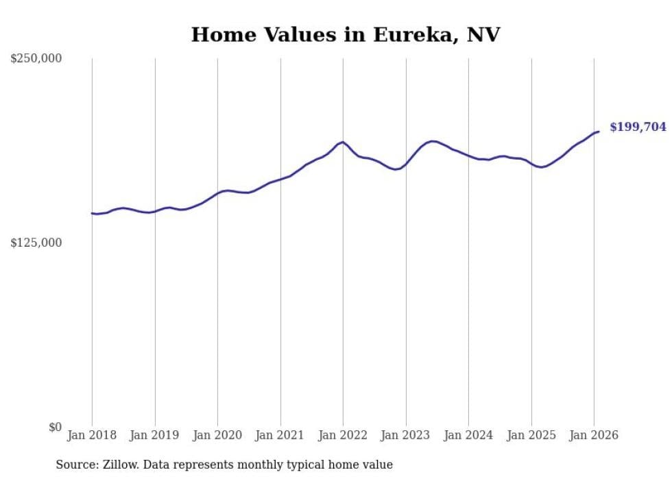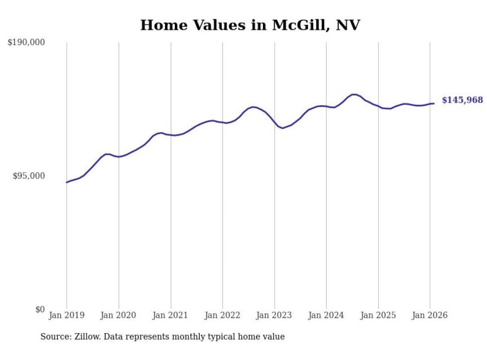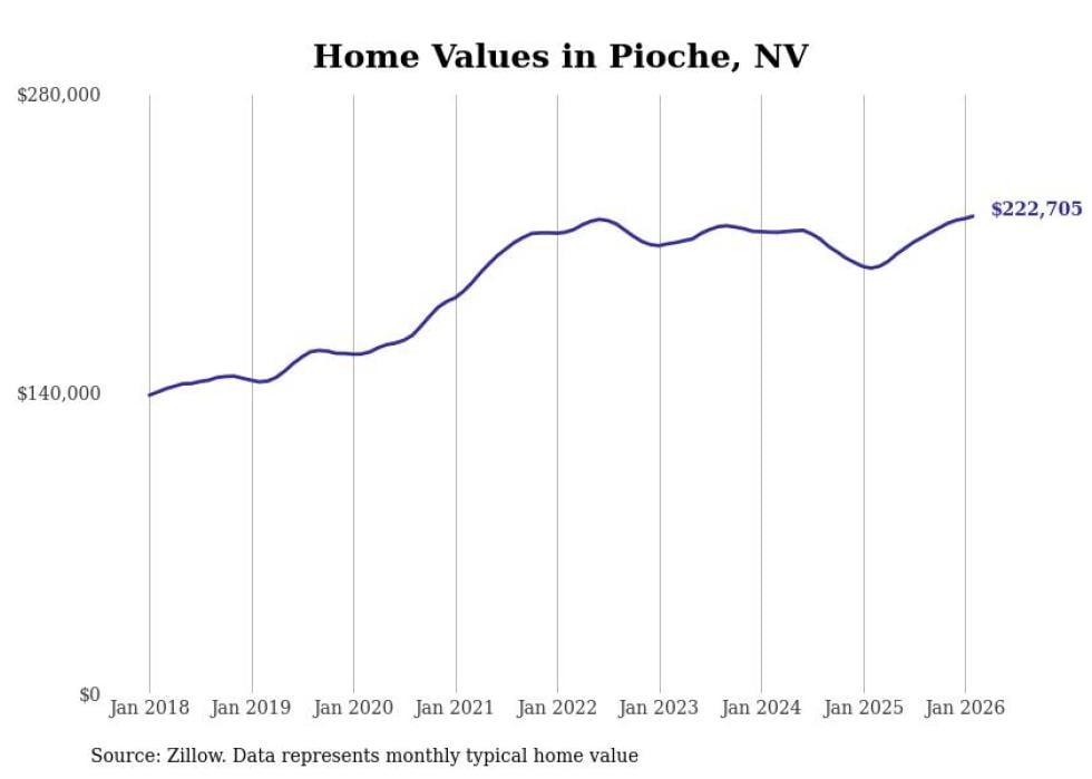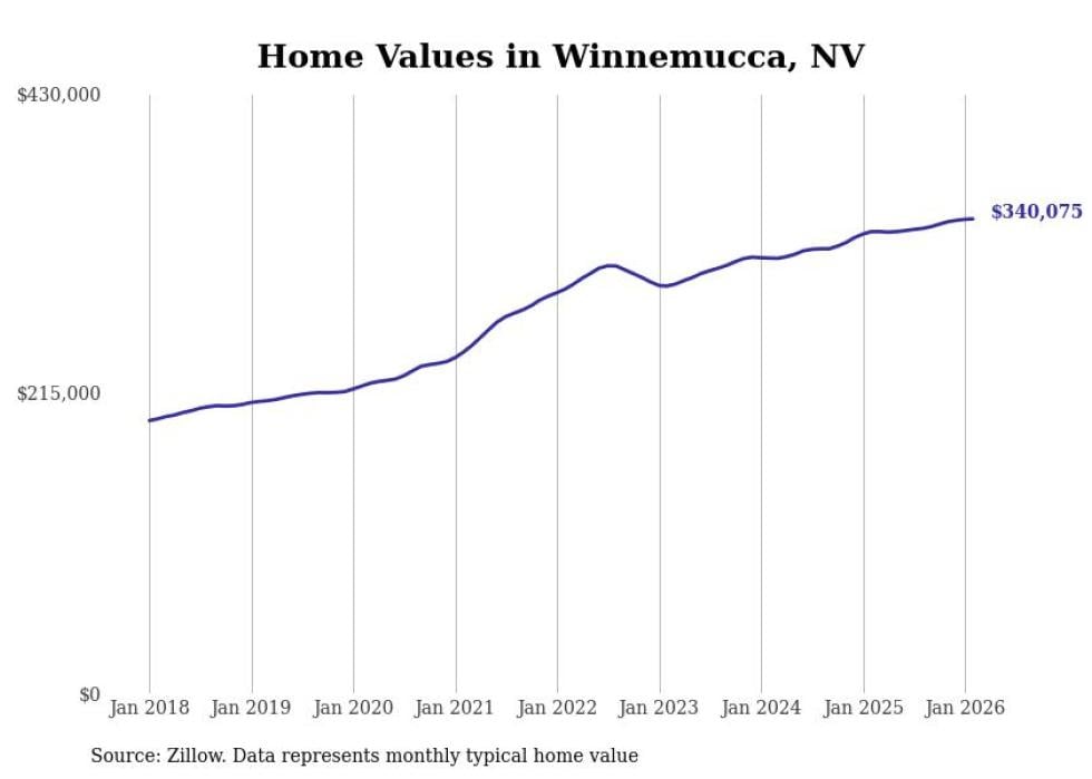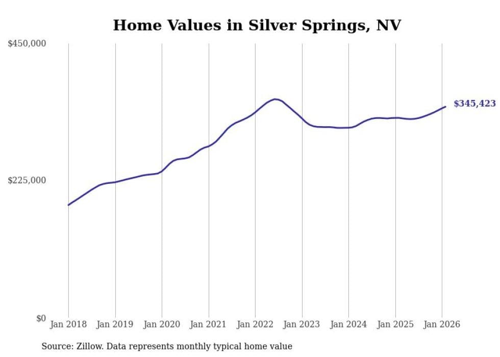 Stacker compiled a list of cities with the fastest-growing home prices in Nevada using data from Zillow. Cities are ranked by the dollar change in the Zillow Home Values Index for all homes from the 12 months ending February 2026. The charts in this story were created automatically using Matplotlib. Data was available for 50 cities and towns in Nevada.