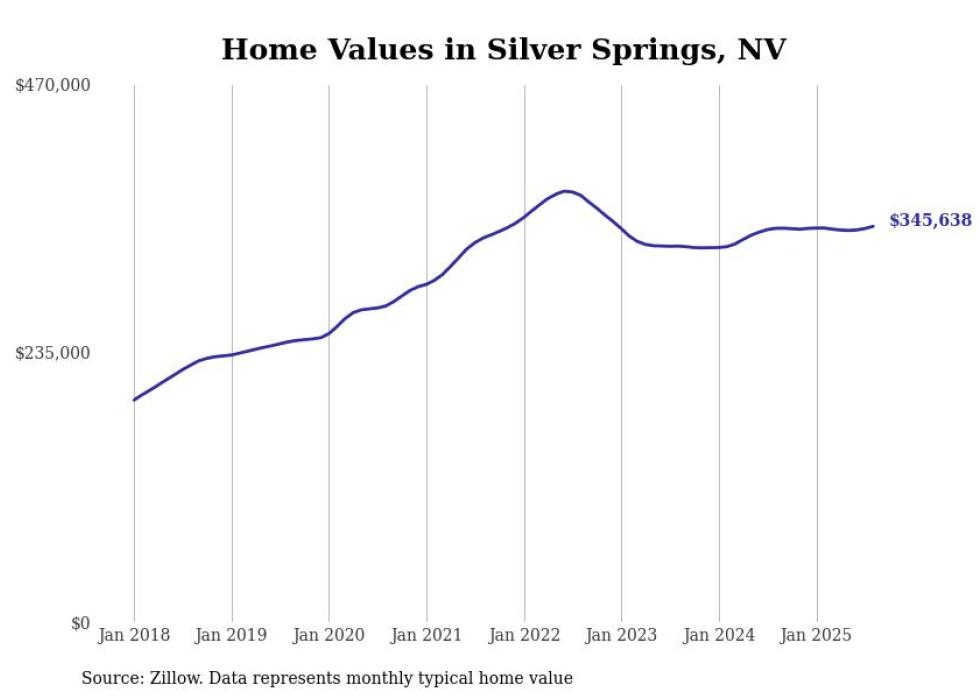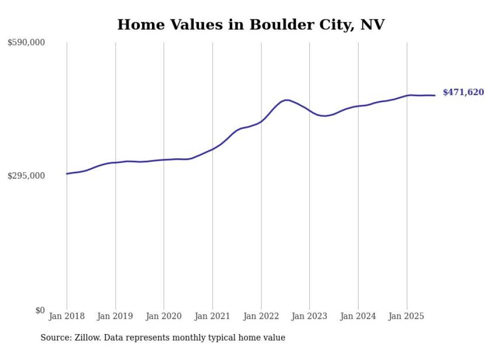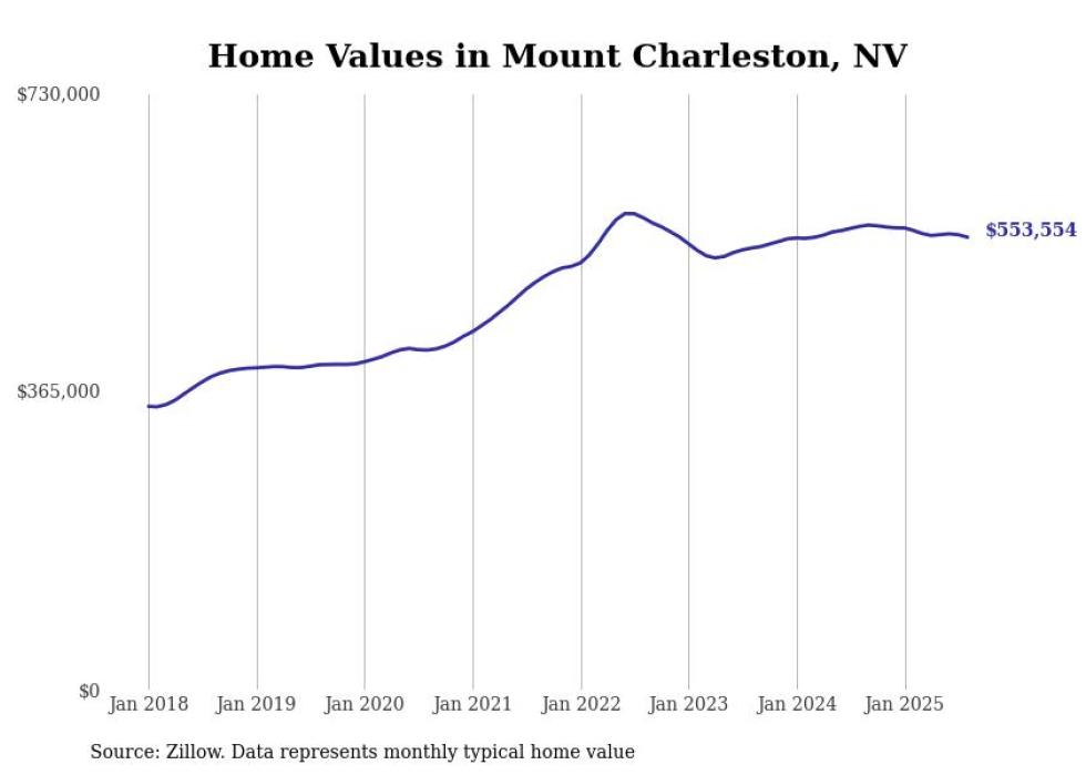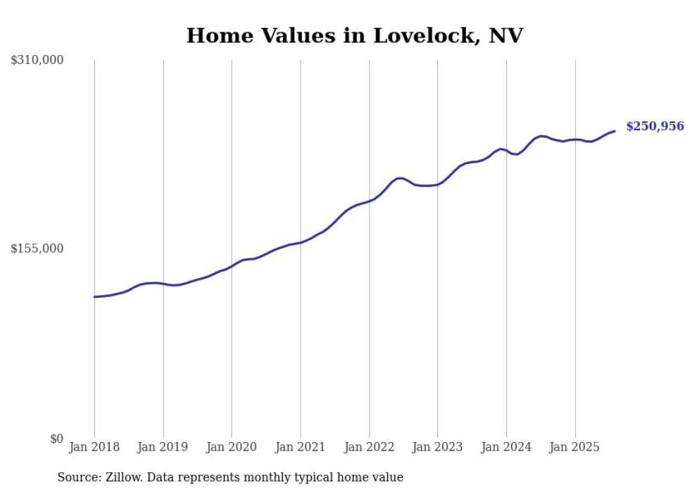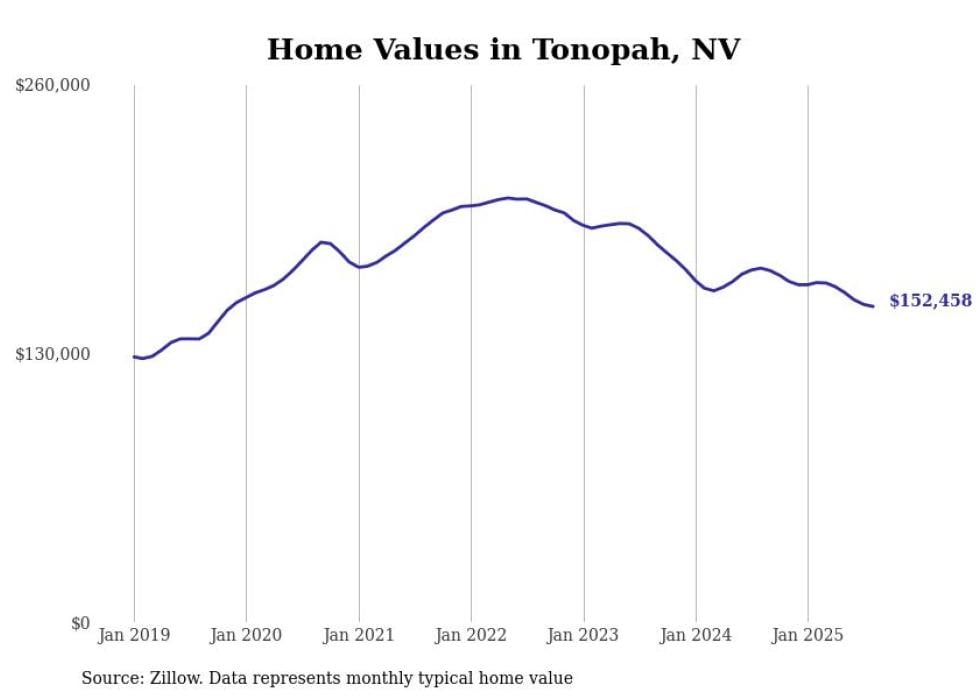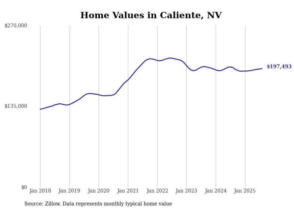 Stacker compiled a list of cities with the fastest-growing home prices in Nevada using data from Zillow. Cities are ranked by the dollar change in the Zillow Home Values Index for all homes from the 12 months ending August 2025. The charts in this story were created automatically using Matplotlib. Data was available for 50 cities and towns in Nevada.