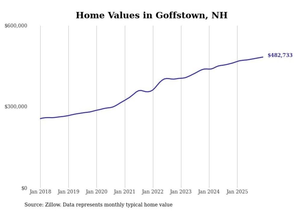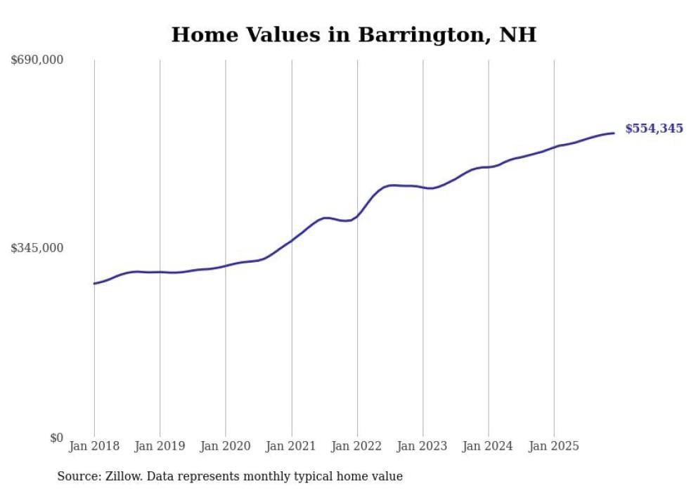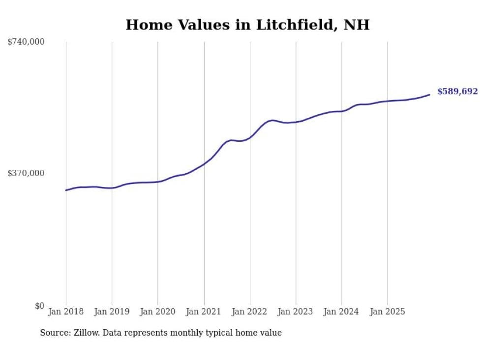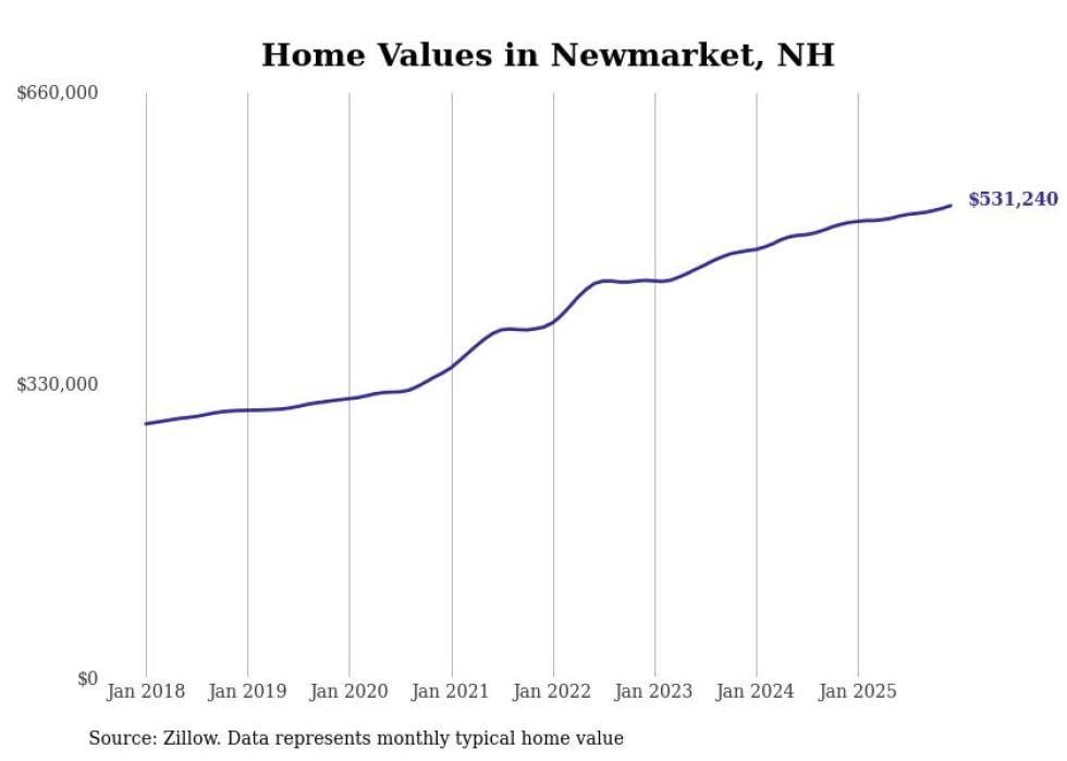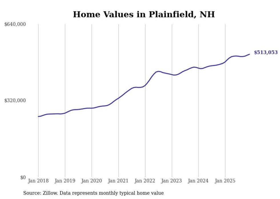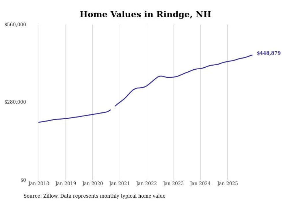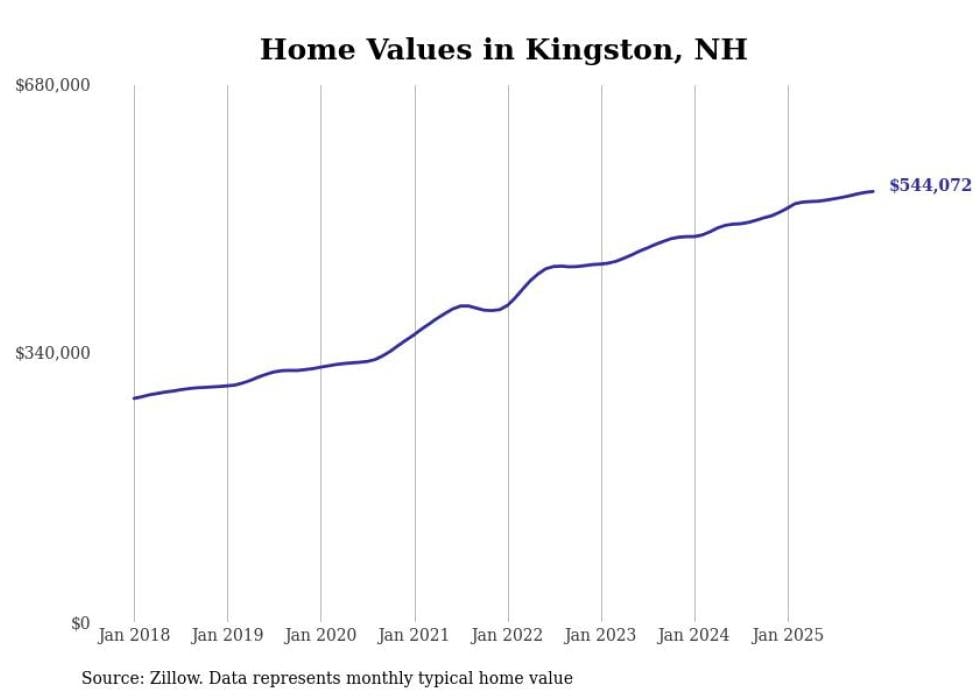 Stacker compiled a list of cities with the fastest-growing home prices in New Hampshire using data from Zillow. Cities are ranked by the dollar change in the Zillow Home Values Index for all homes from the 12 months ending December 2025. The charts in this story were created automatically using Matplotlib. Data was available for 50 cities and towns in New Hampshire.