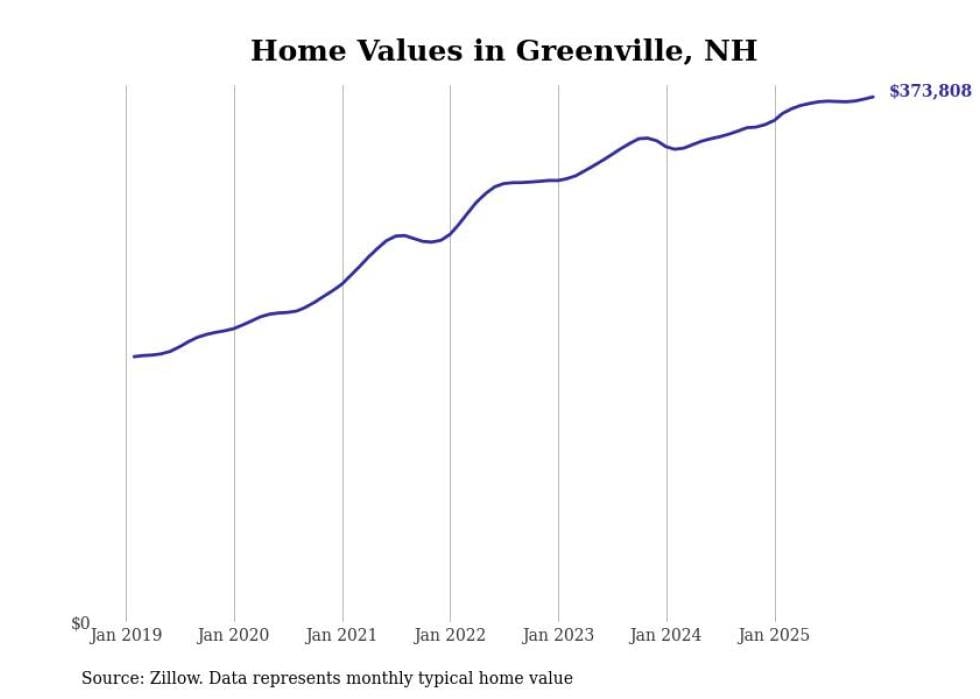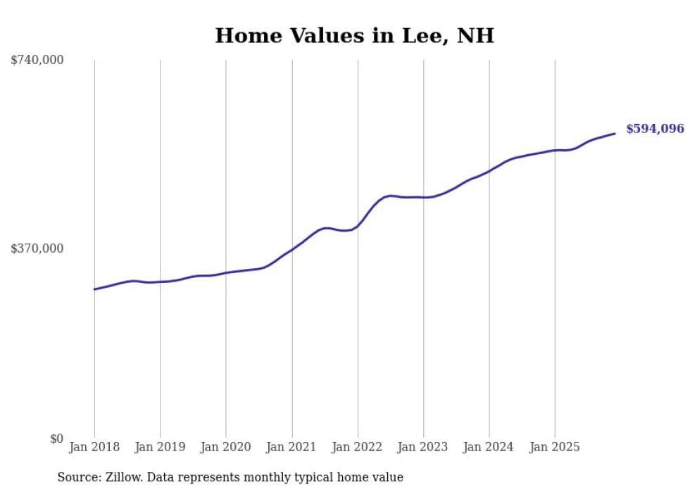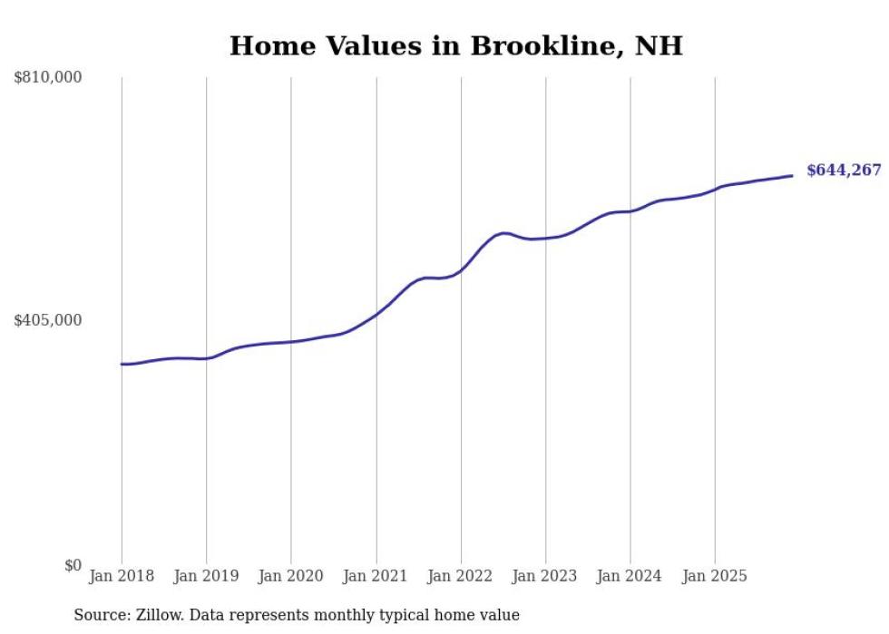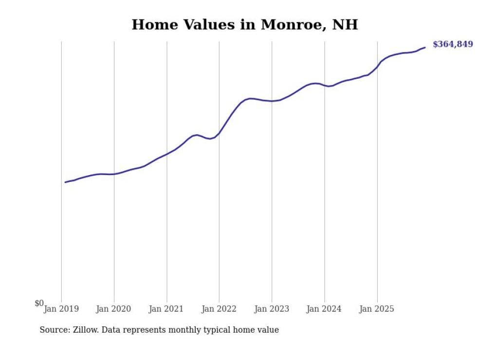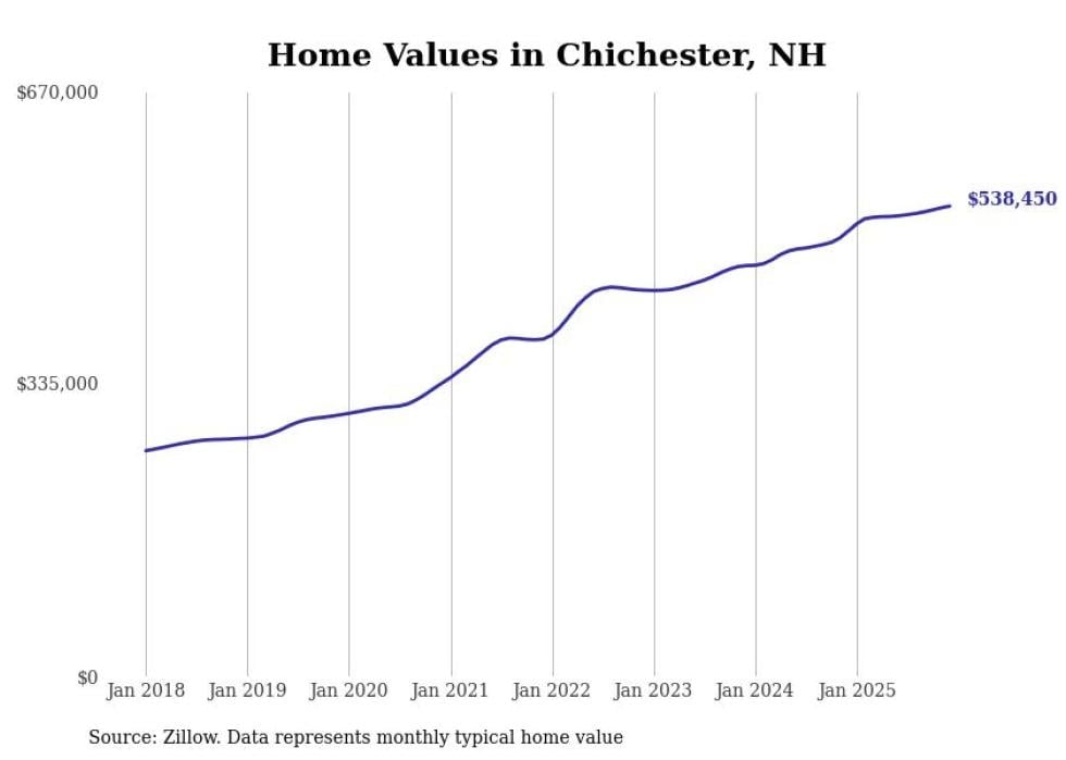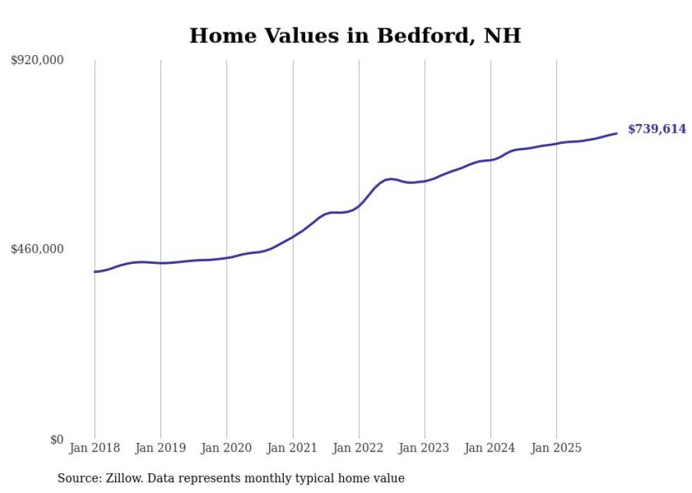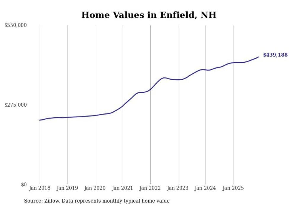 Stacker compiled a list of cities with the fastest-growing home prices in New Hampshire using data from Zillow. Cities are ranked by the dollar change in the Zillow Home Values Index for all homes from the 12 months ending December 2025. The charts in this story were created automatically using Matplotlib. Data was available for 50 cities and towns in New Hampshire.