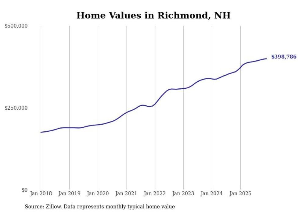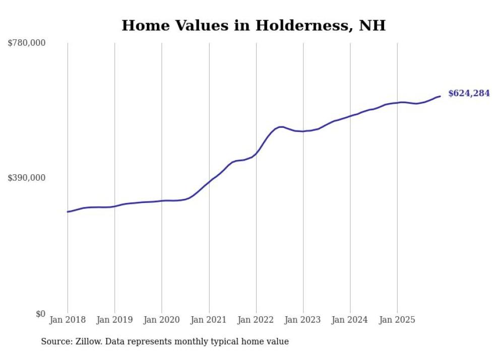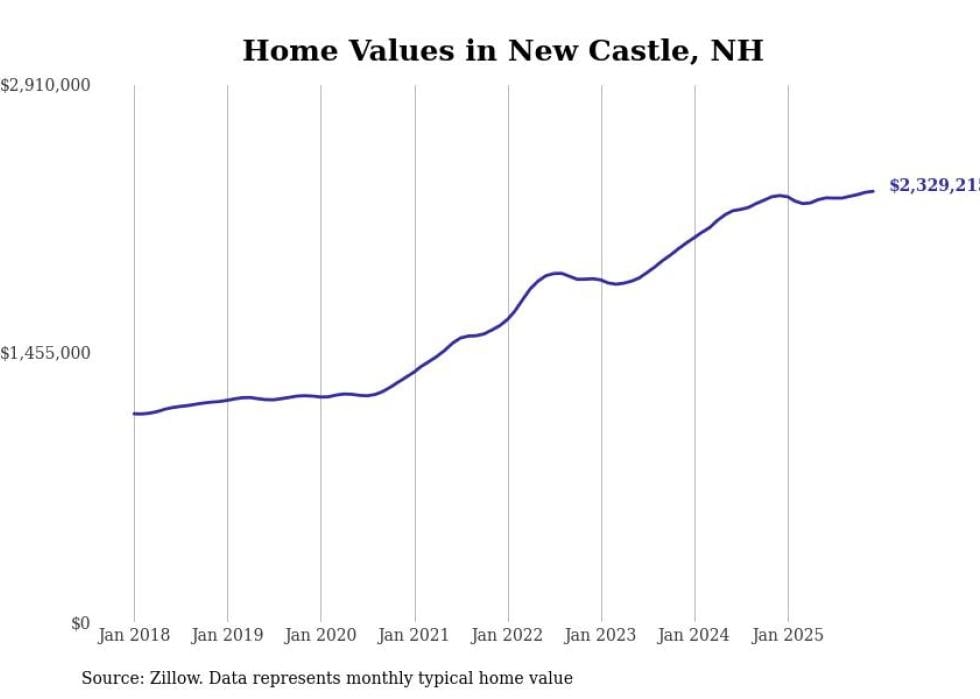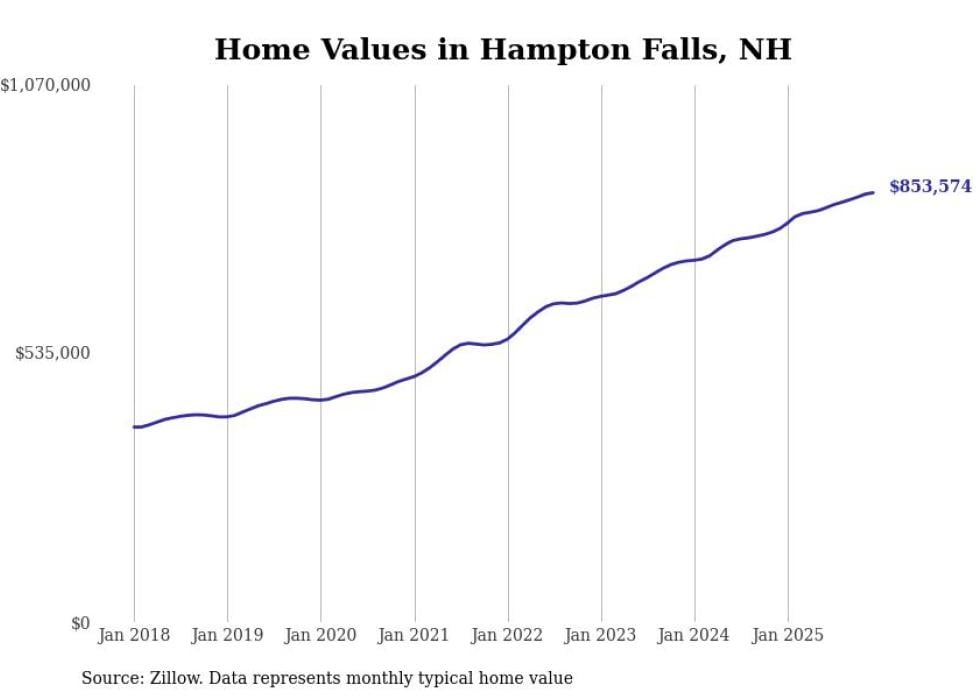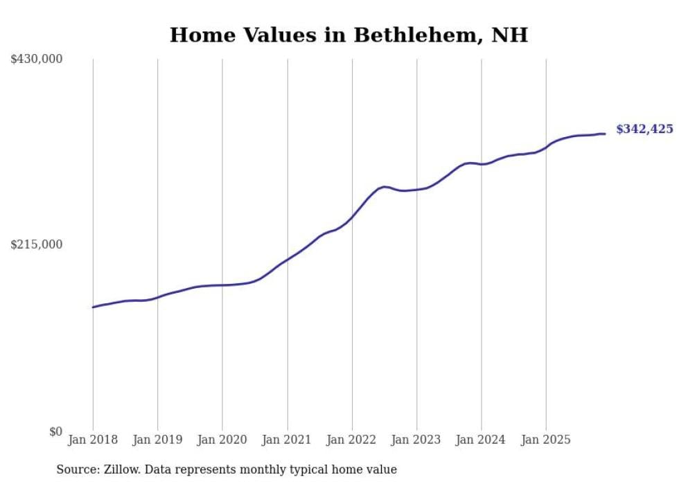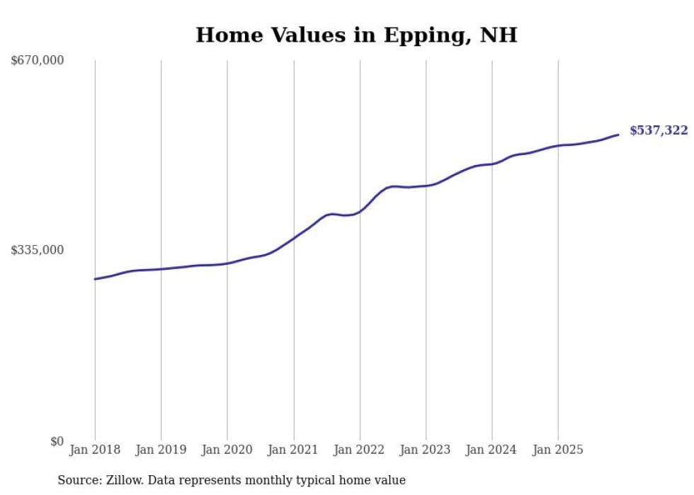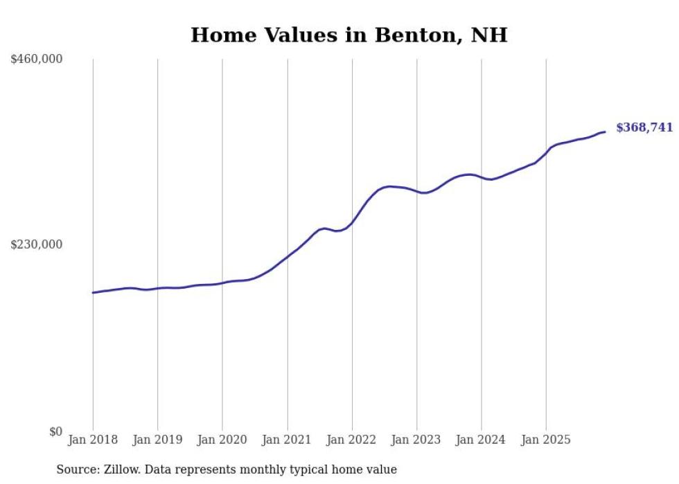 Stacker compiled a list of cities with the fastest-growing home prices in New Hampshire using data from Zillow. Cities are ranked by the dollar change in the Zillow Home Values Index for all homes from the 12 months ending December 2025. The charts in this story were created automatically using Matplotlib. Data was available for 50 cities and towns in New Hampshire.