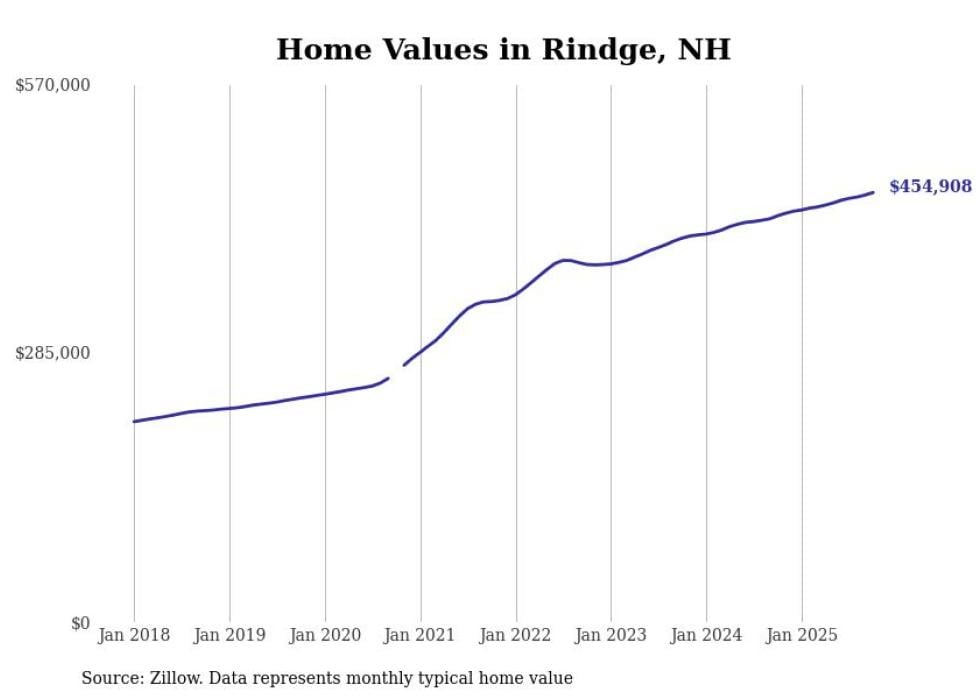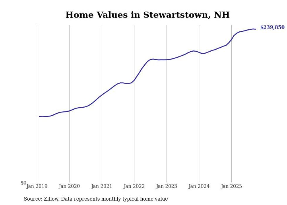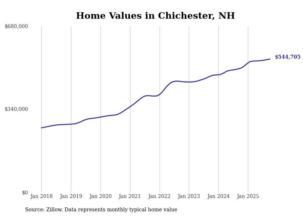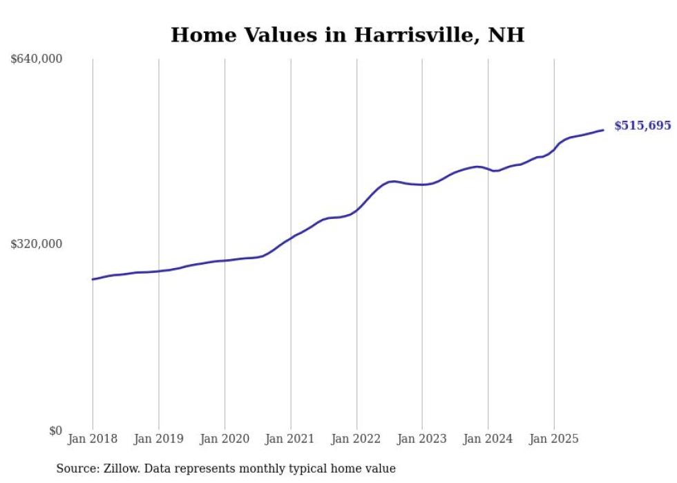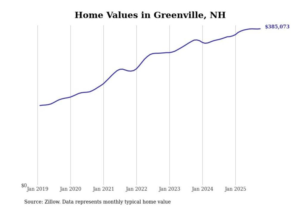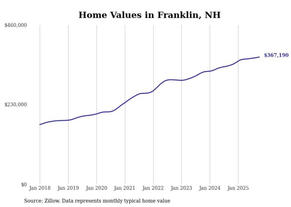 Stacker compiled a list of cities with the fastest-growing home prices in New Hampshire using data from Zillow. Cities are ranked by the dollar change in the Zillow Home Values Index for all homes from the 12 months ending October 2025. The charts in this story were created automatically using Matplotlib. Data was available for 50 cities and towns in New Hampshire.