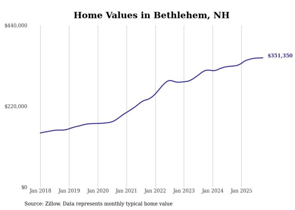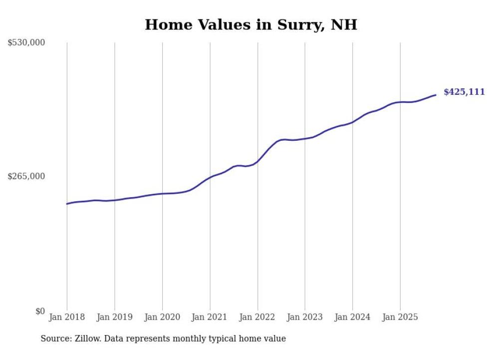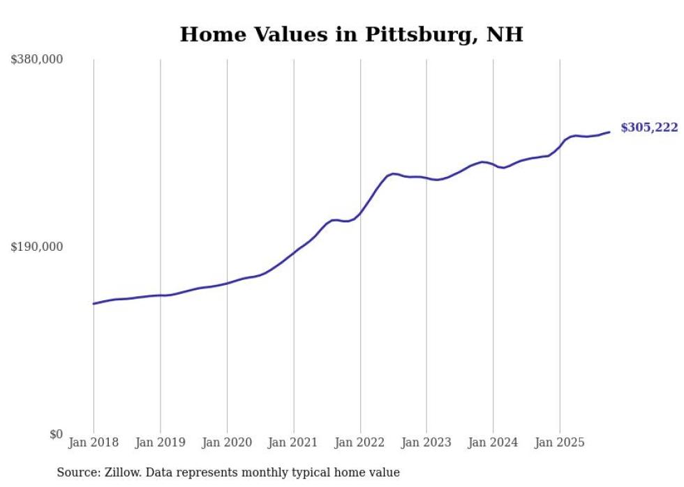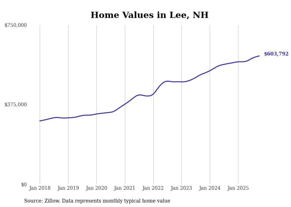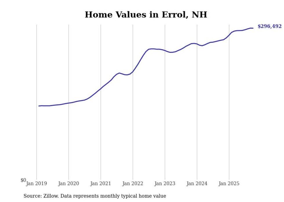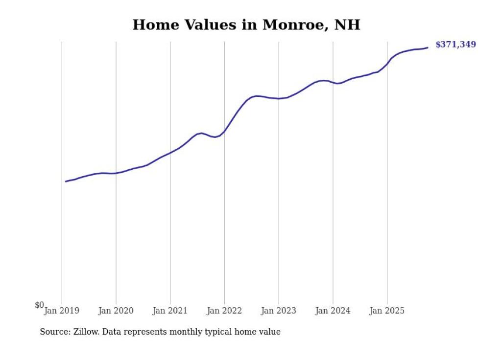 Stacker compiled a list of cities with the fastest-growing home prices in New Hampshire using data from Zillow. Cities are ranked by the dollar change in the Zillow Home Values Index for all homes from the 12 months ending October 2025. The charts in this story were created automatically using Matplotlib. Data was available for 50 cities and towns in New Hampshire.