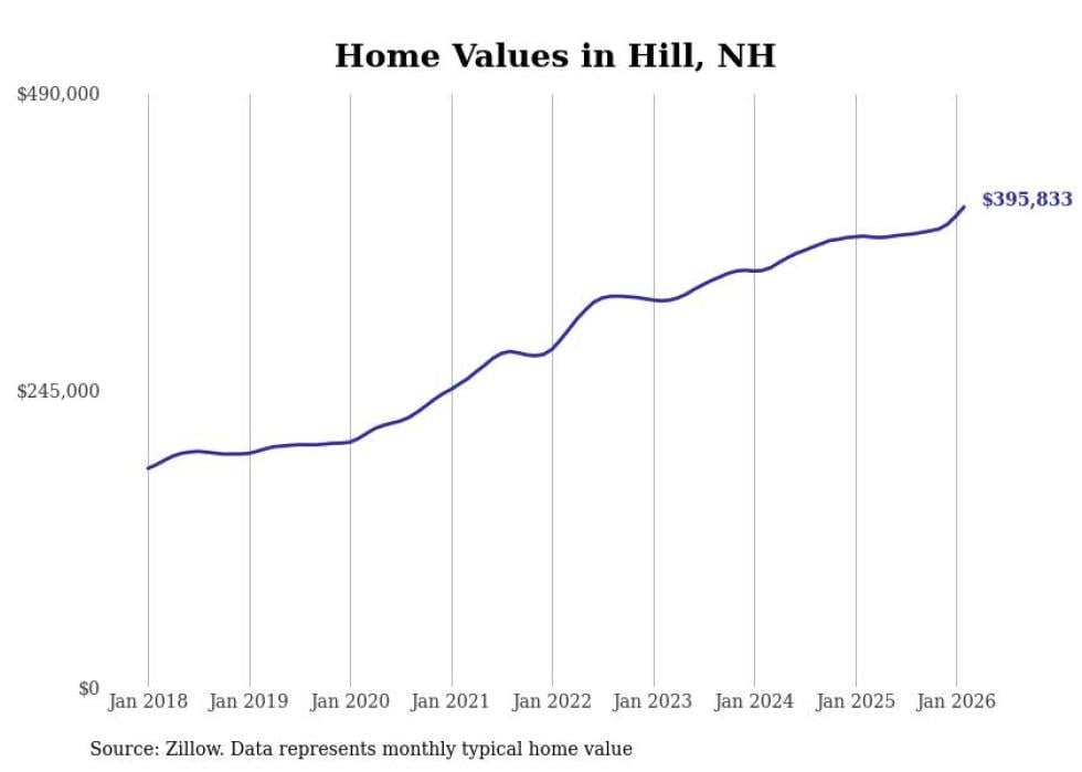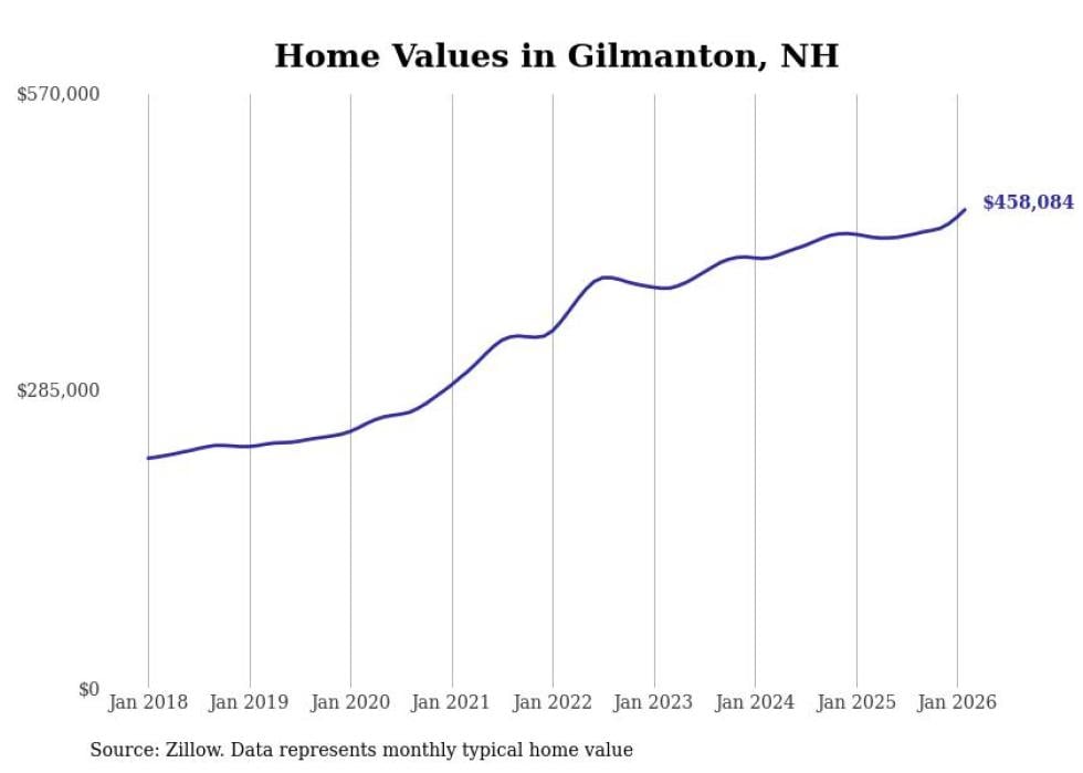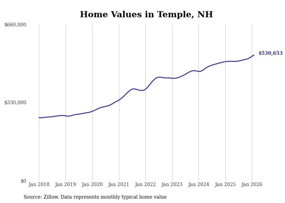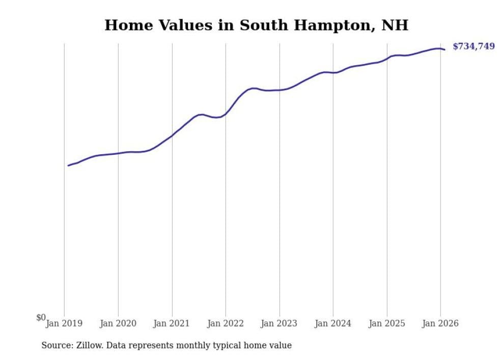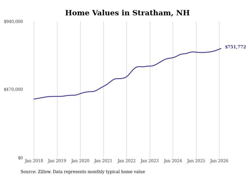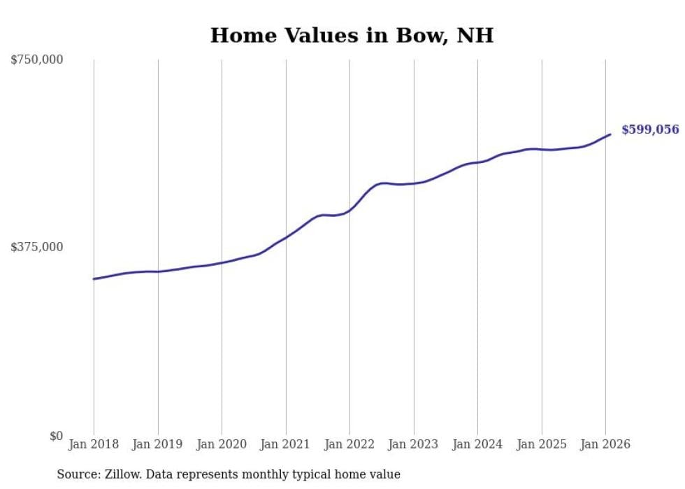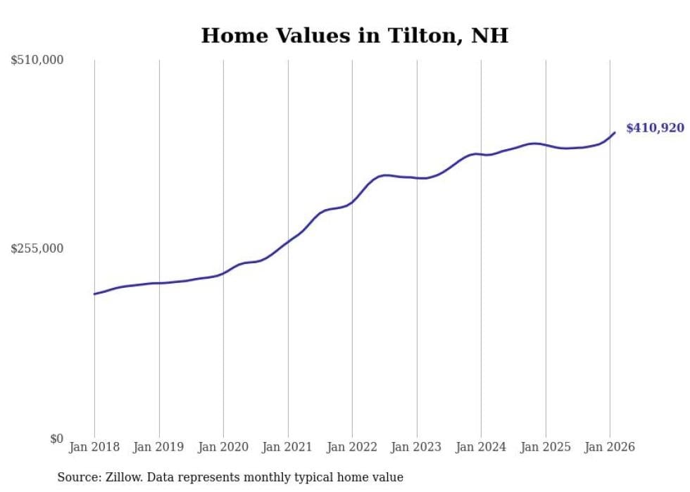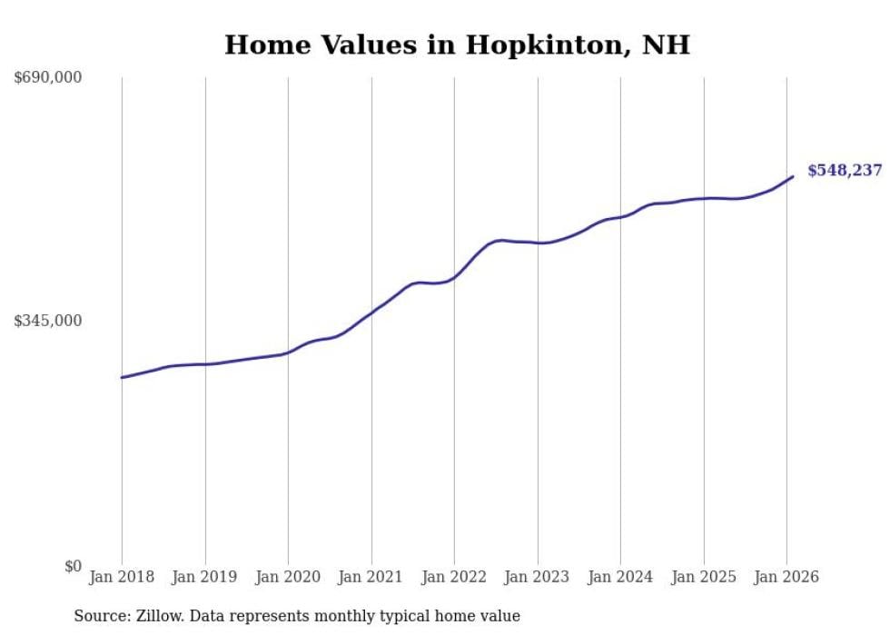 Stacker compiled a list of cities with the fastest-growing home prices in New Hampshire using data from Zillow. Cities are ranked by the dollar change in the Zillow Home Values Index for all homes from the 12 months ending February 2026. The charts in this story were created automatically using Matplotlib. Data was available for 50 cities and towns in New Hampshire.