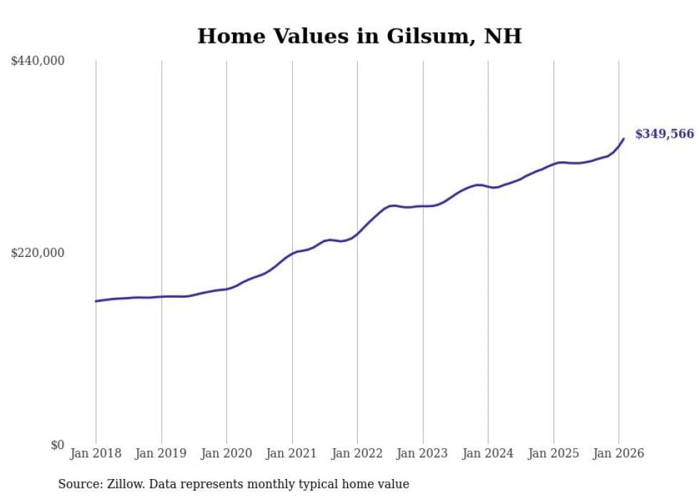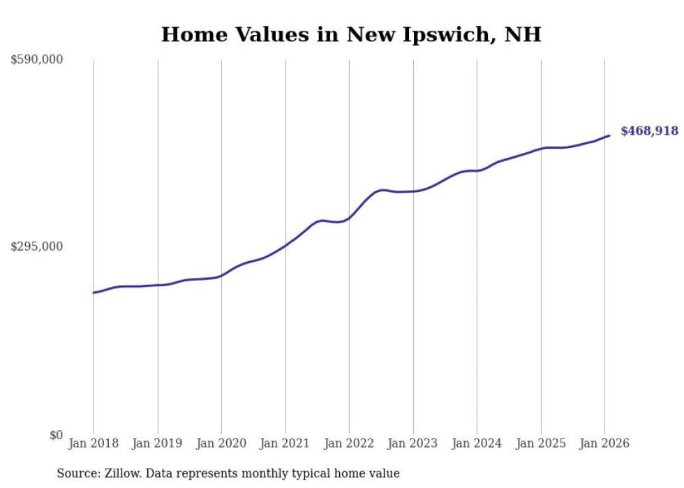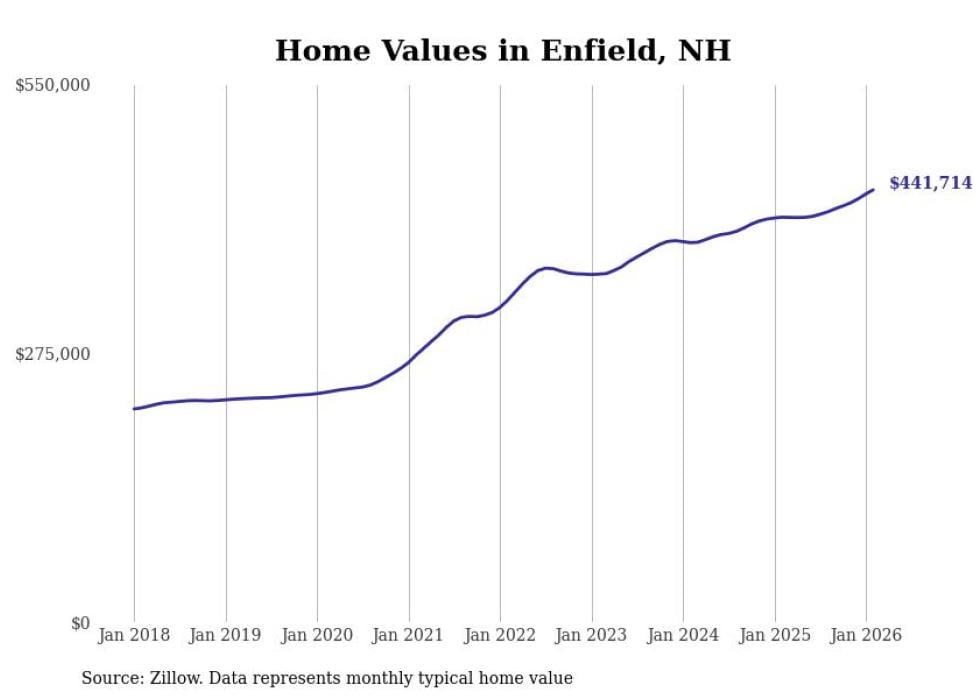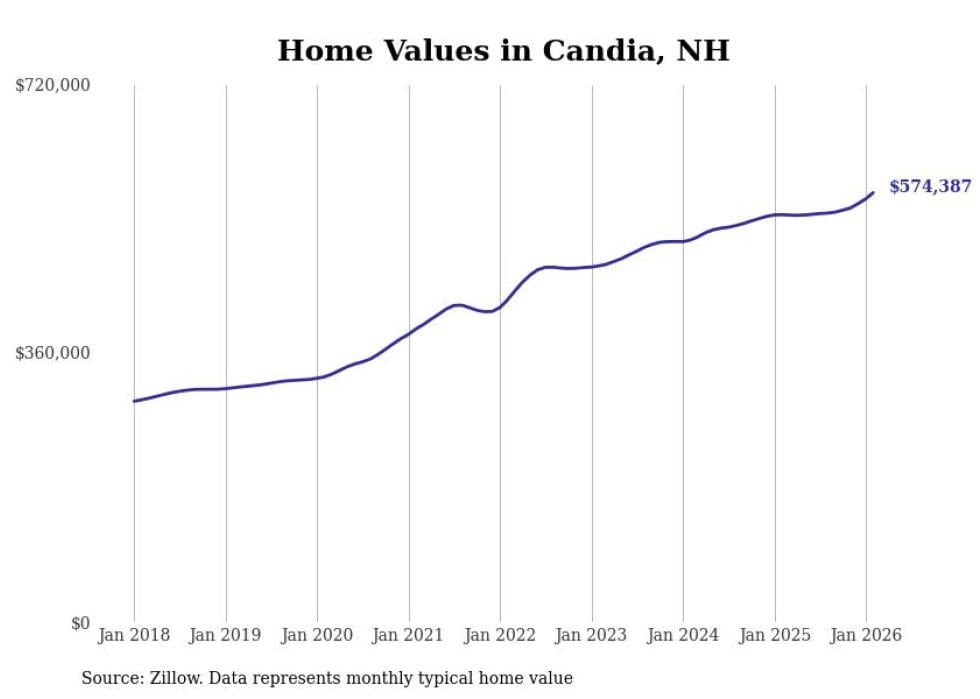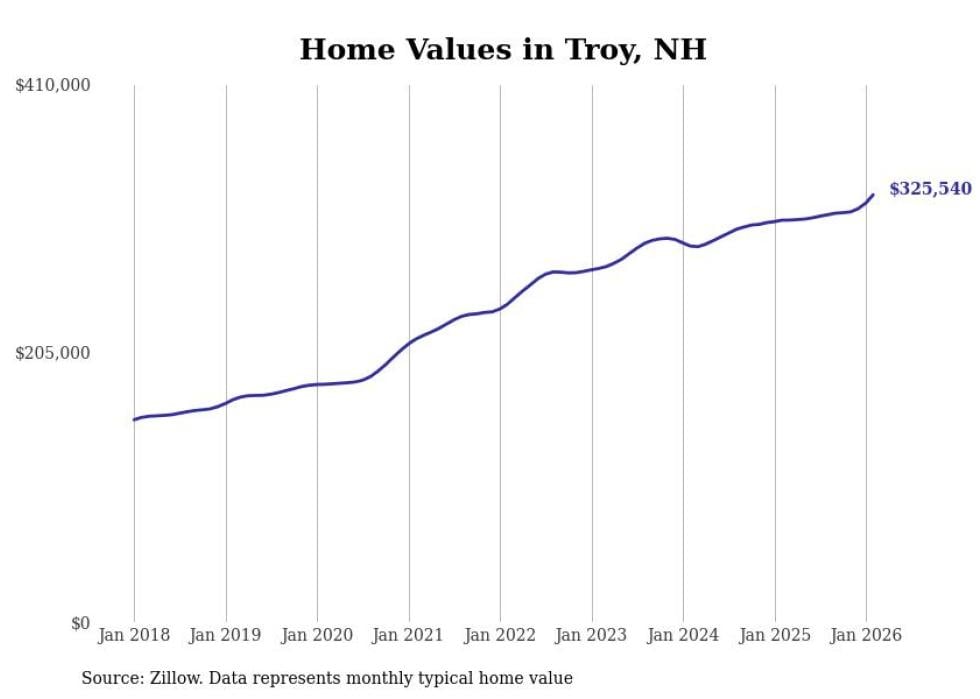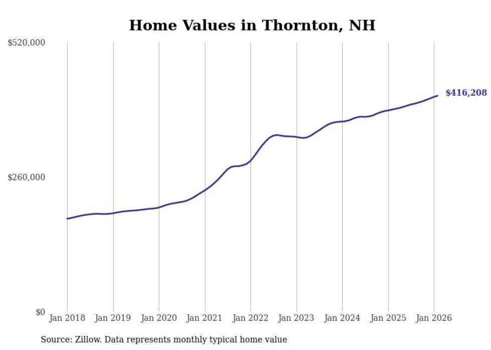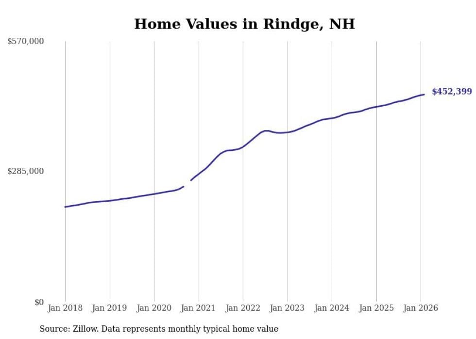 Stacker compiled a list of cities with the fastest-growing home prices in New Hampshire using data from Zillow. Cities are ranked by the dollar change in the Zillow Home Values Index for all homes from the 12 months ending February 2026. The charts in this story were created automatically using Matplotlib. Data was available for 50 cities and towns in New Hampshire.
