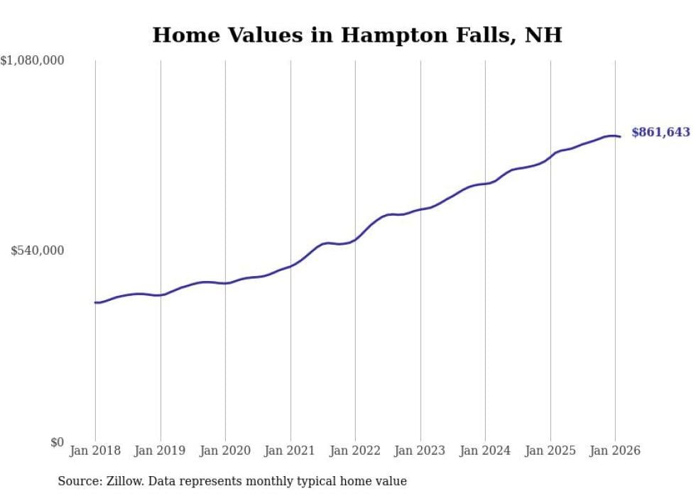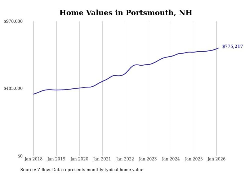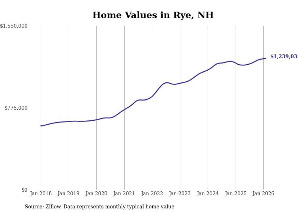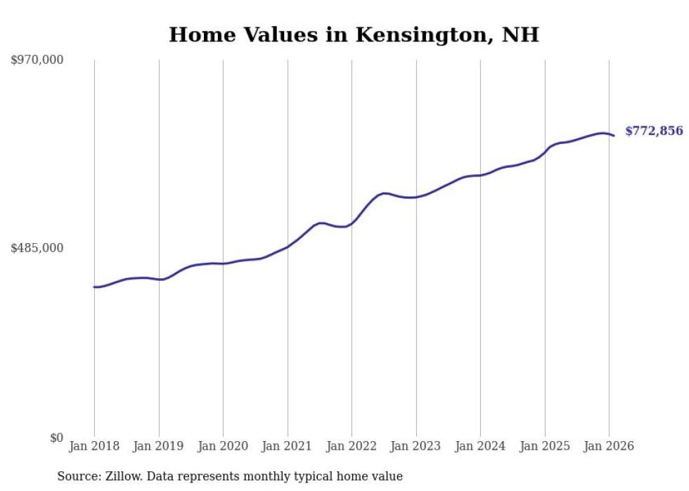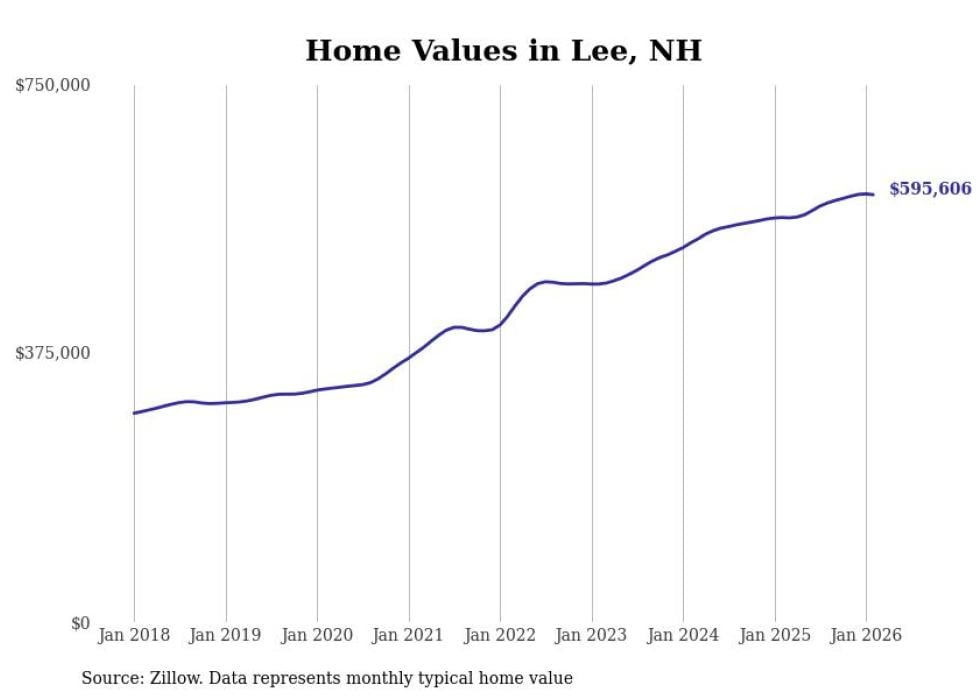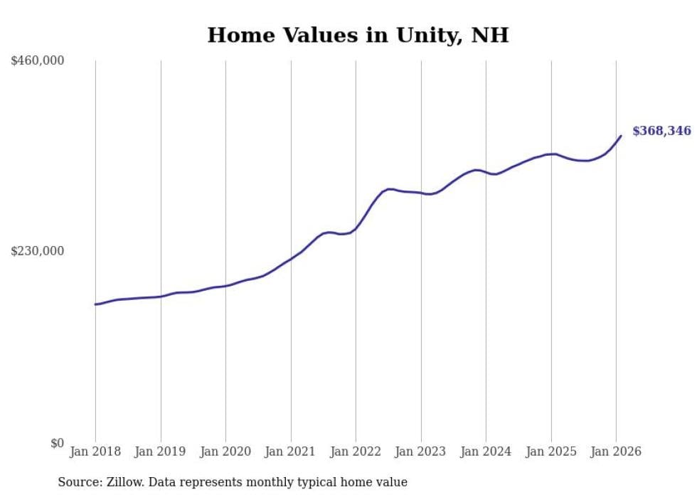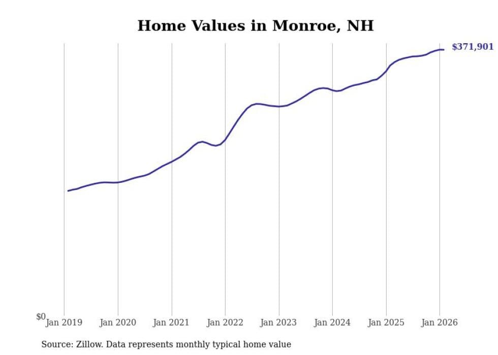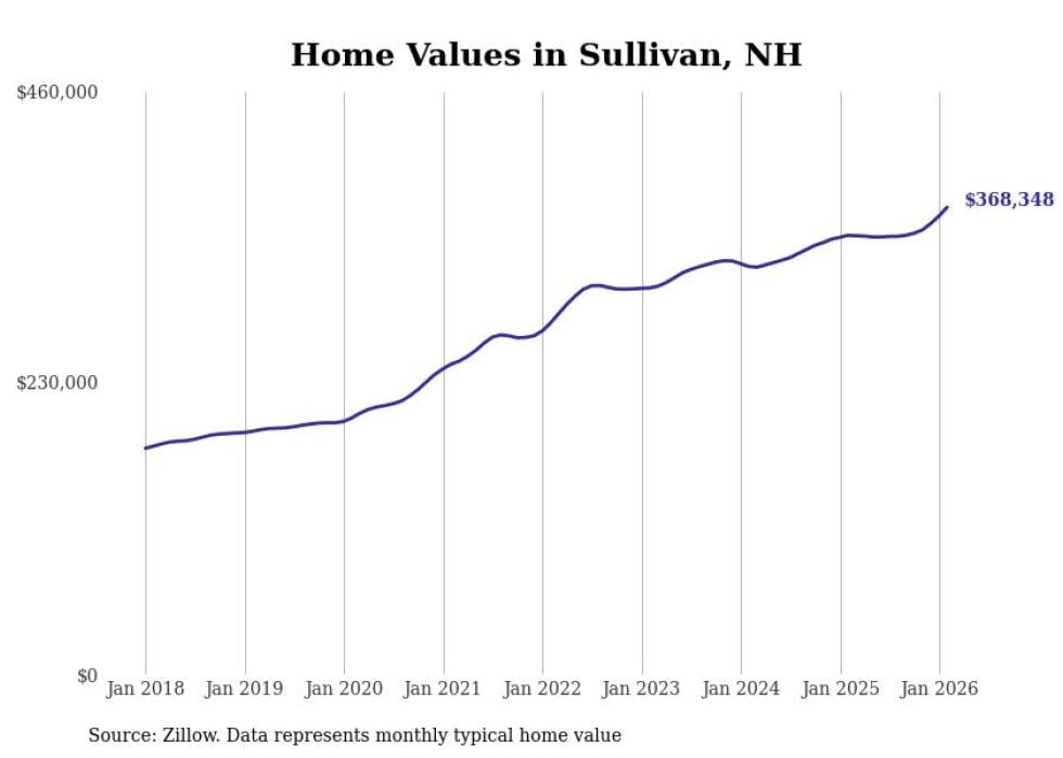 Stacker compiled a list of cities with the fastest-growing home prices in New Hampshire using data from Zillow. Cities are ranked by the dollar change in the Zillow Home Values Index for all homes from the 12 months ending February 2026. The charts in this story were created automatically using Matplotlib. Data was available for 50 cities and towns in New Hampshire.