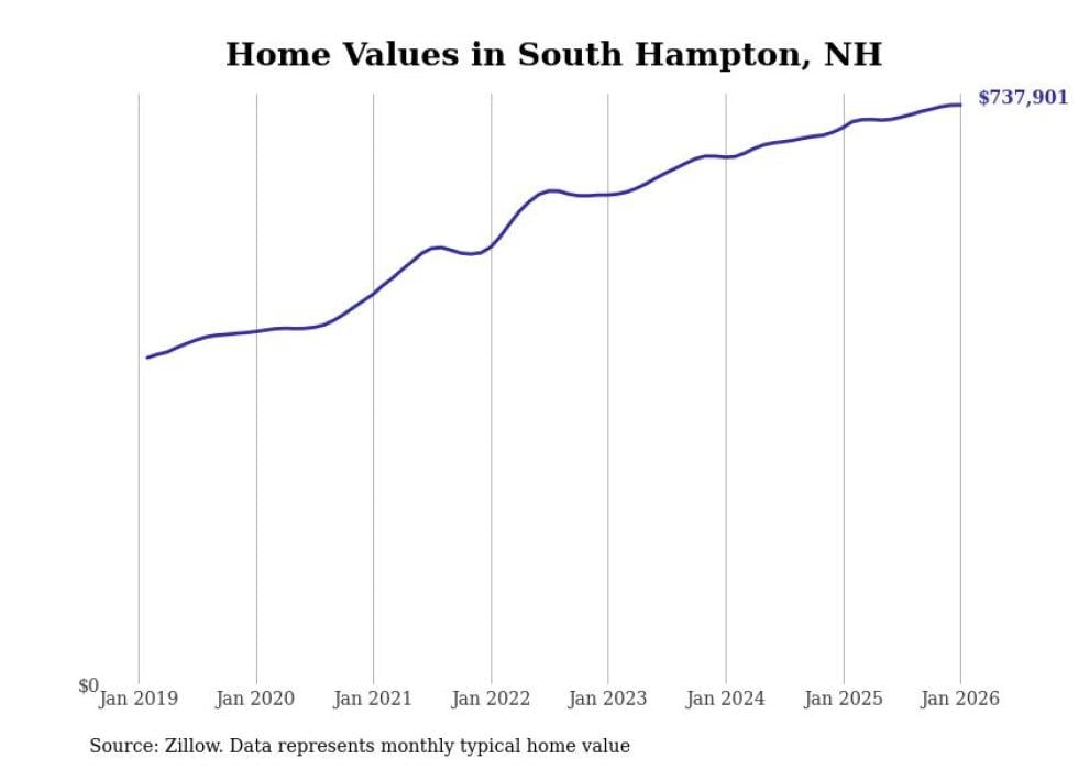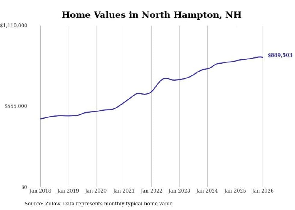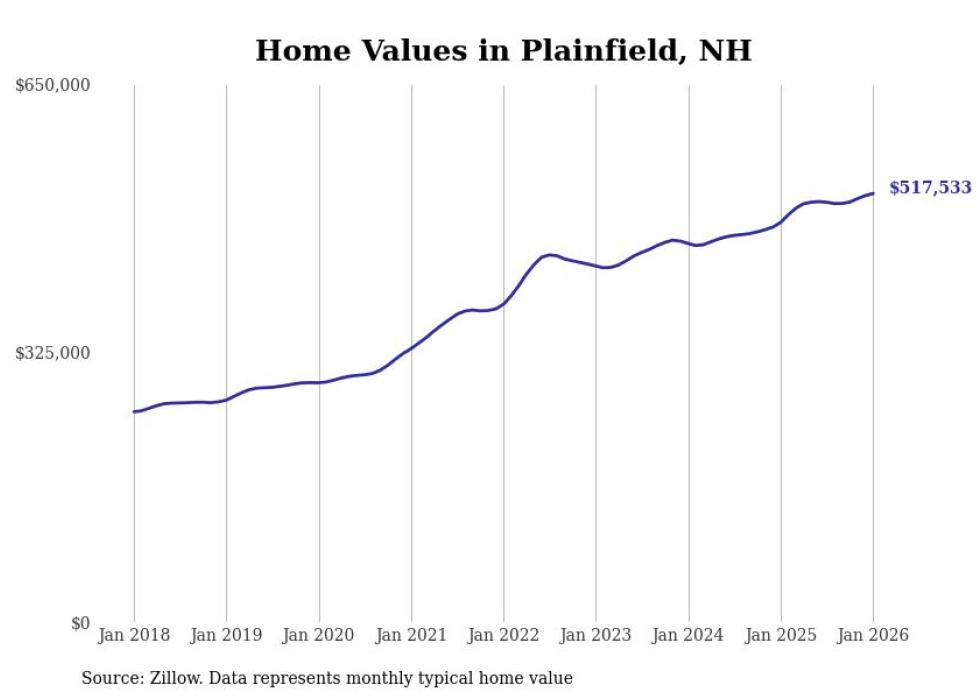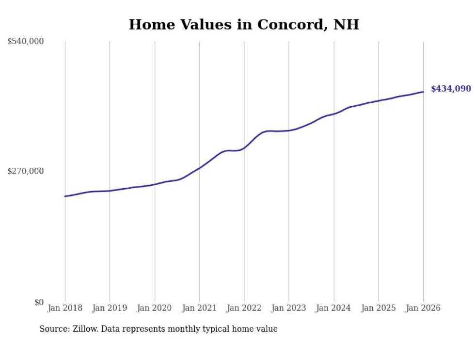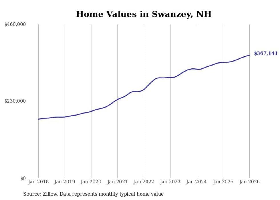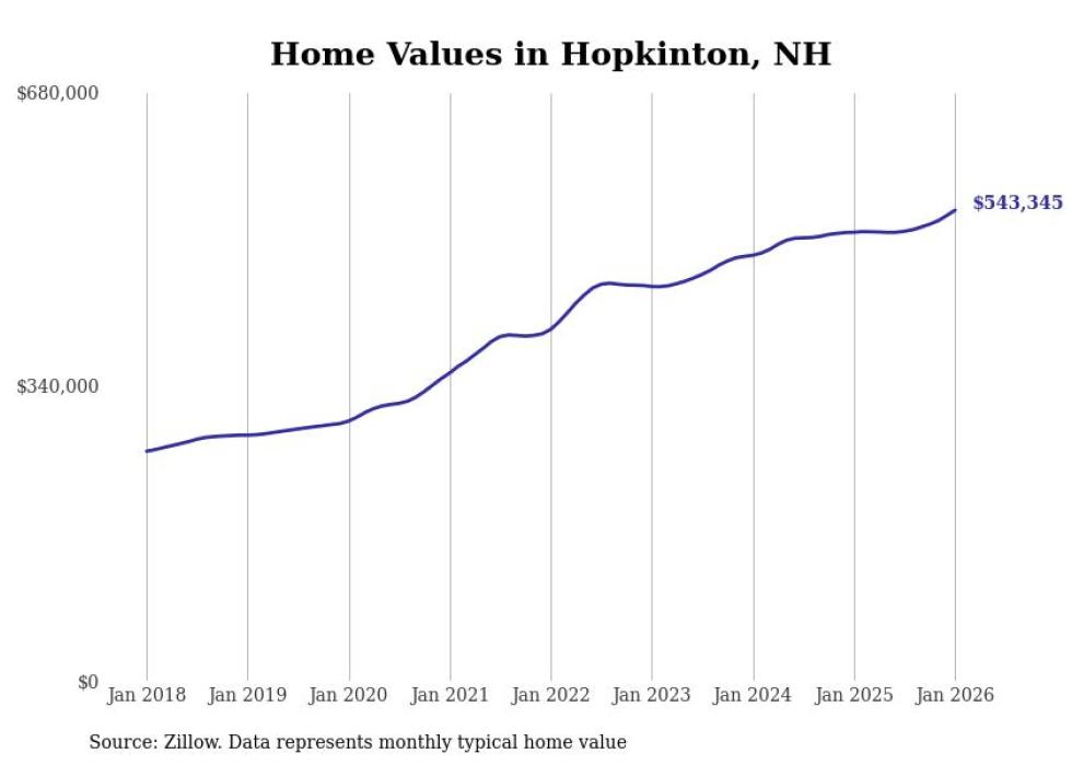 Stacker compiled a list of cities with the fastest-growing home prices in New Hampshire using data from Zillow. Cities are ranked by the dollar change in the Zillow Home Values Index for all homes from the 12 months ending January 2026. The charts in this story were created automatically using Matplotlib. Data was available for 50 cities and towns in New Hampshire.