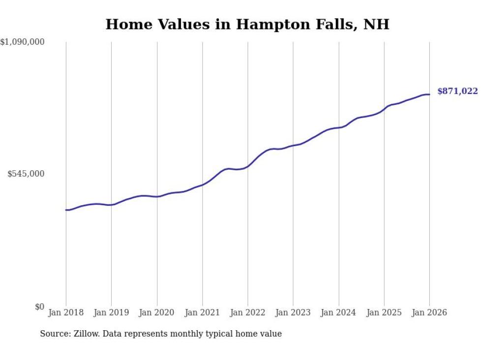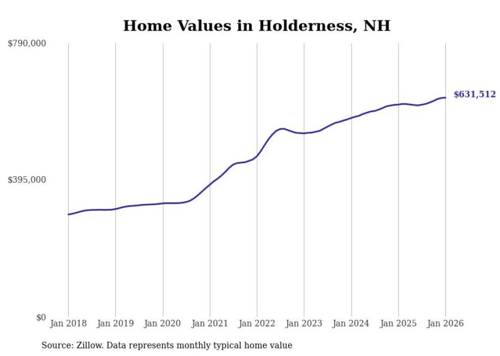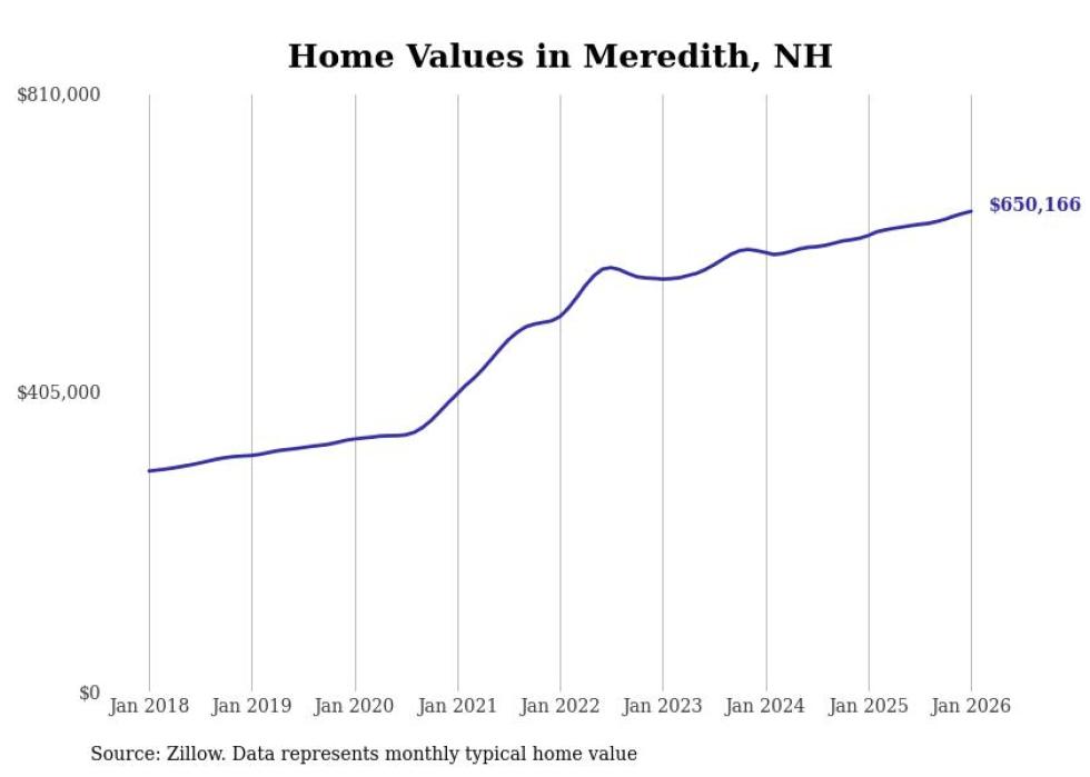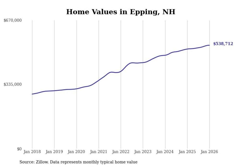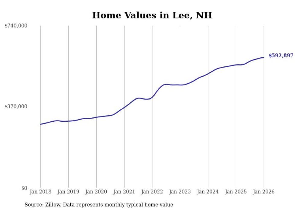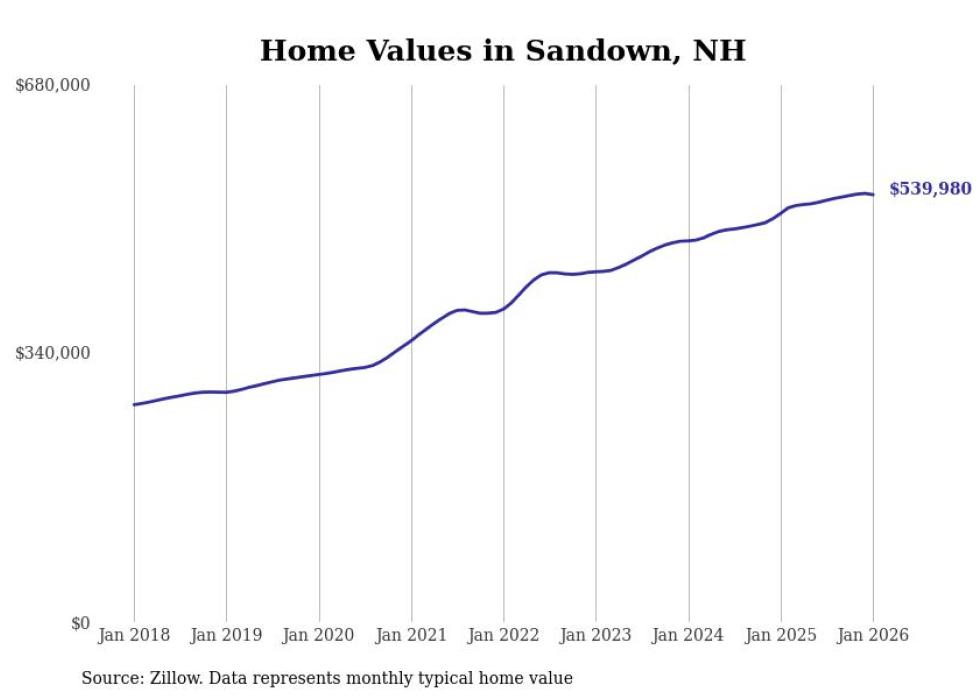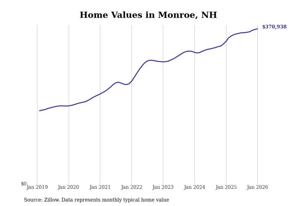 Stacker compiled a list of cities with the fastest-growing home prices in New Hampshire using data from Zillow. Cities are ranked by the dollar change in the Zillow Home Values Index for all homes from the 12 months ending January 2026. The charts in this story were created automatically using Matplotlib. Data was available for 50 cities and towns in New Hampshire.