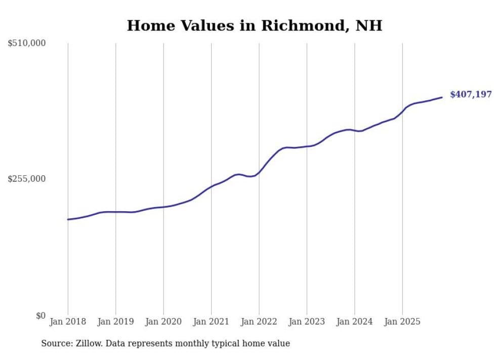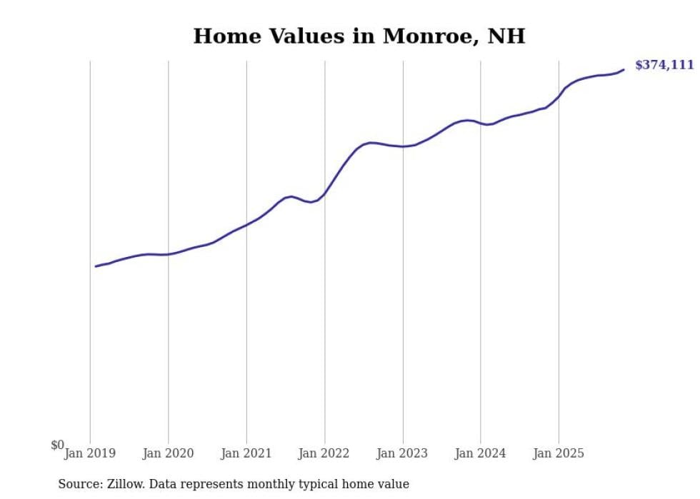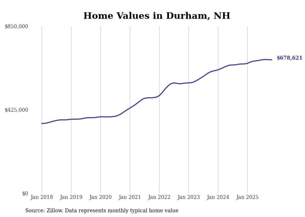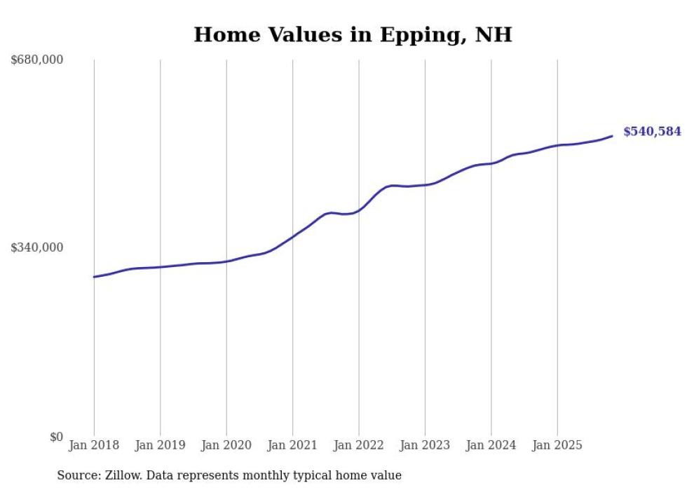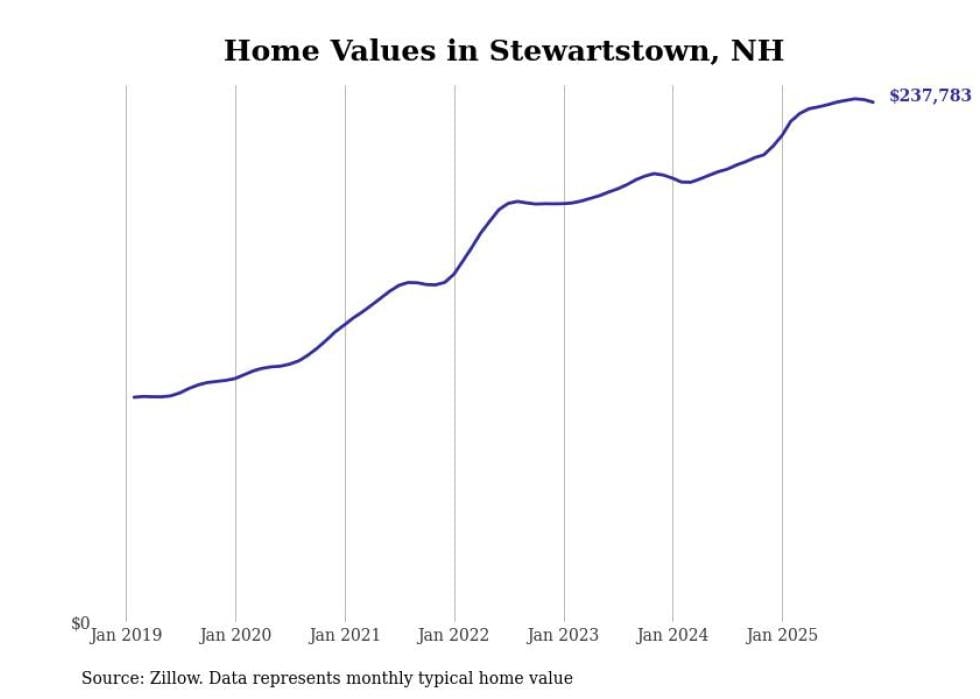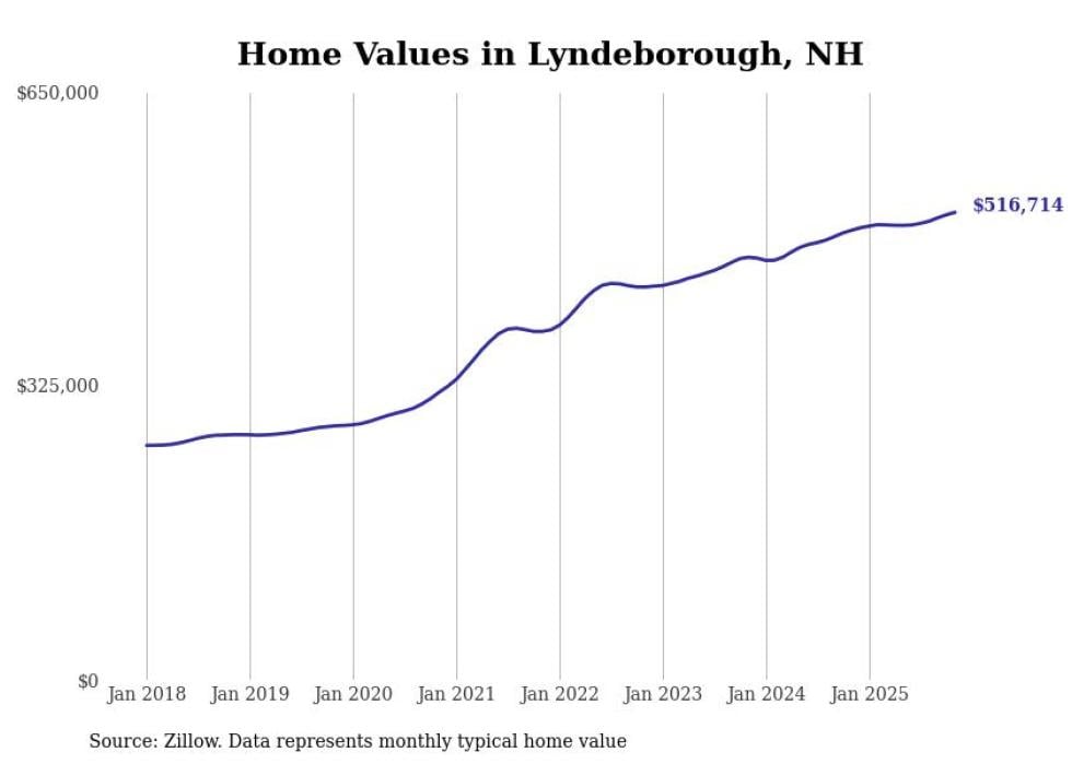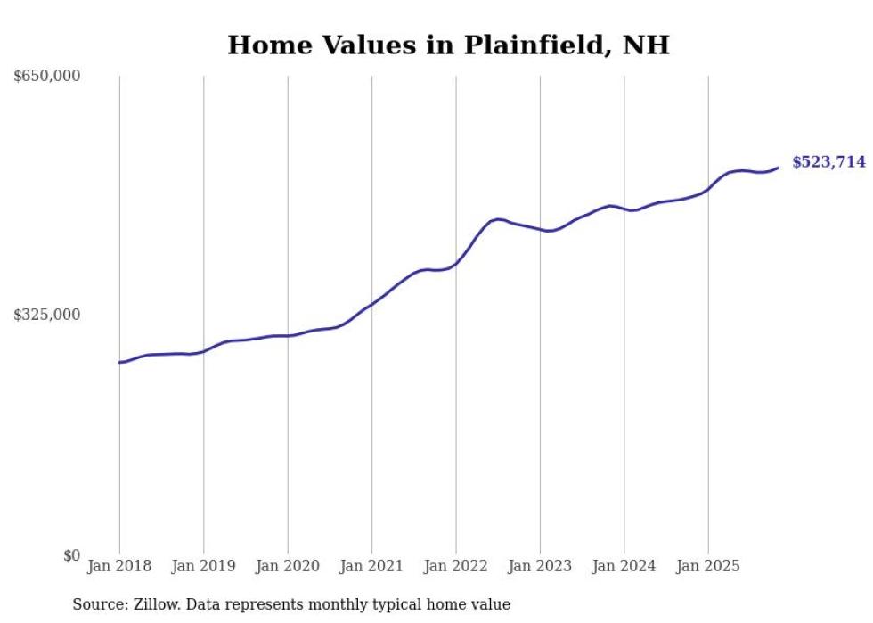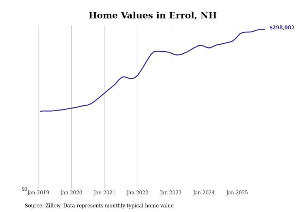 Stacker compiled a list of cities with the fastest-growing home prices in New Hampshire using data from Zillow. Cities are ranked by the dollar change in the Zillow Home Values Index for all homes from the 12 months ending November 2025. The charts in this story were created automatically using Matplotlib. Data was available for 50 cities and towns in New Hampshire.