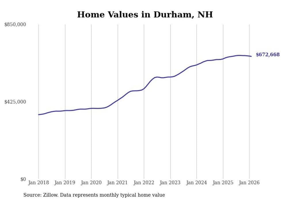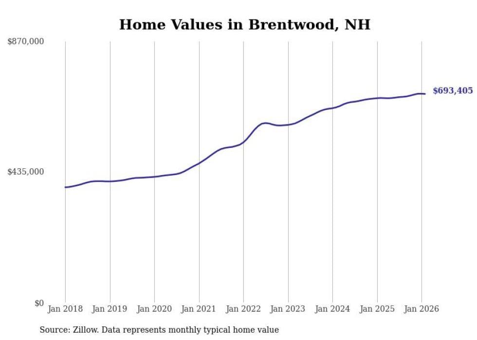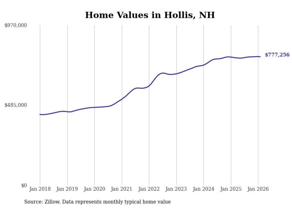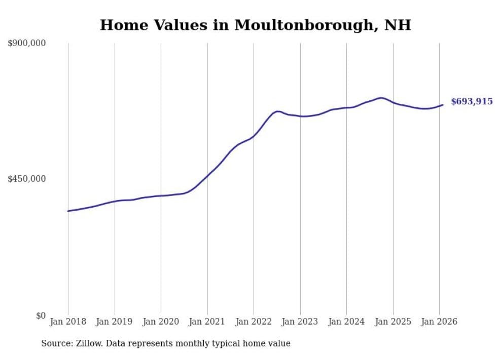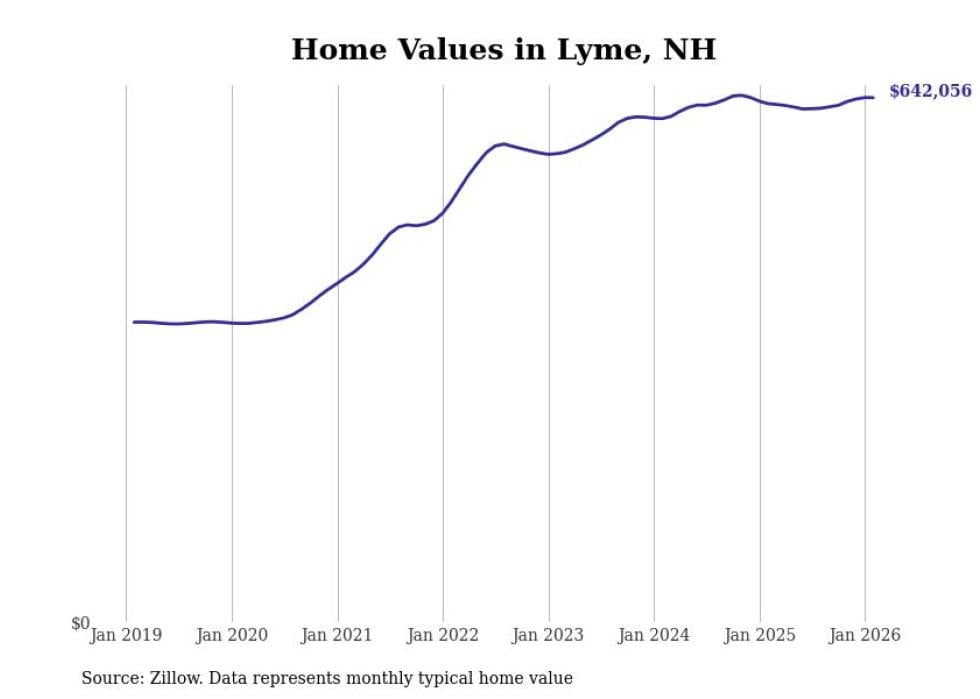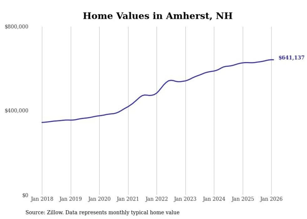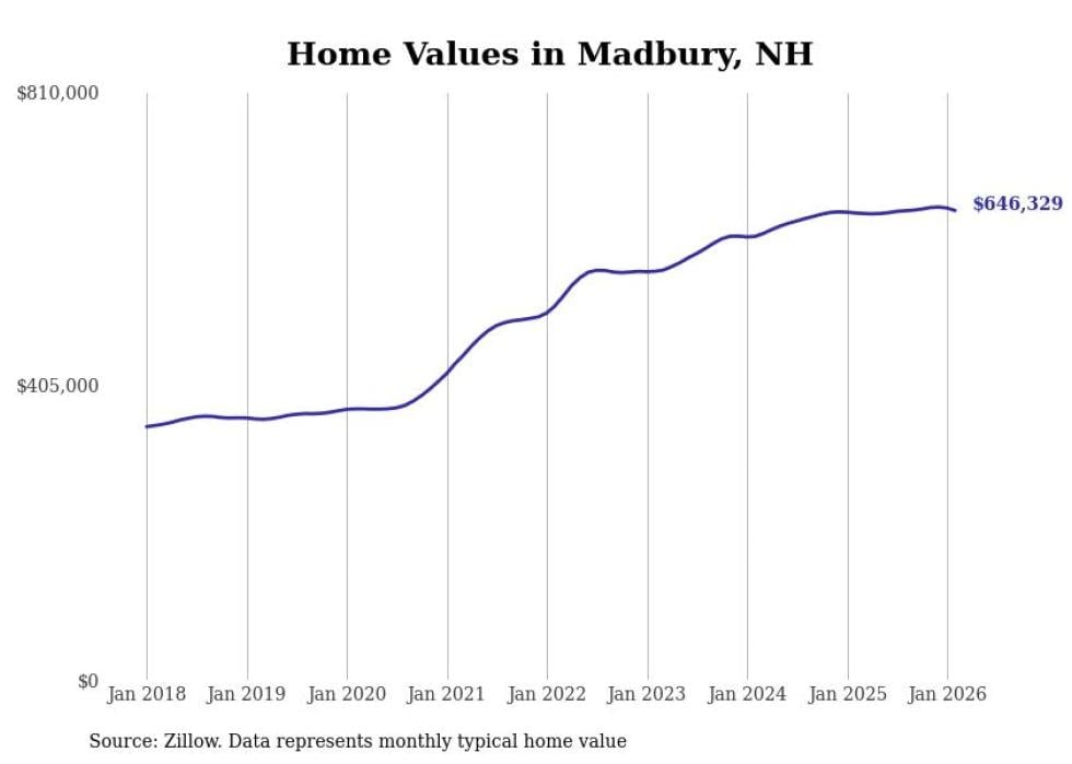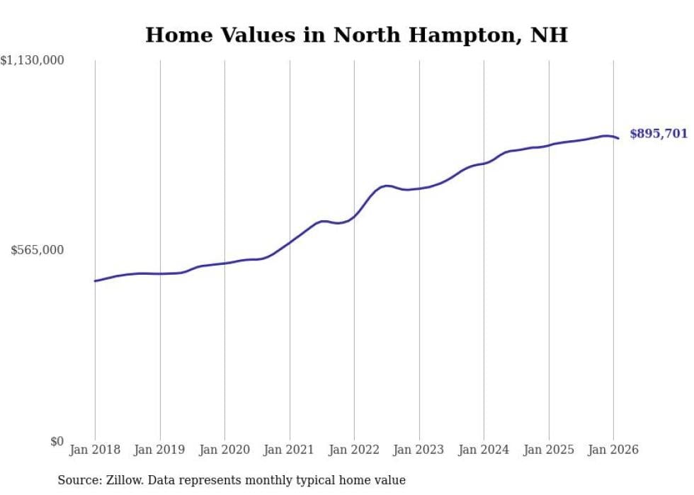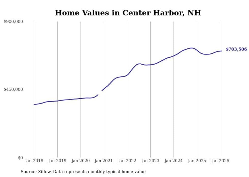 Stacker compiled a list of cities with the most expensive homes in New Hampshire using data from Zillow. Cities are ranked by the Zillow Home Values Index for all homes as of February 2026. The charts in this story were created automatically using Matplotlib.