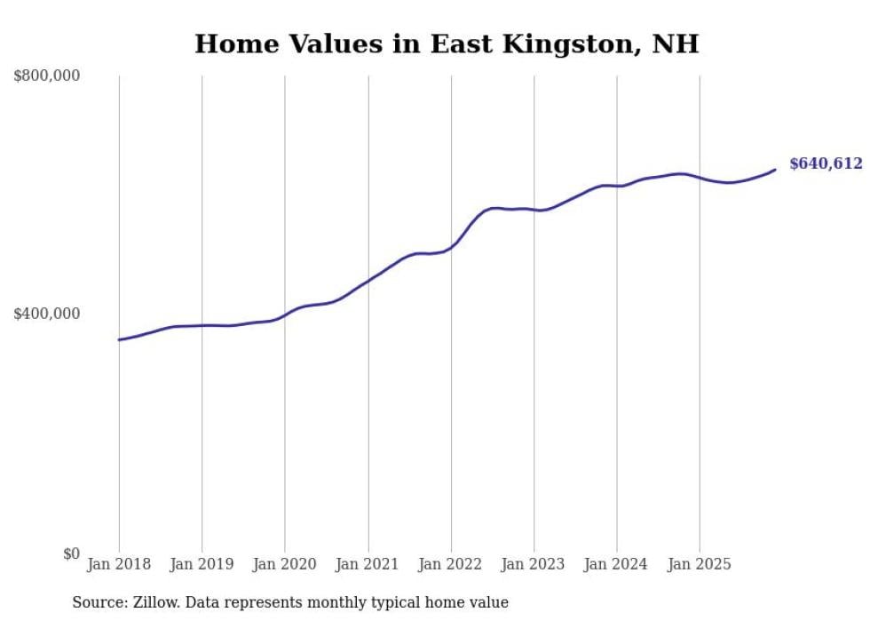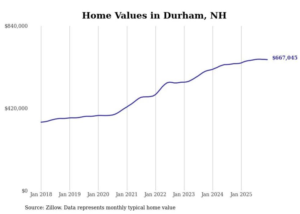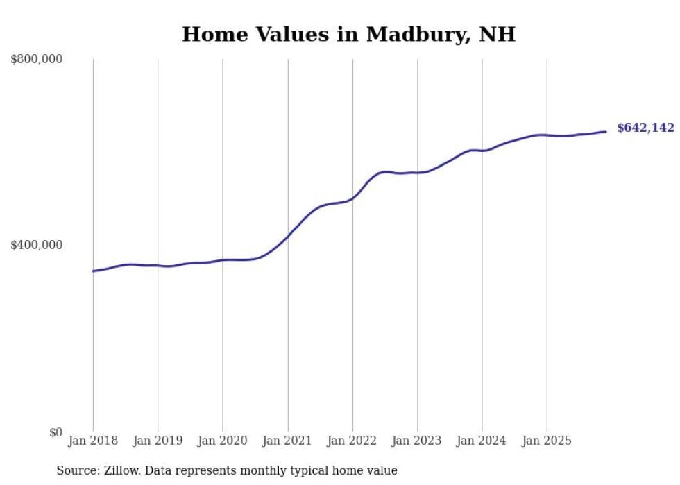 Stacker compiled a list of cities with the most expensive homes in New Hampshire using data from Zillow. Cities are ranked by the Zillow Home Values Index for all homes as of December 2025. The charts in this story were created automatically using Matplotlib.
