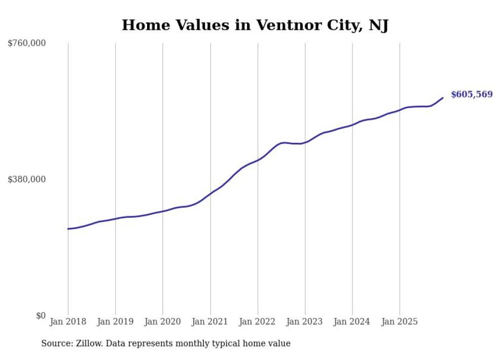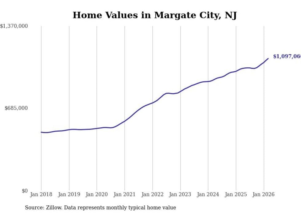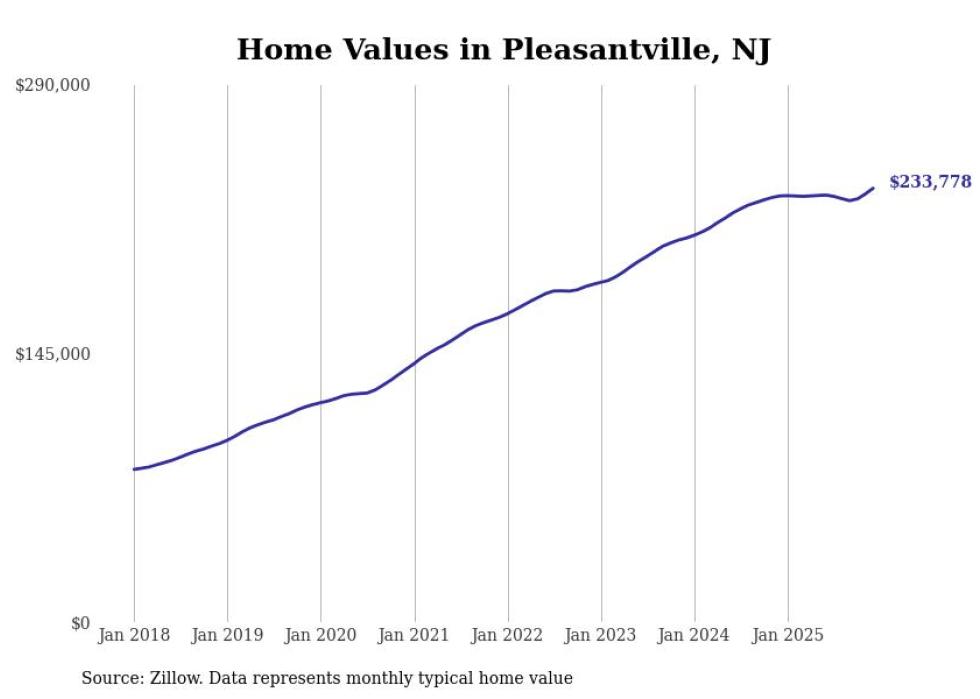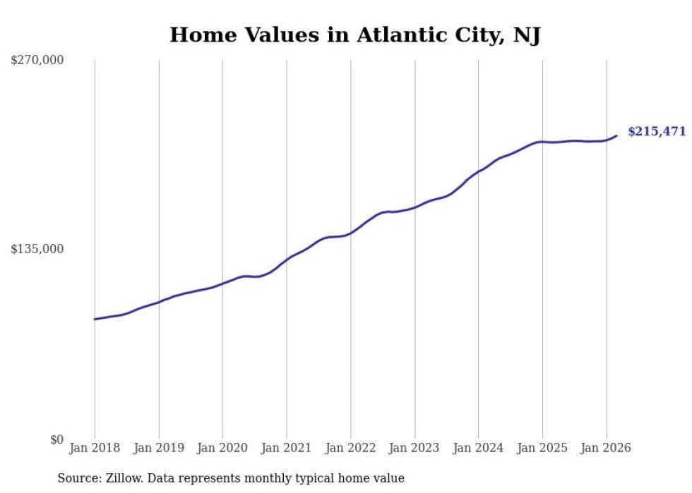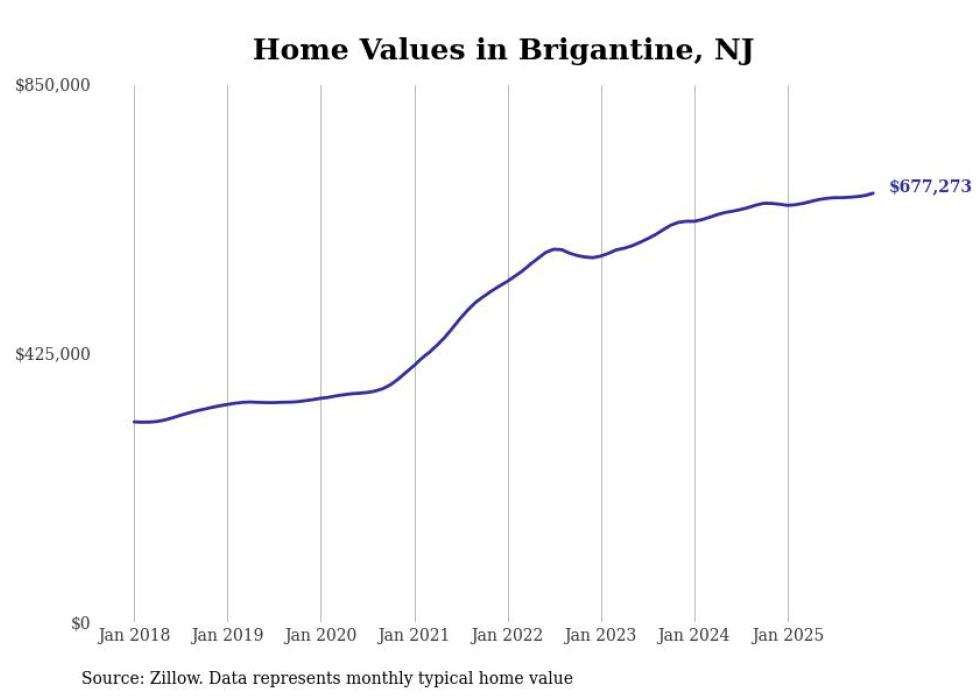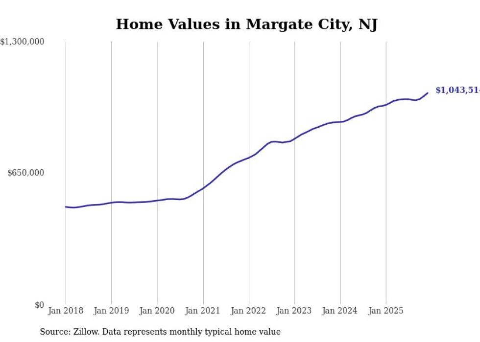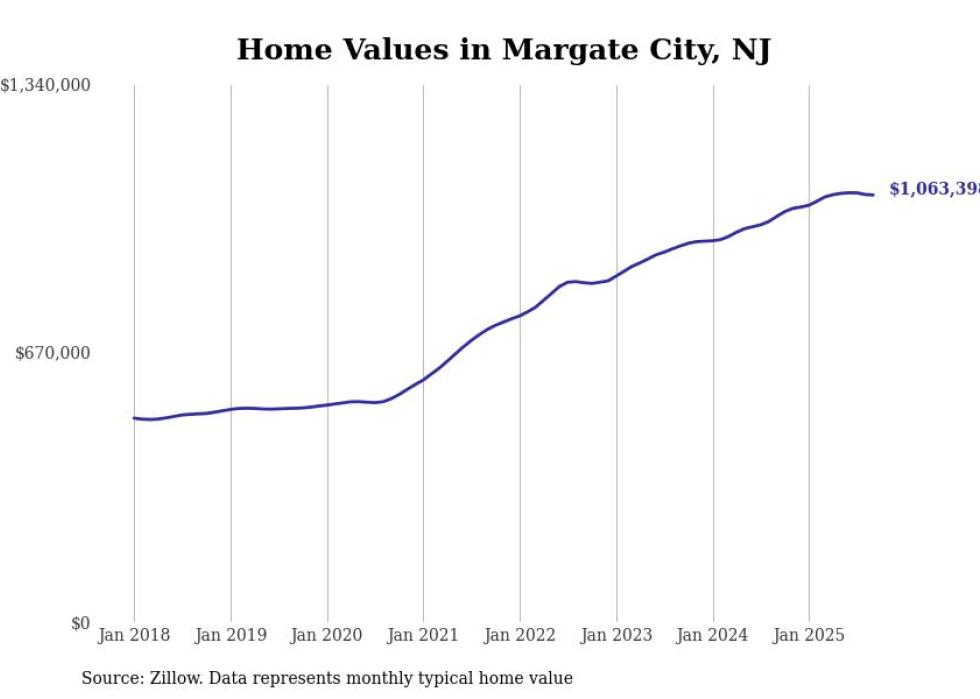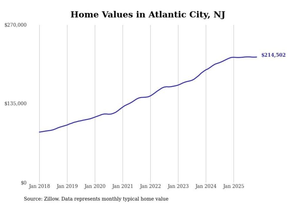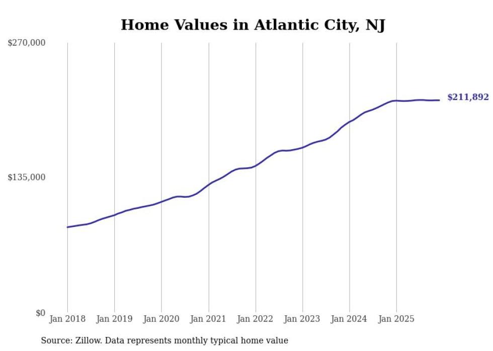 Stacker compiled a list of cities with the most expensive homes in the Atlantic City metro area using data from Zillow. Charts show the monthly typical home value since January 2018. All 18 cities and towns with data available were included in the list.