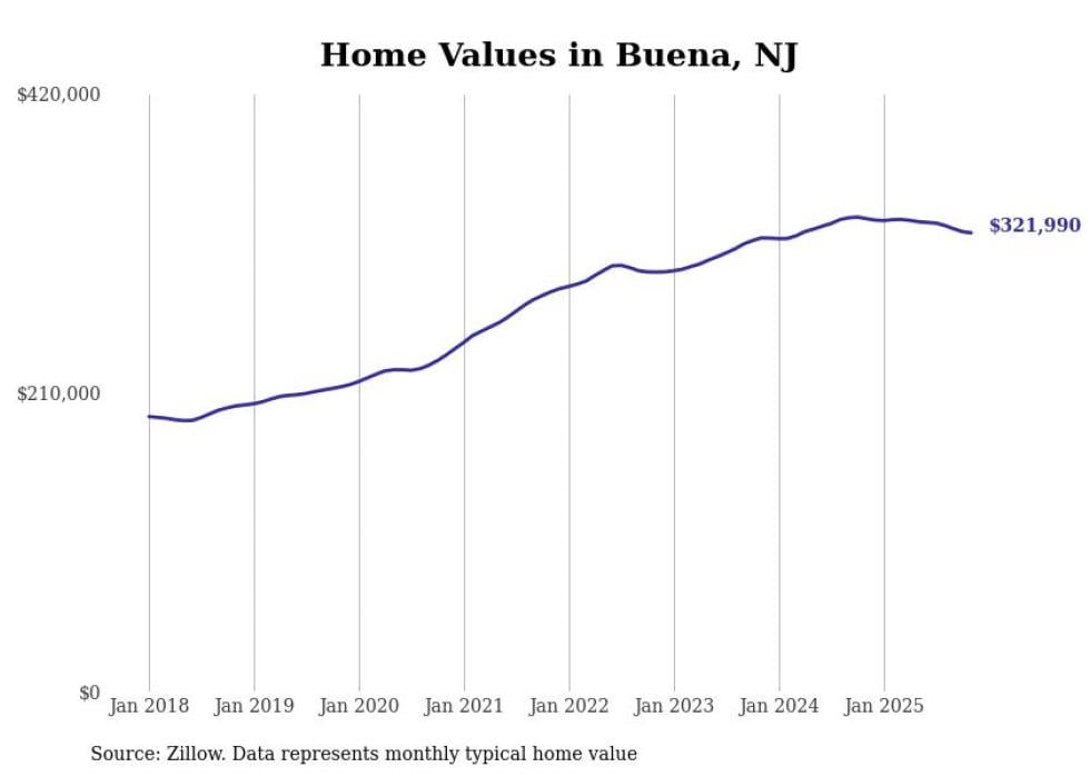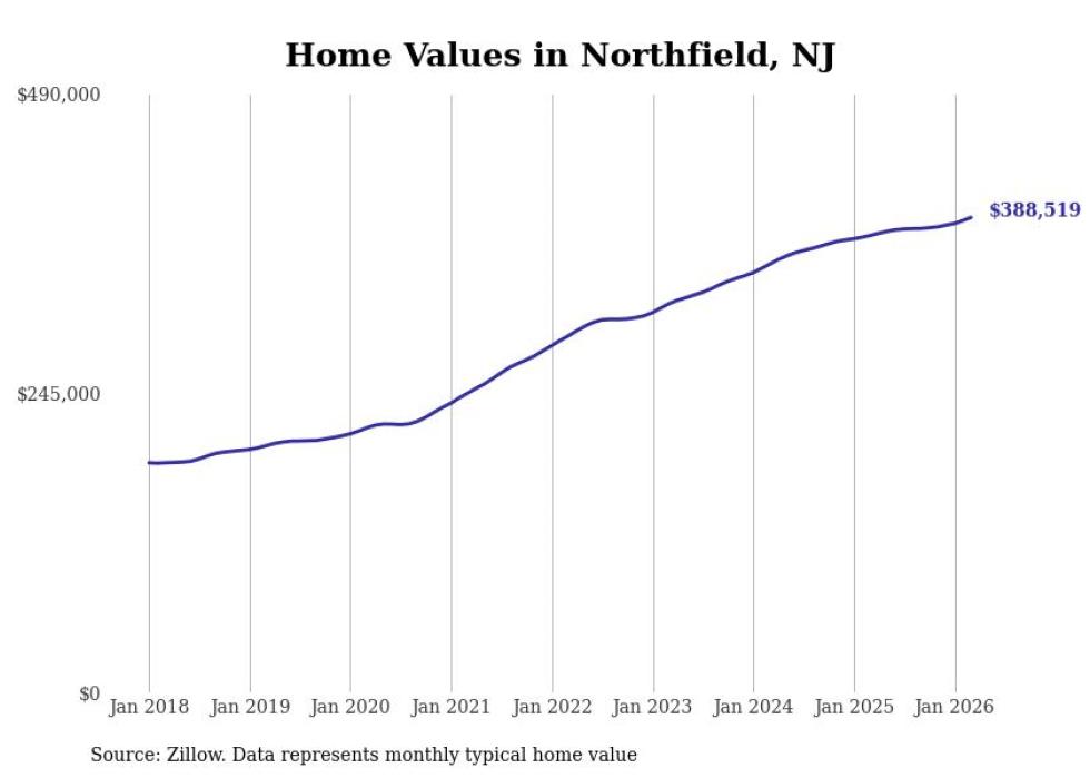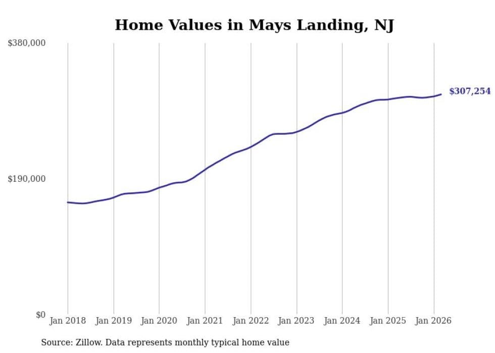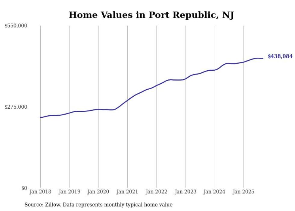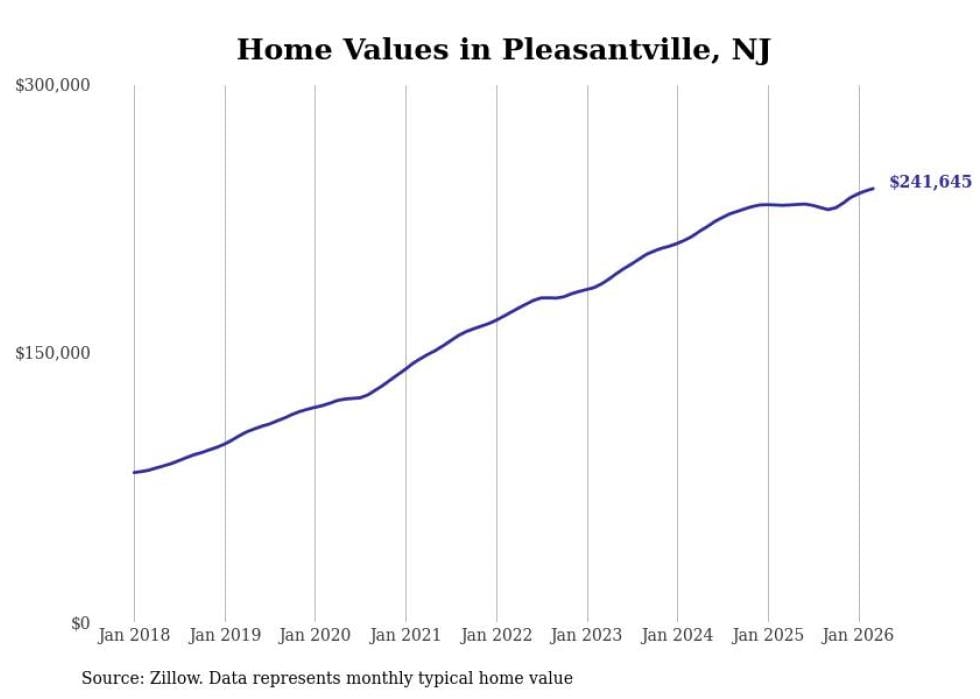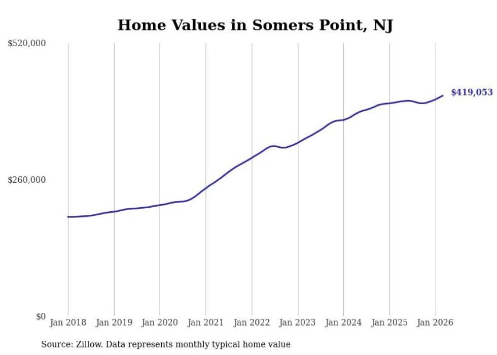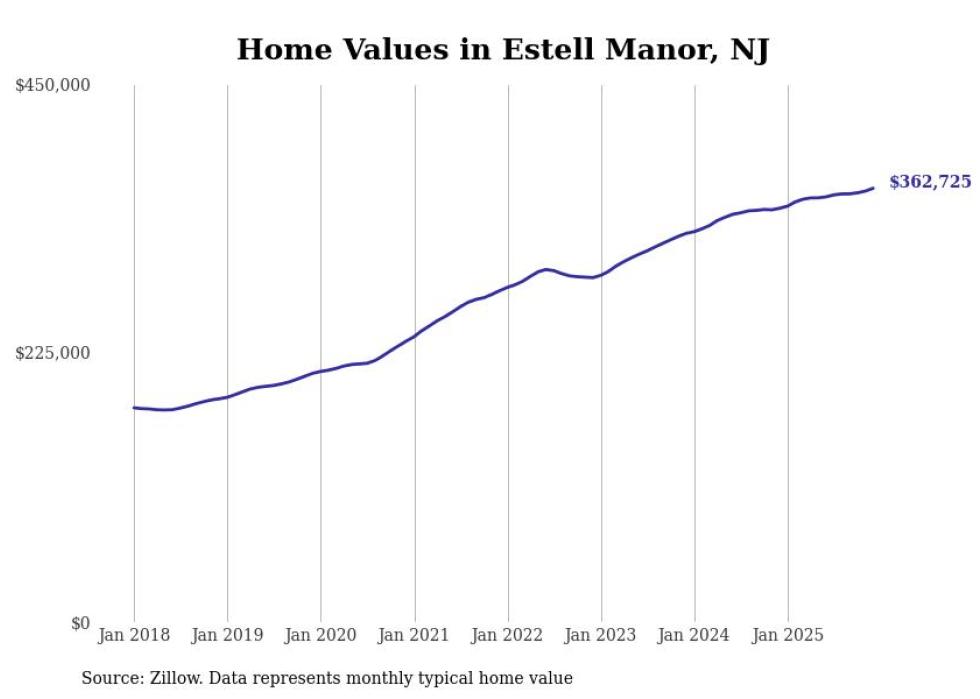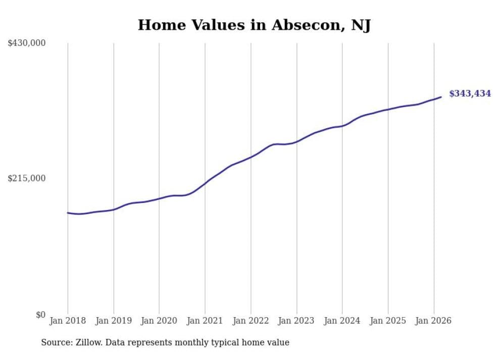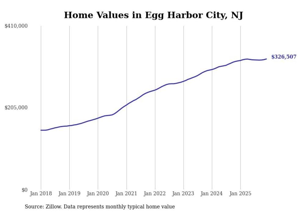 Stacker compiled a list of cities with the most expensive homes in the Atlantic City metro area using data from Zillow. Charts show the monthly typical home value since January 2018. All 18 cities and towns with data available were included in the list.