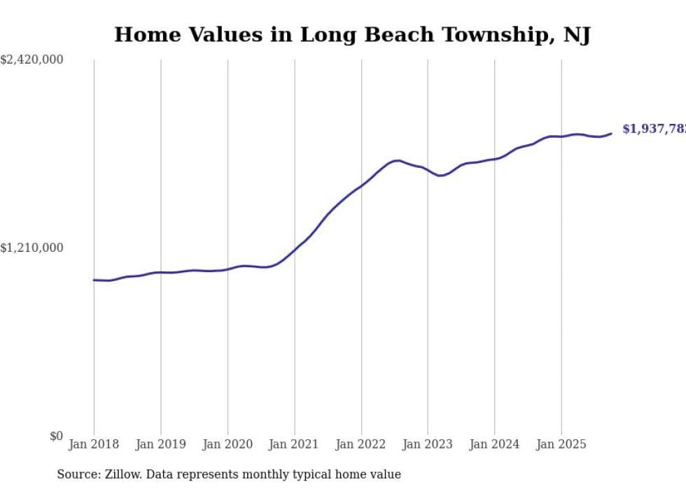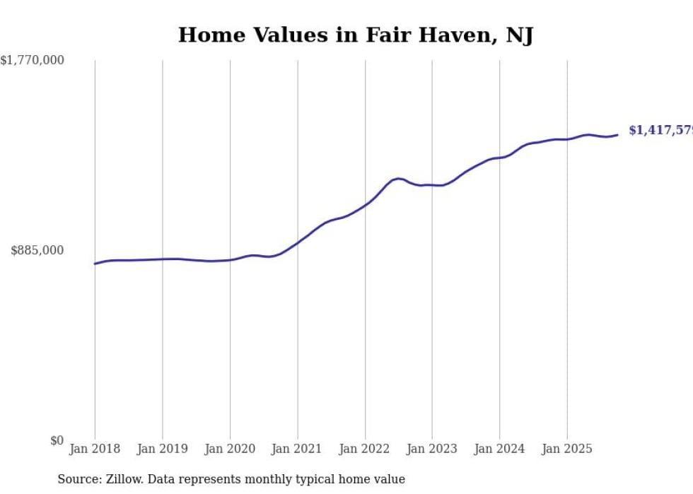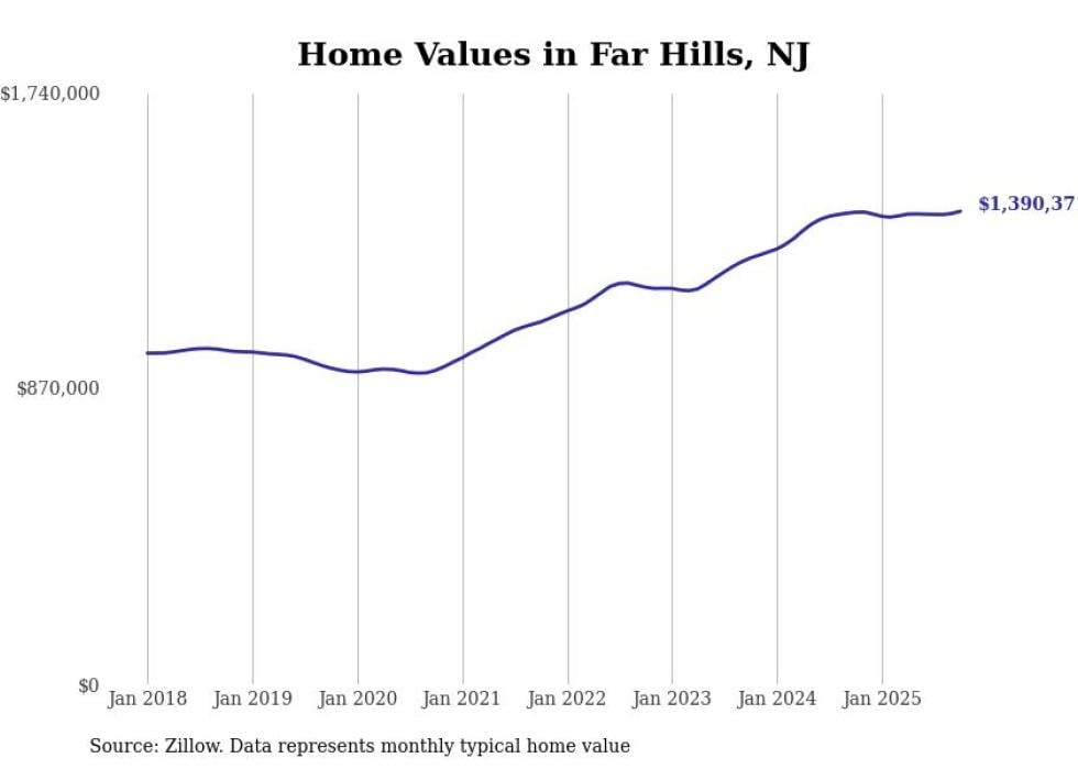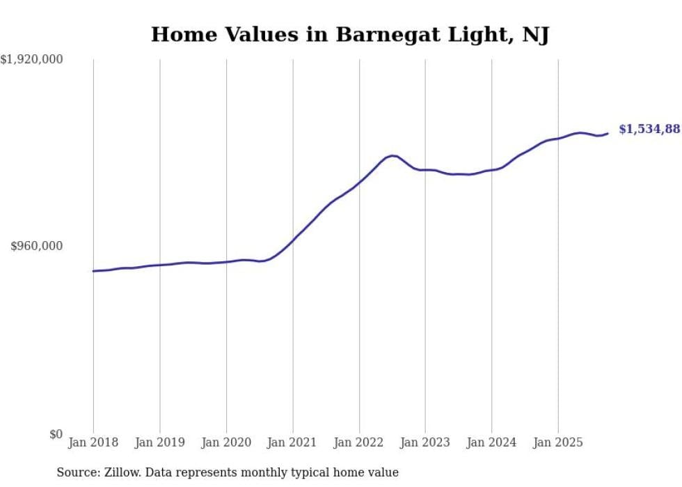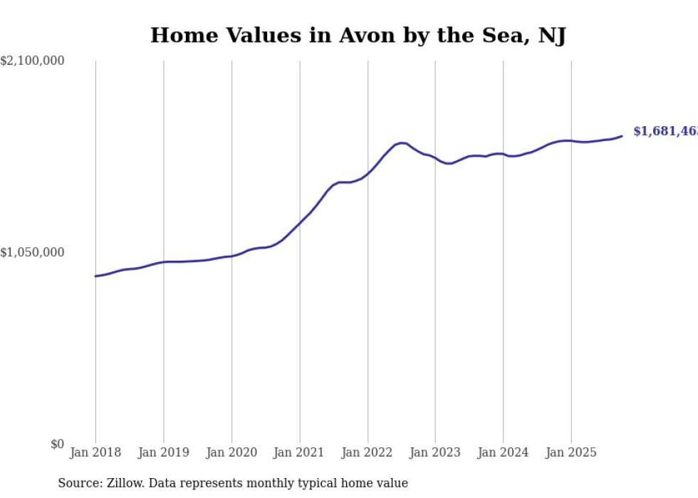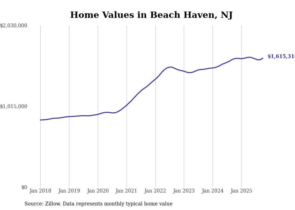 Stacker compiled a list of cities with the most expensive homes in New Jersey using data from Zillow. Cities are ranked by the Zillow Home Values Index for all homes as of October 2025. The charts in this story were created automatically using Matplotlib.