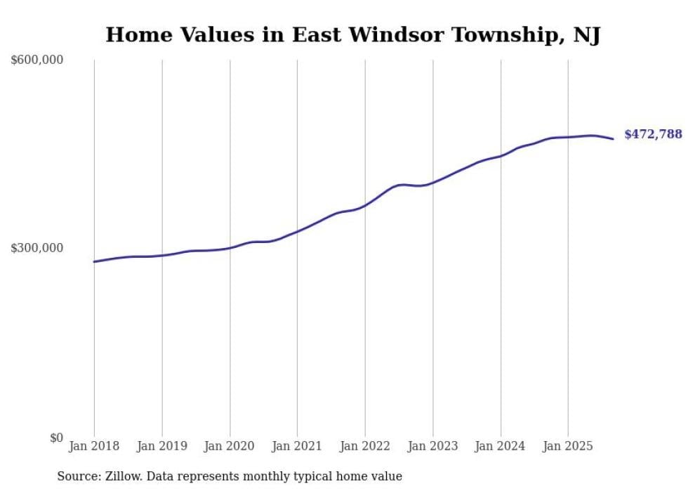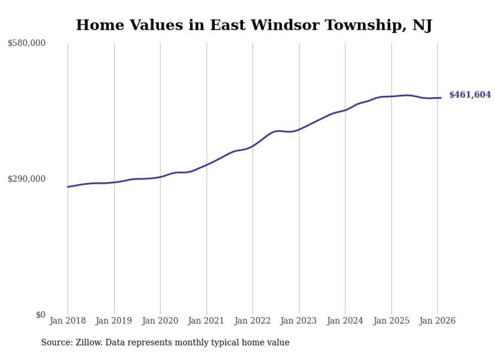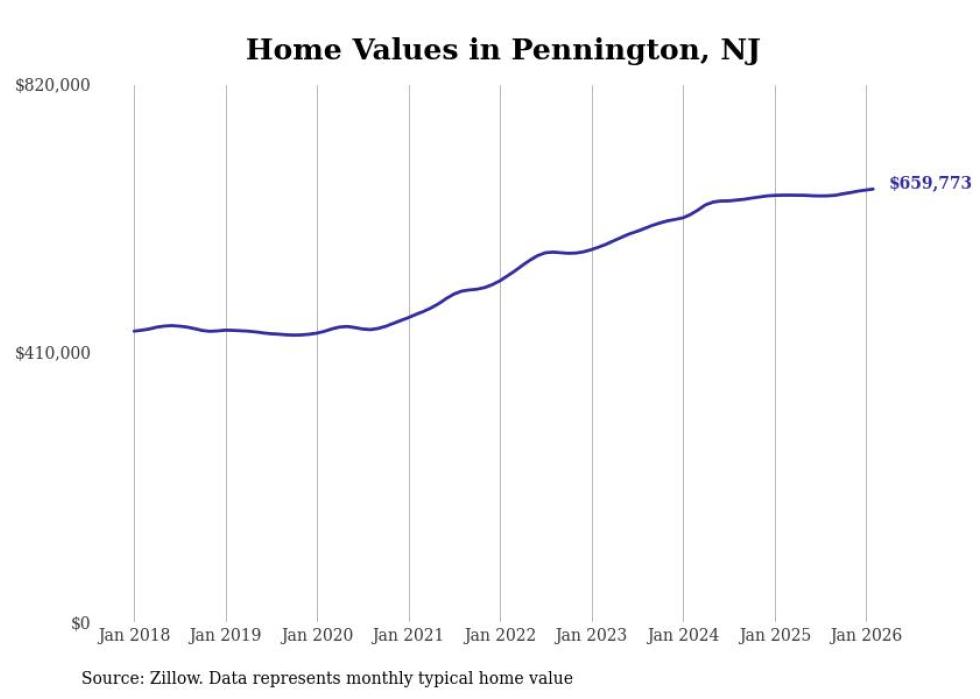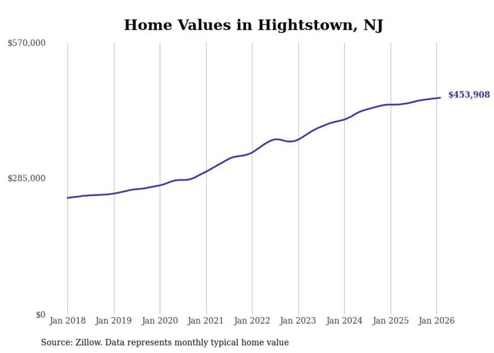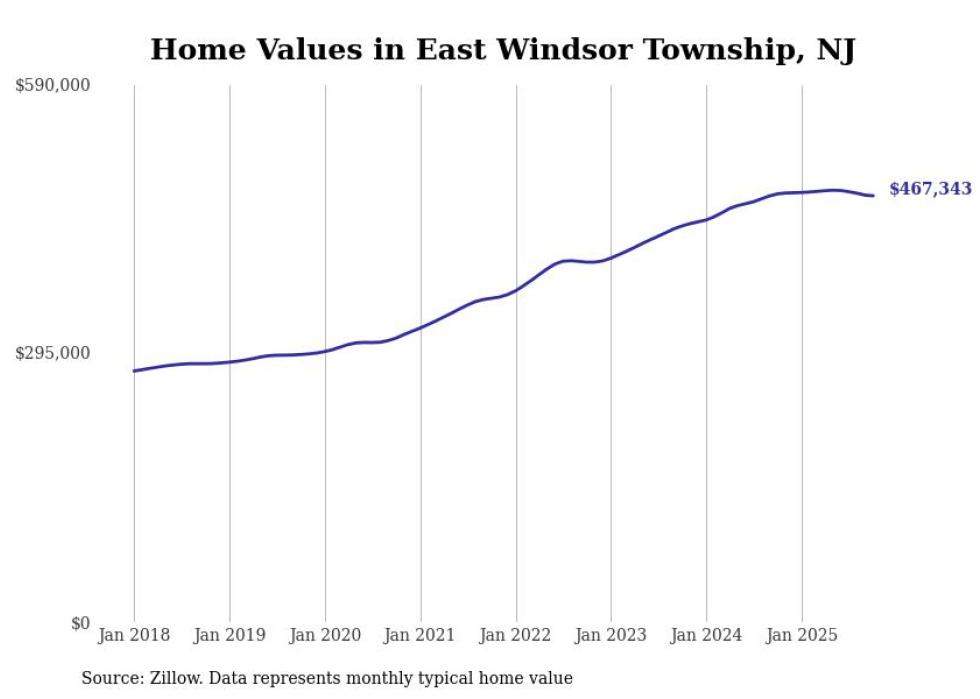 Stacker compiled a list of cities with the most expensive homes in the Trenton metro area using data from Zillow. Charts show the monthly typical home value since January 2018. All 7 cities and towns with data available were included in the list.