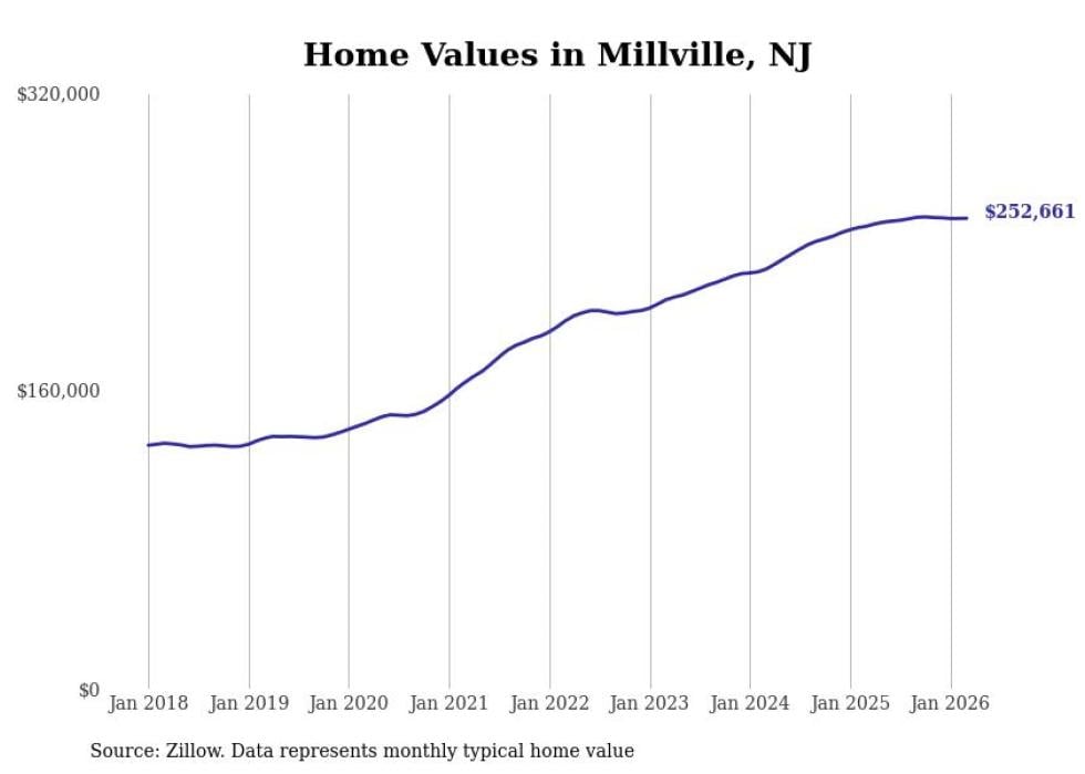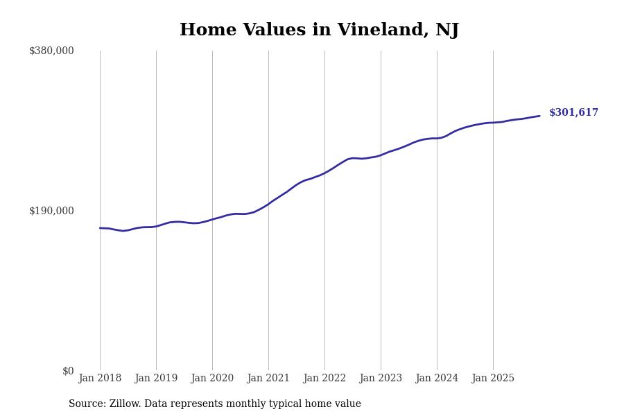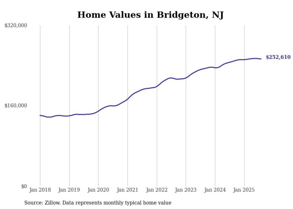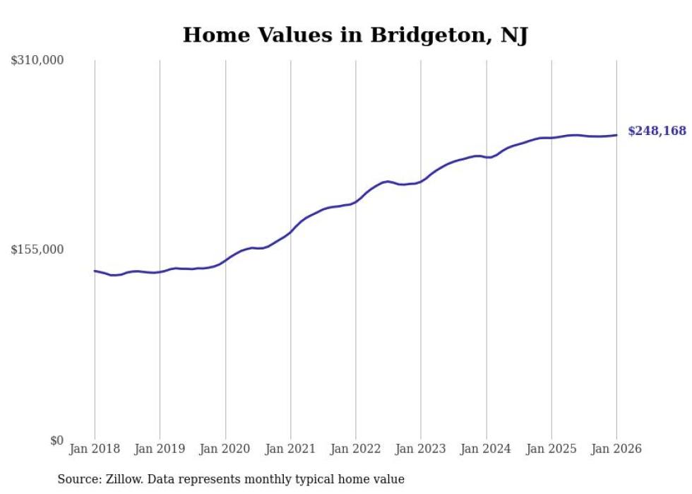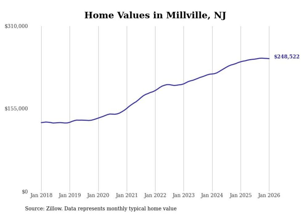 Stacker compiled a list of cities with the most expensive homes in the Vineland-Bridgeton, NJ metro area using data from Zillow. Charts show the monthly typical home value since January 2018.