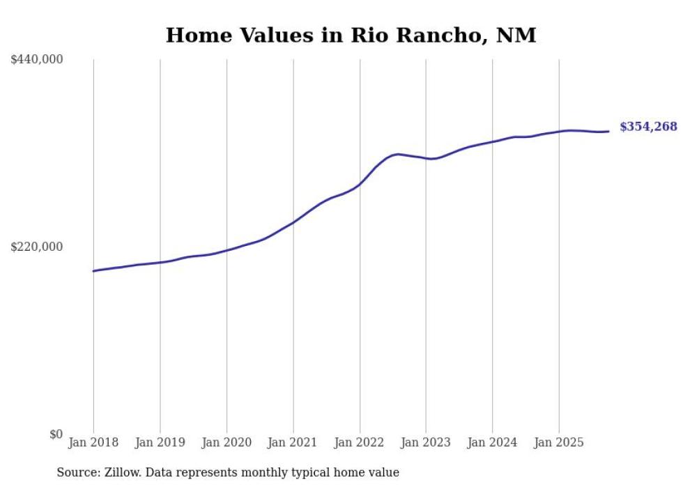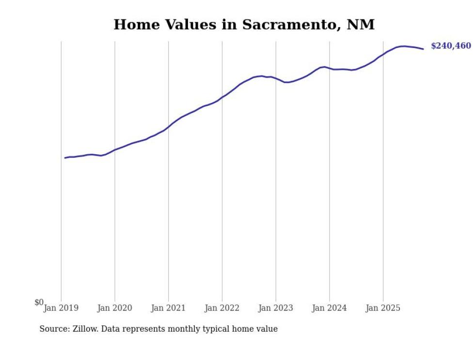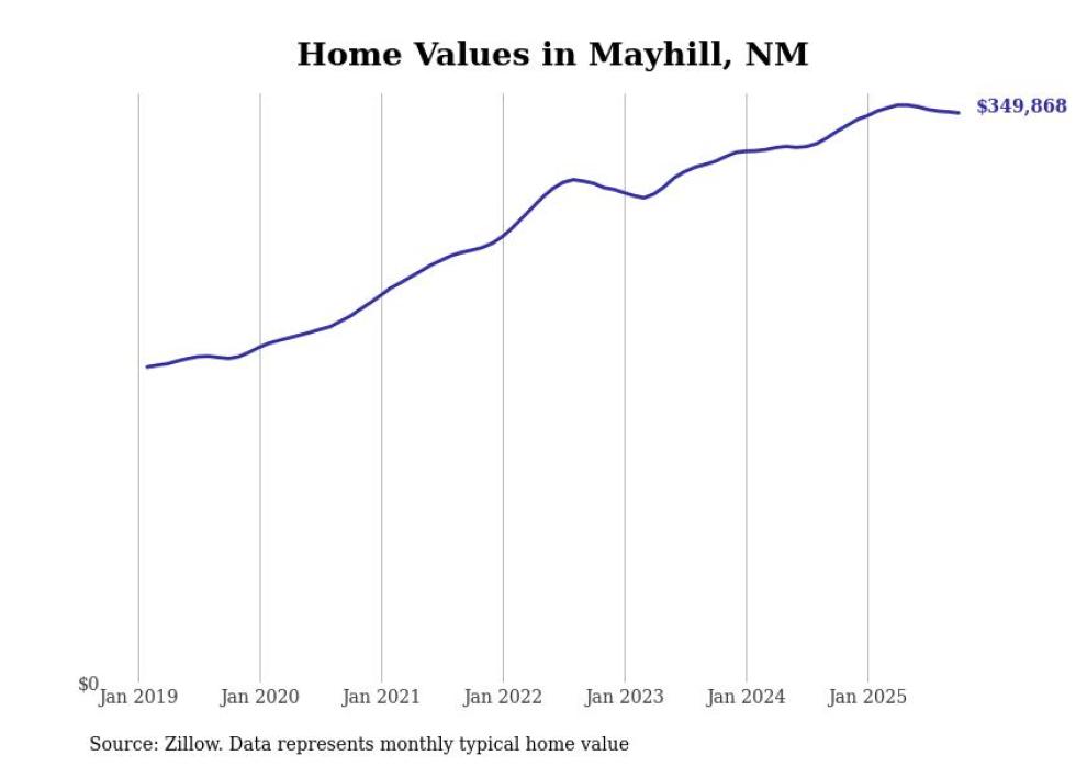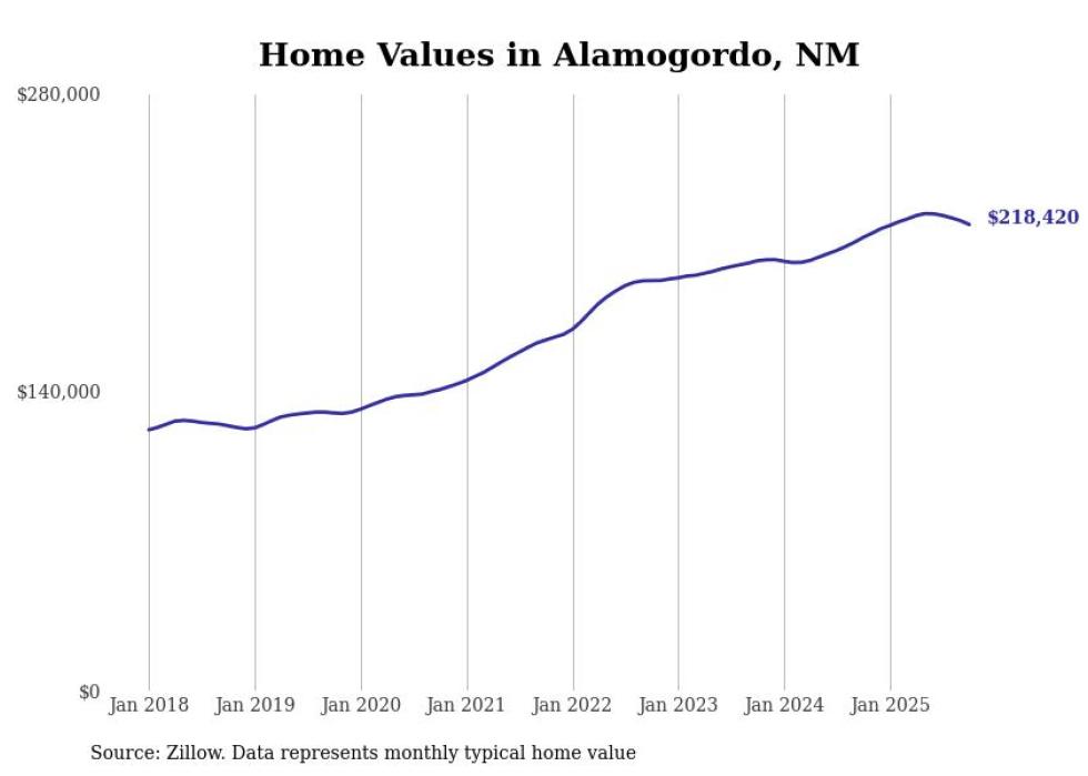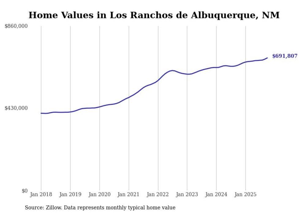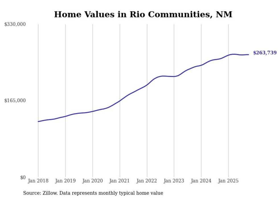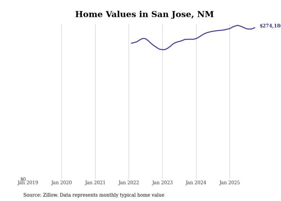 Stacker compiled a list of cities with the fastest-growing home prices in New Mexico using data from Zillow. Cities are ranked by the dollar change in the Zillow Home Values Index for all homes from the 12 months ending October 2025. The charts in this story were created automatically using Matplotlib. Data was available for 50 cities and towns in New Mexico.