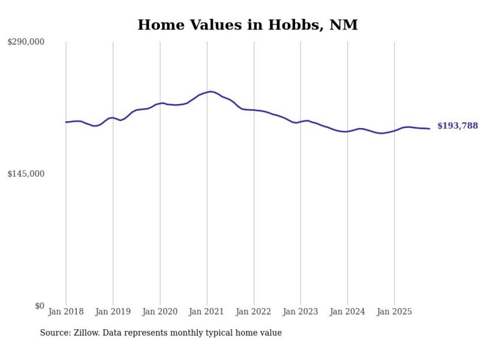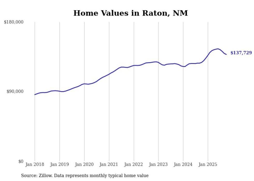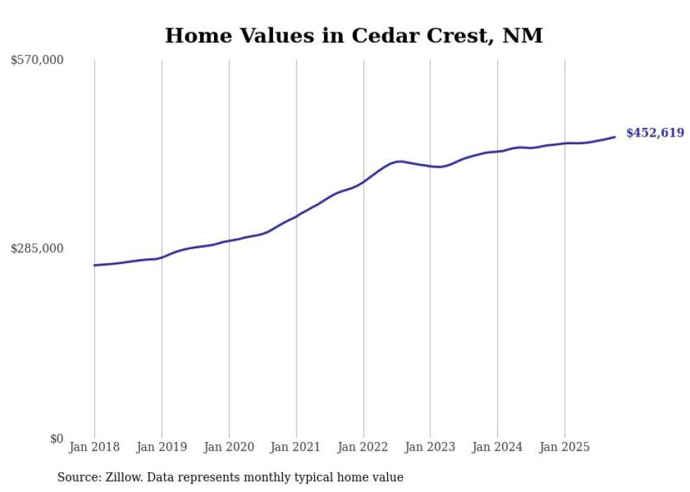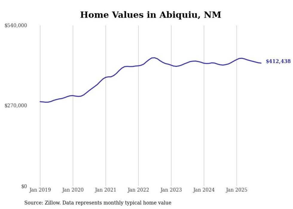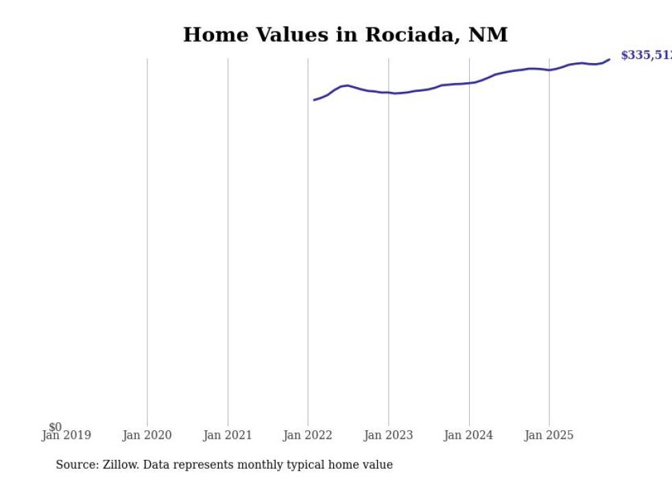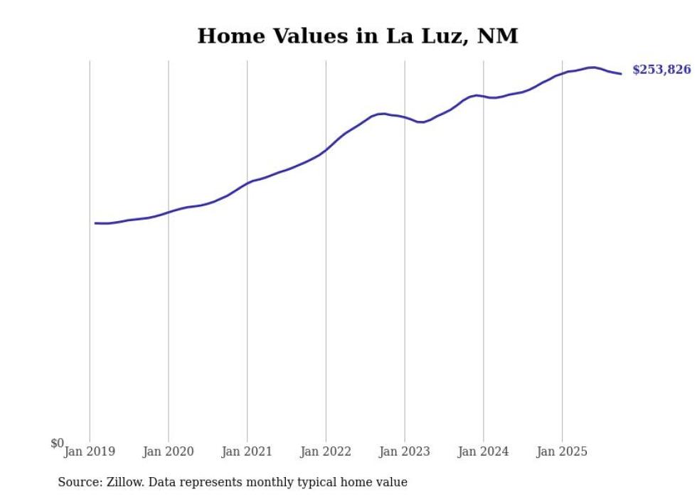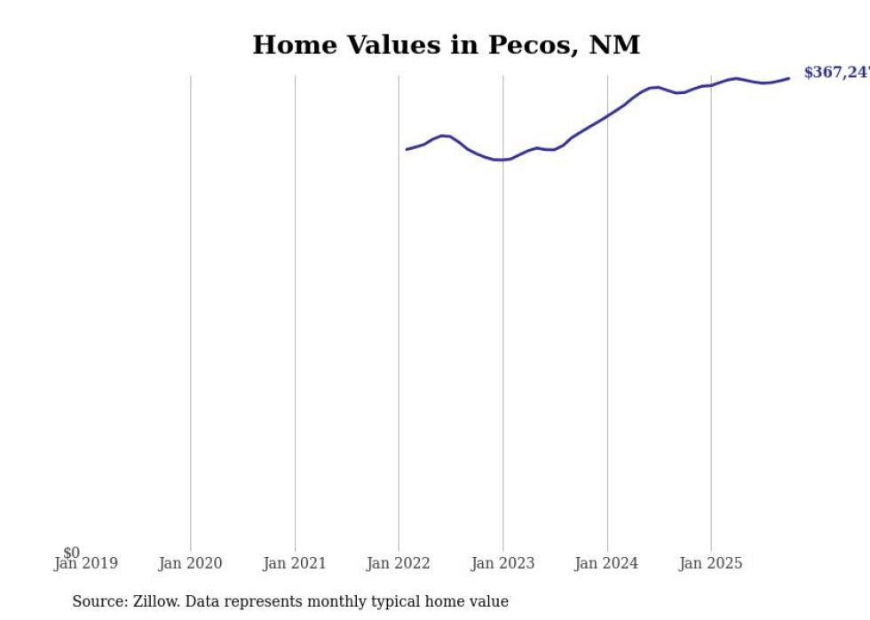 Stacker compiled a list of cities with the fastest-growing home prices in New Mexico using data from Zillow. Cities are ranked by the dollar change in the Zillow Home Values Index for all homes from the 12 months ending October 2025. The charts in this story were created automatically using Matplotlib. Data was available for 50 cities and towns in New Mexico.