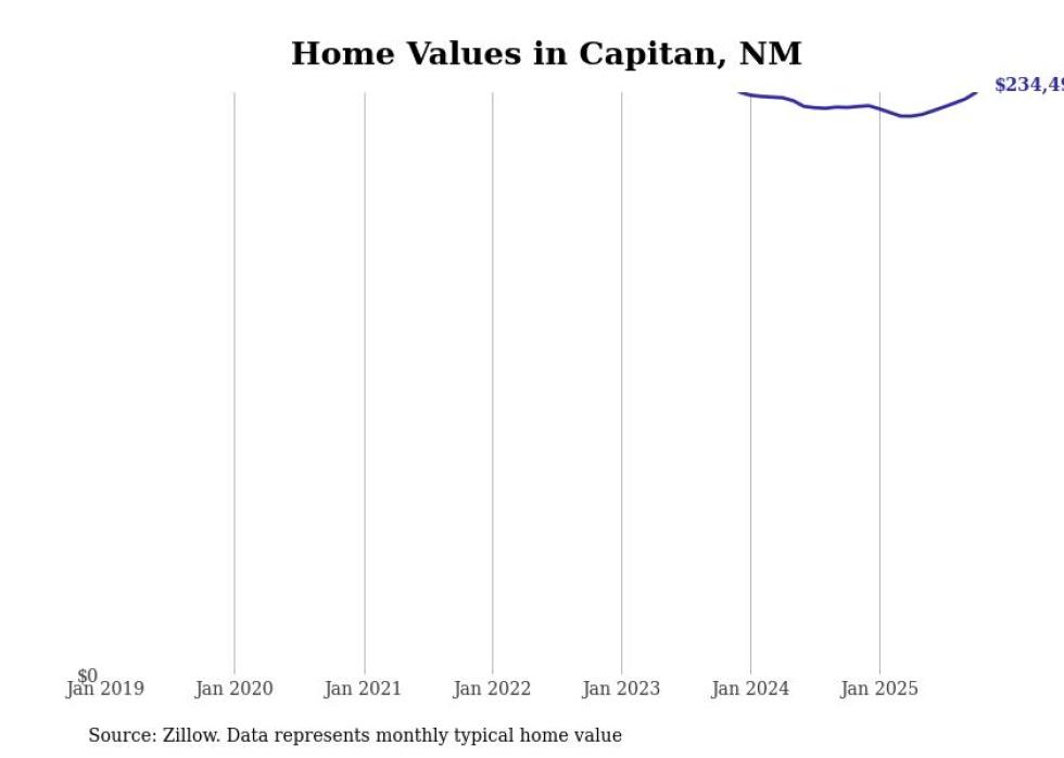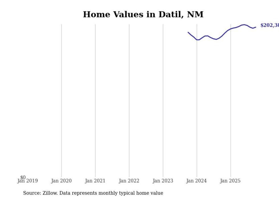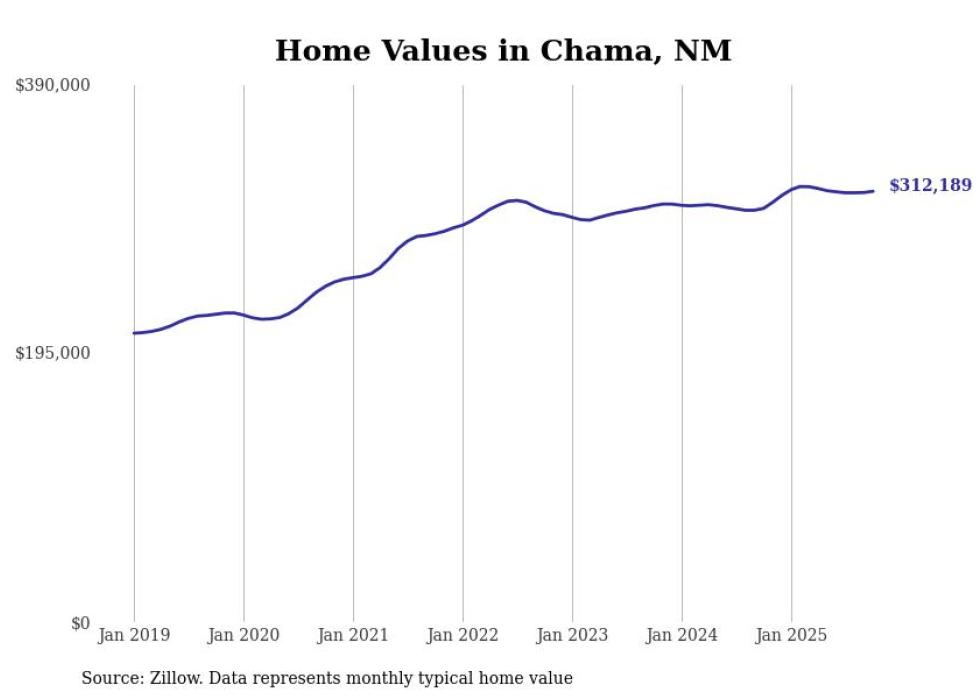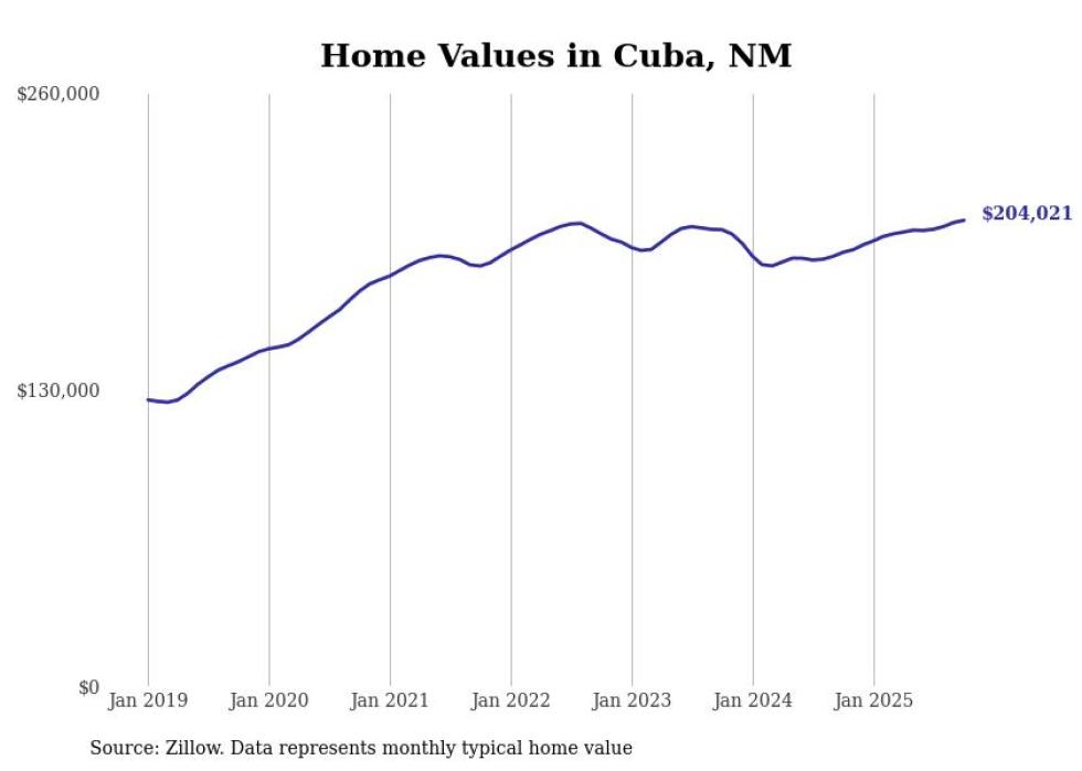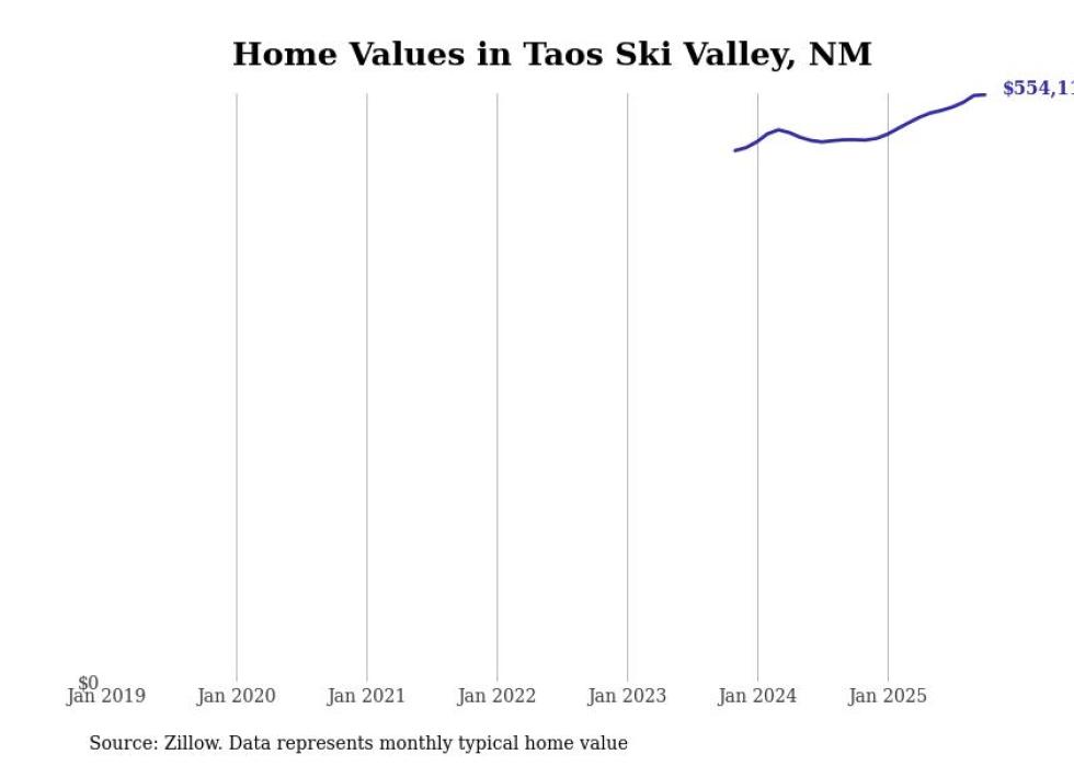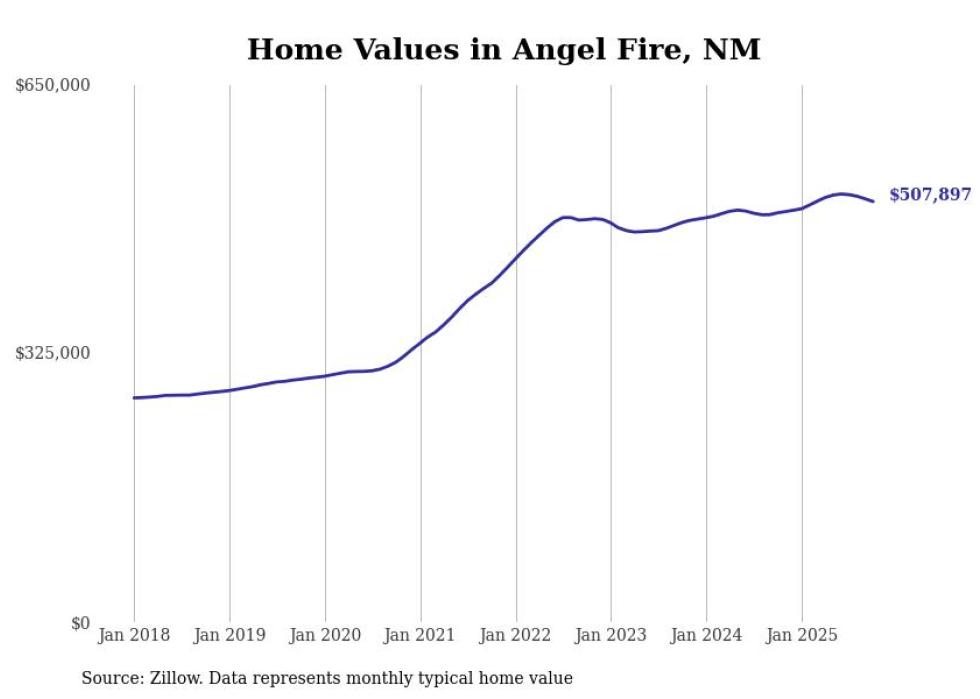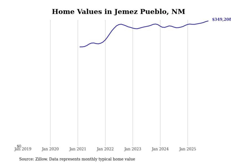 Stacker compiled a list of cities with the fastest-growing home prices in New Mexico using data from Zillow. Cities are ranked by the dollar change in the Zillow Home Values Index for all homes from the 12 months ending October 2025. The charts in this story were created automatically using Matplotlib. Data was available for 50 cities and towns in New Mexico.