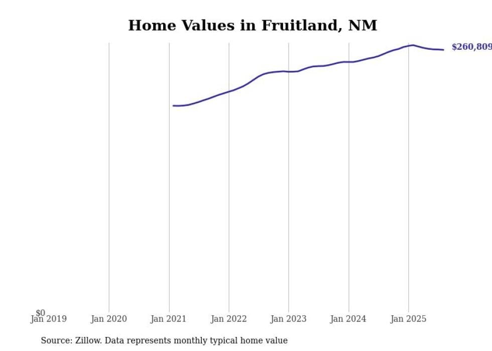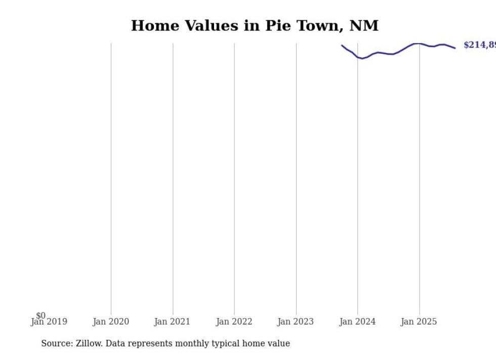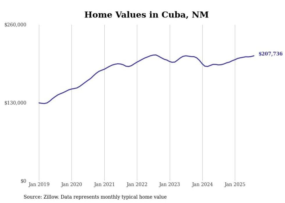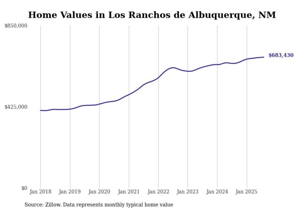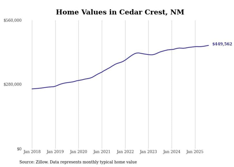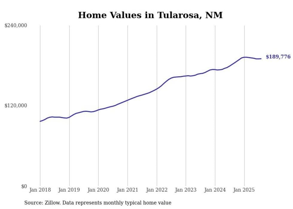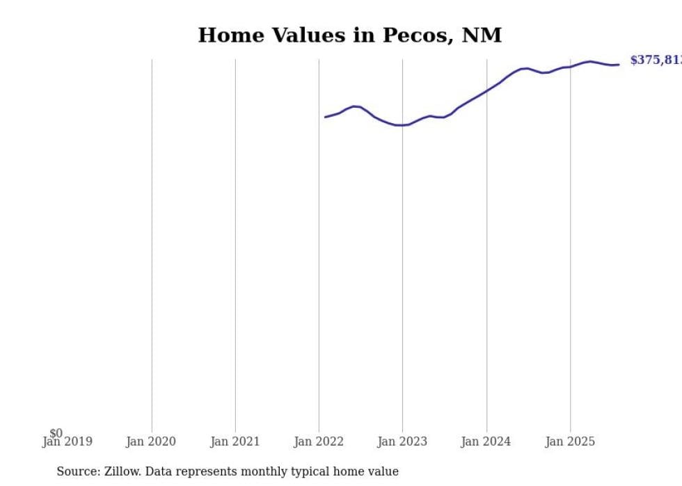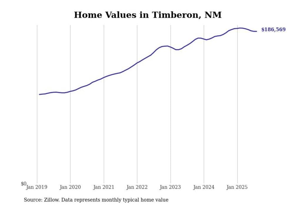 Stacker compiled a list of cities with the fastest-growing home prices in New Mexico using data from Zillow. Cities are ranked by the dollar change in the Zillow Home Values Index for all homes from the 12 months ending August 2025. The charts in this story were created automatically using Matplotlib. Data was available for 50 cities and towns in New Mexico.