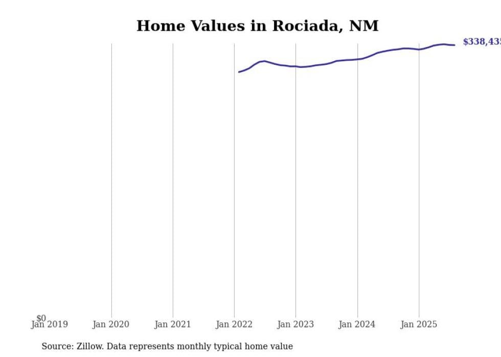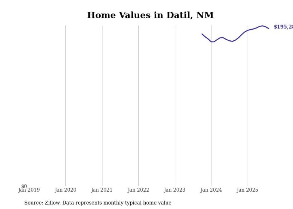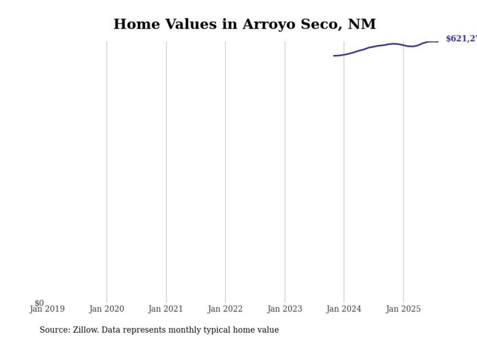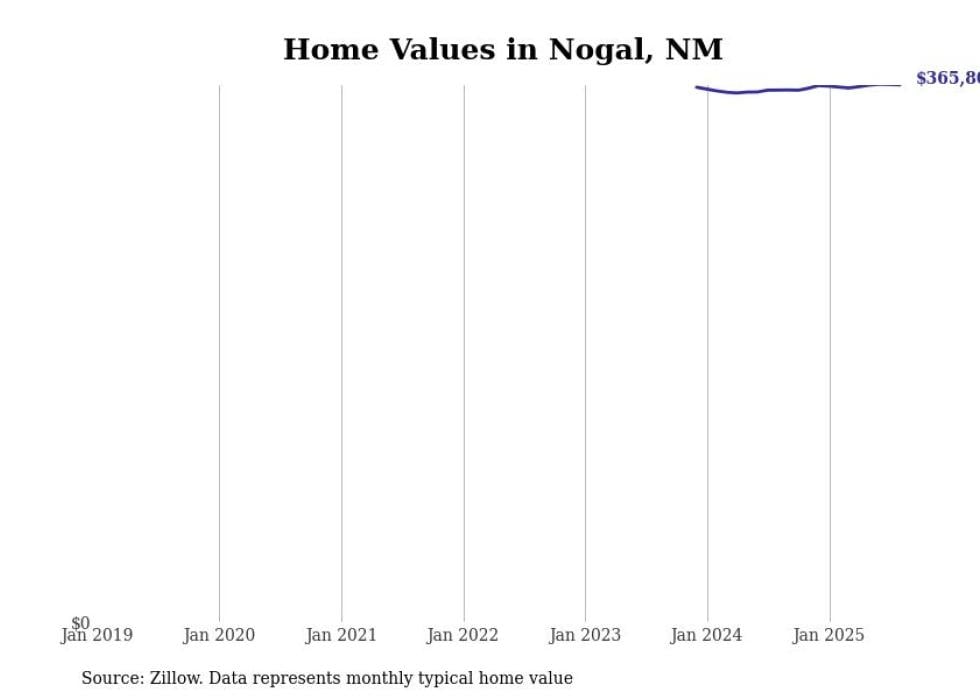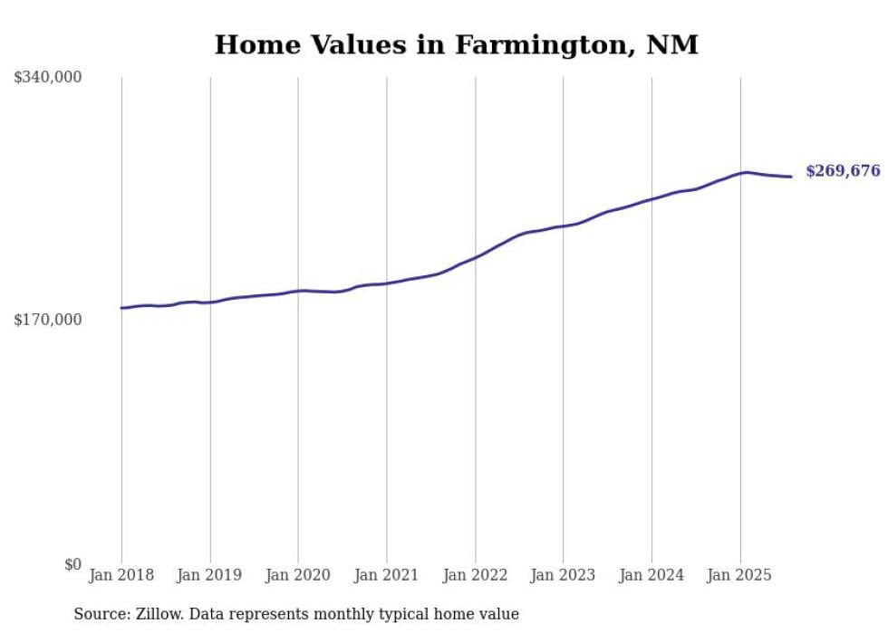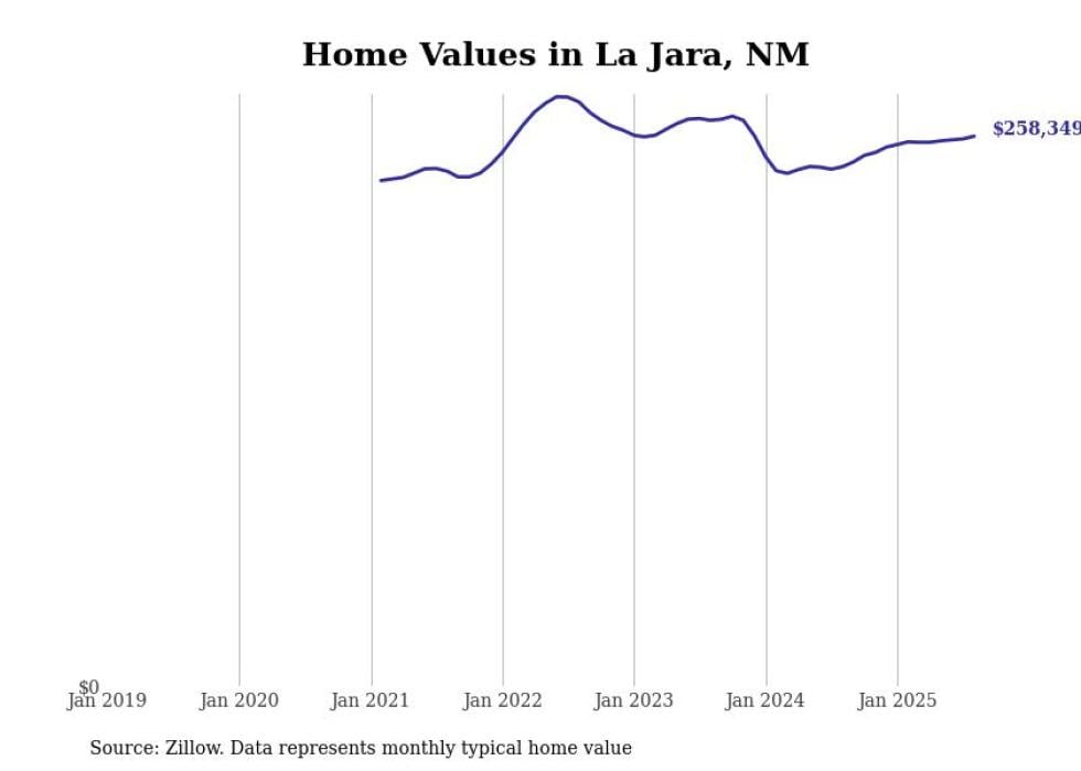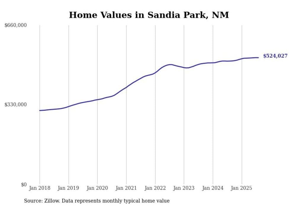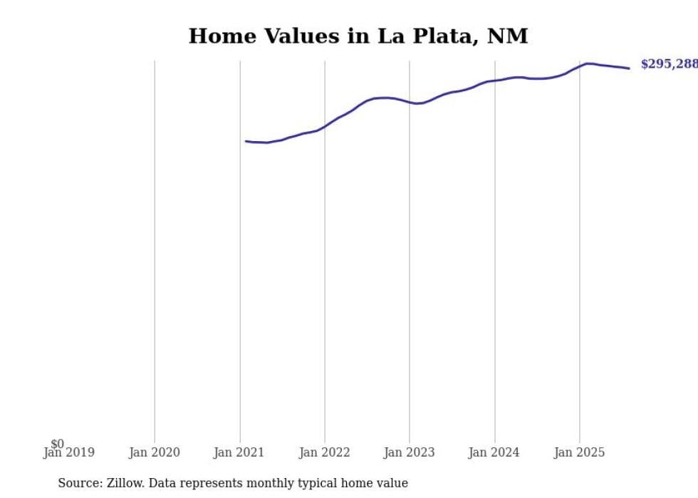 Stacker compiled a list of cities with the fastest-growing home prices in New Mexico using data from Zillow. Cities are ranked by the dollar change in the Zillow Home Values Index for all homes from the 12 months ending August 2025. The charts in this story were created automatically using Matplotlib. Data was available for 50 cities and towns in New Mexico.