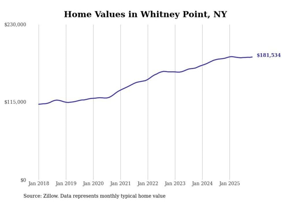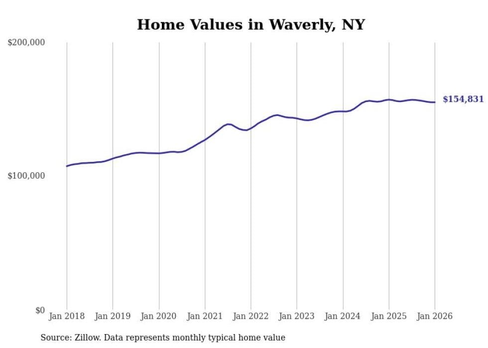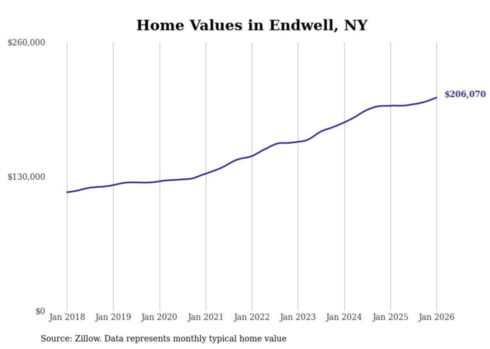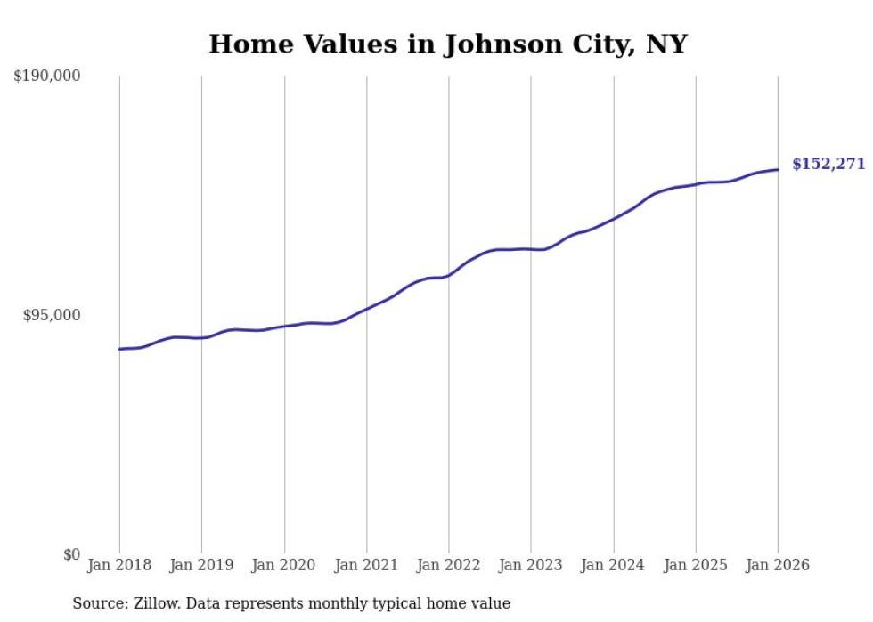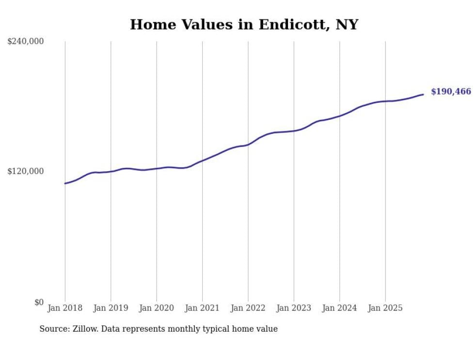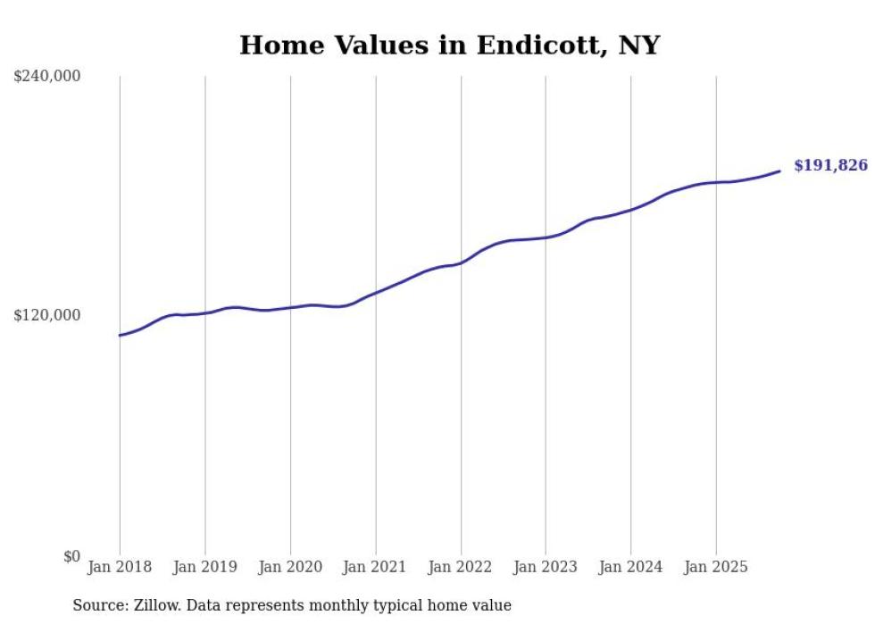 Stacker compiled a list of cities with the most expensive homes in the Binghamton metro area using data from Zillow. Charts show the monthly typical home value since January 2018. All 6 cities and towns with data available were included in the list.