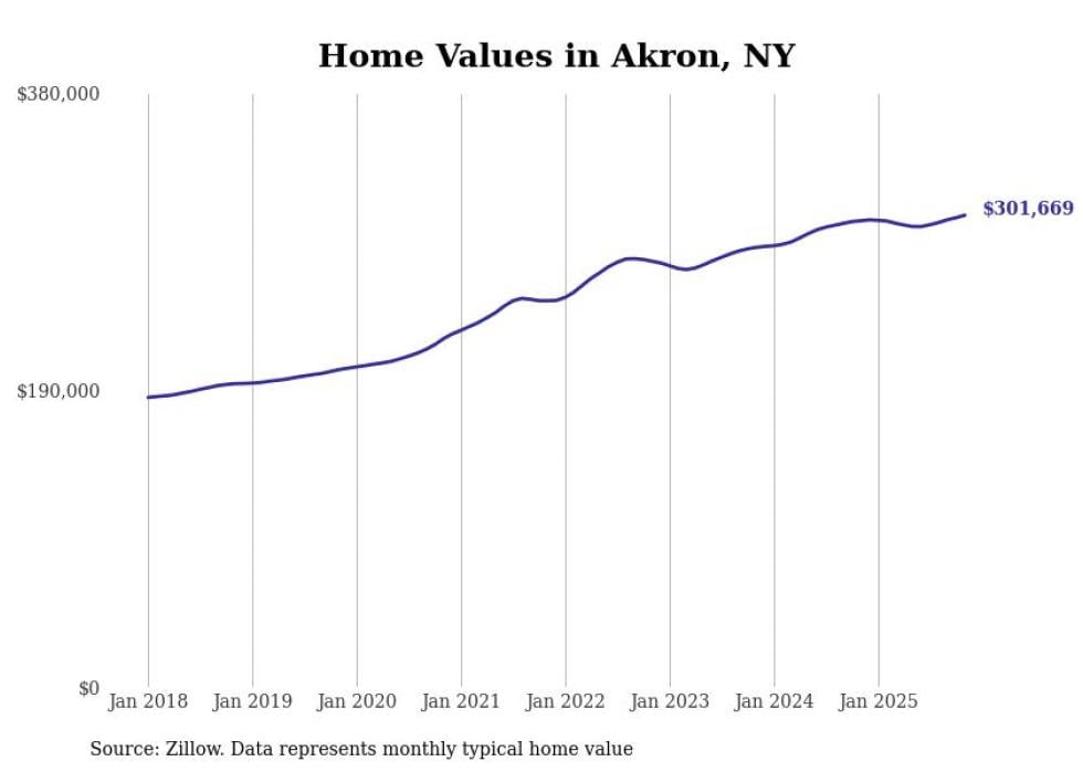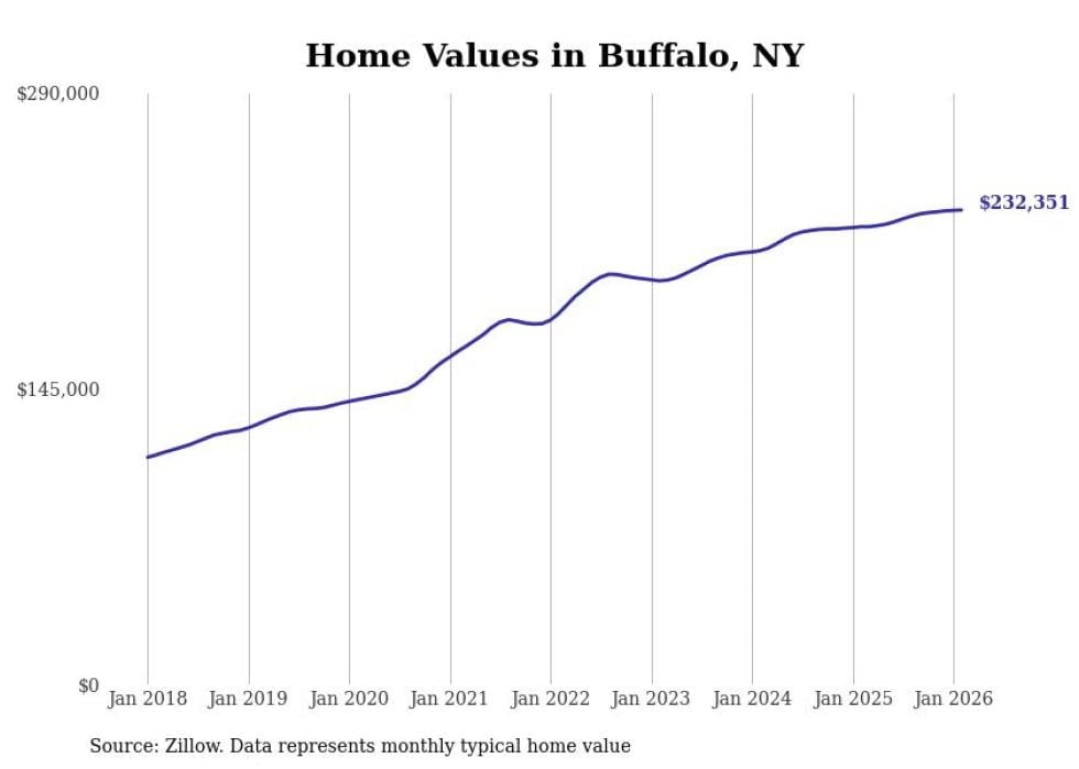 Stacker compiled a list of cities with the most expensive homes in the Buffalo metro area using data from Zillow. Charts show the monthly typical home value since January 2018. All 23 cities and towns with data available were included in the list.