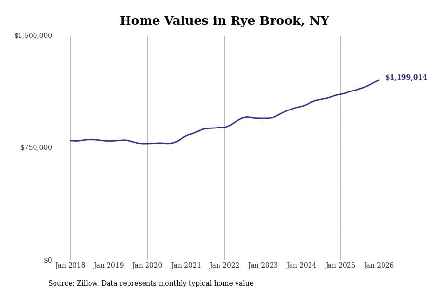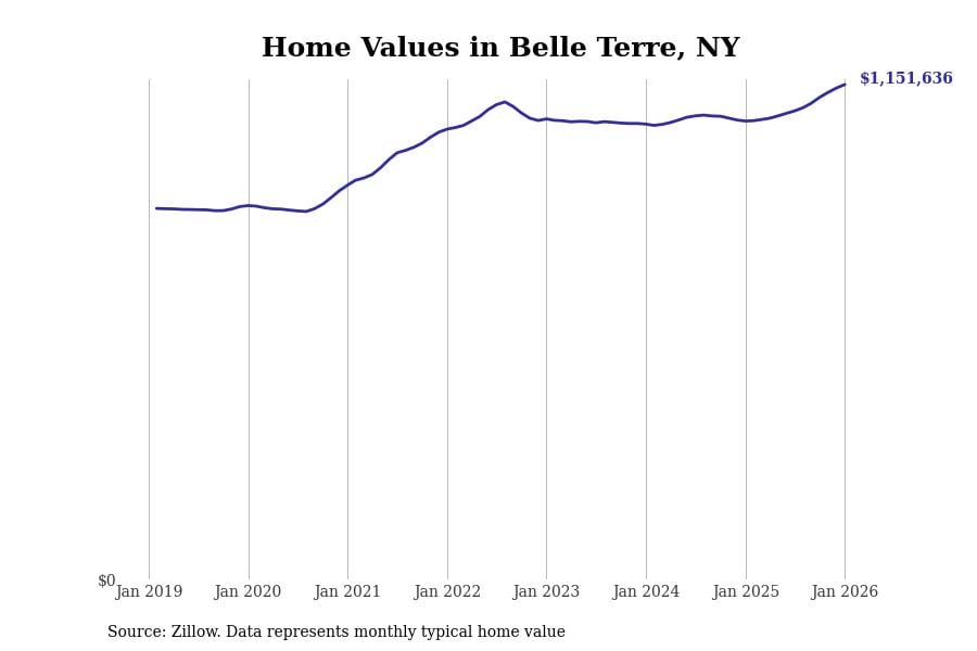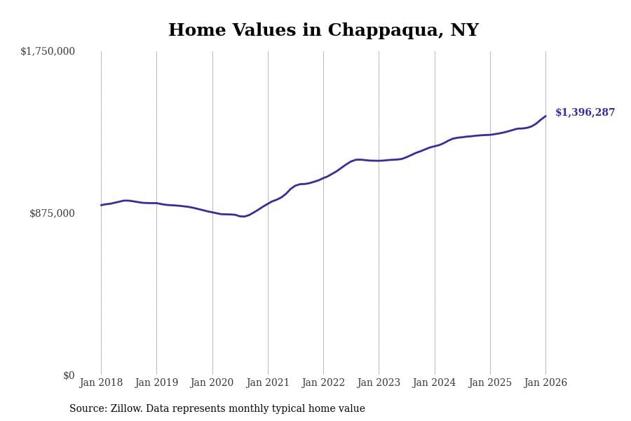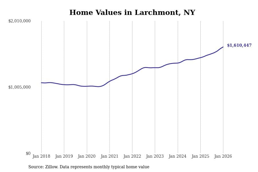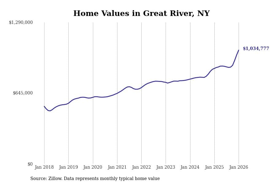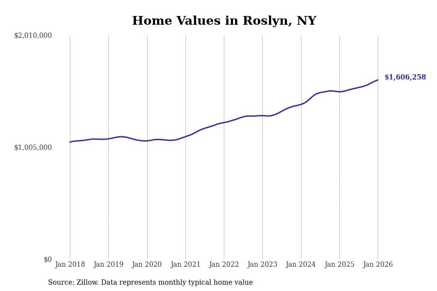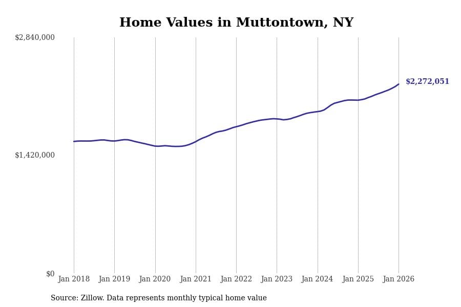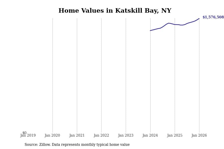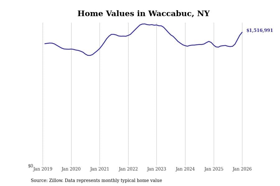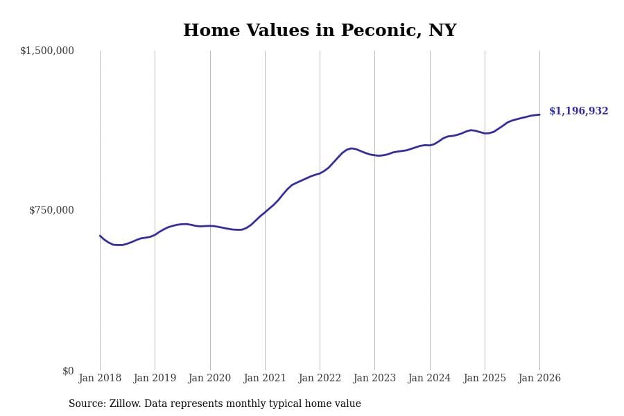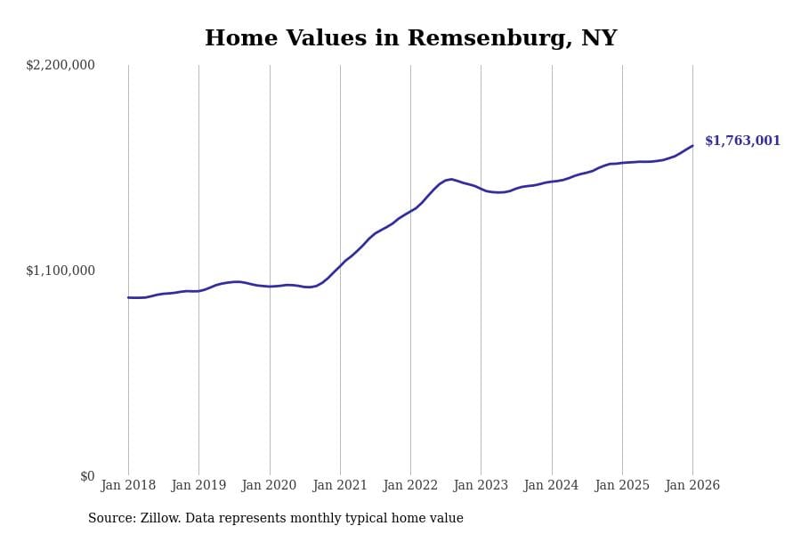 Stacker compiled a list of cities with the fastest-growing home prices in New York using data from Zillow. Cities are ranked by the dollar change in the Zillow Home Values Index for all homes from the 12 months ending January 2026. The charts in this story were created automatically using Matplotlib. Data was available for 50 cities and towns in New York.