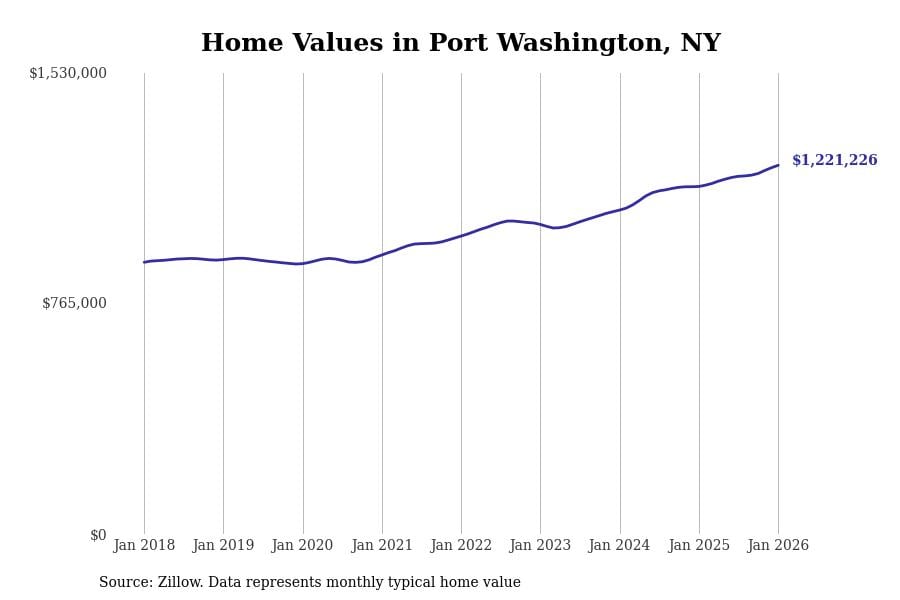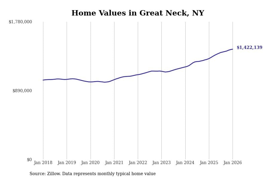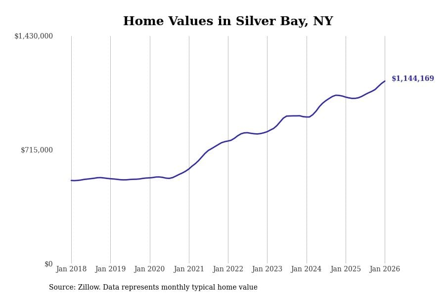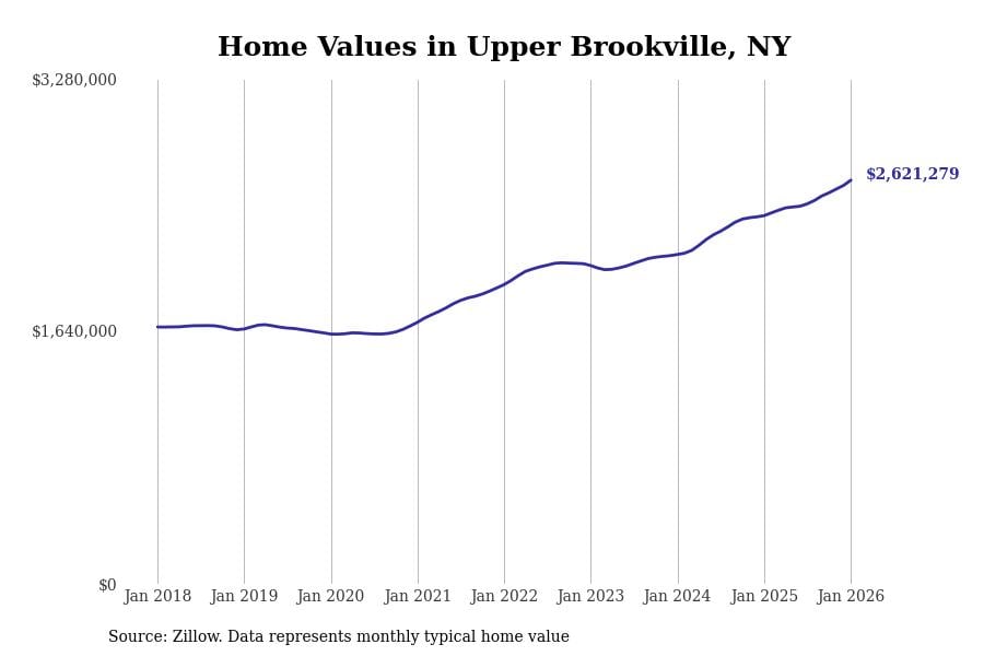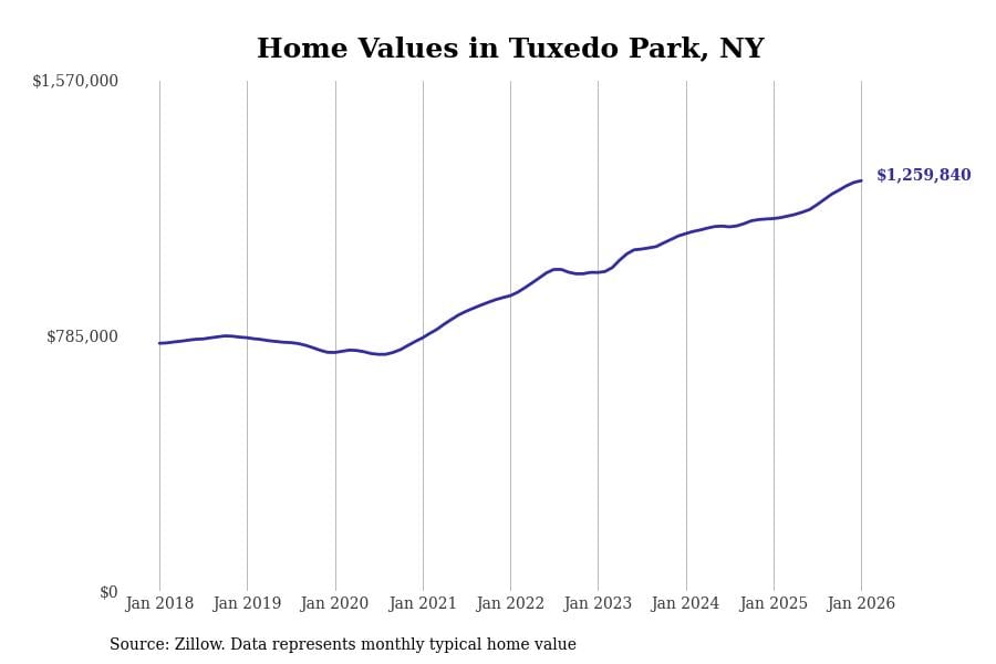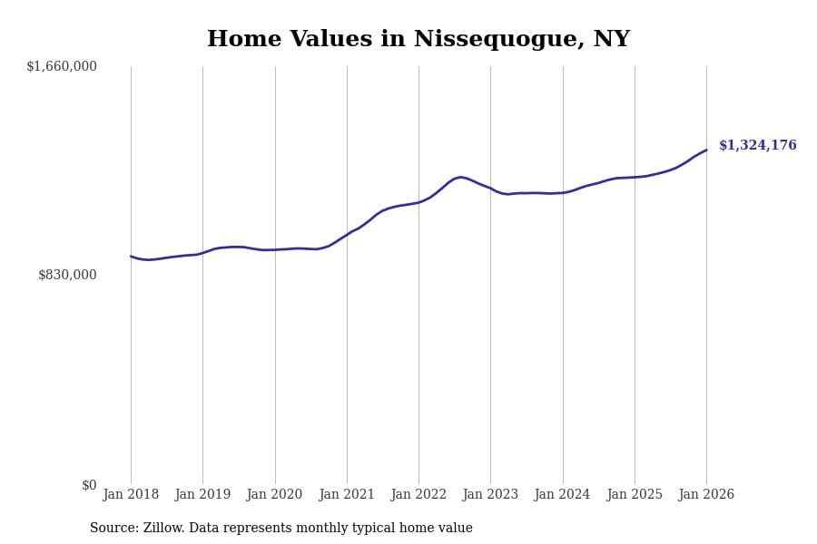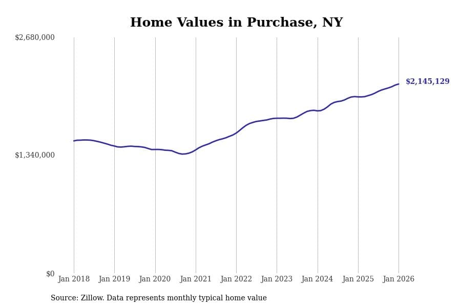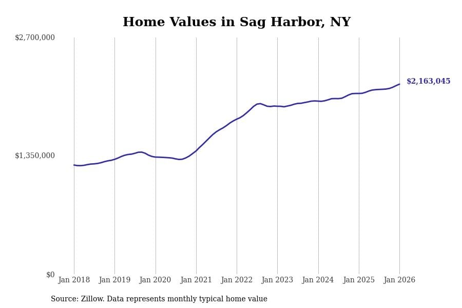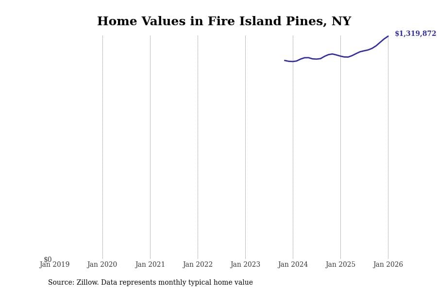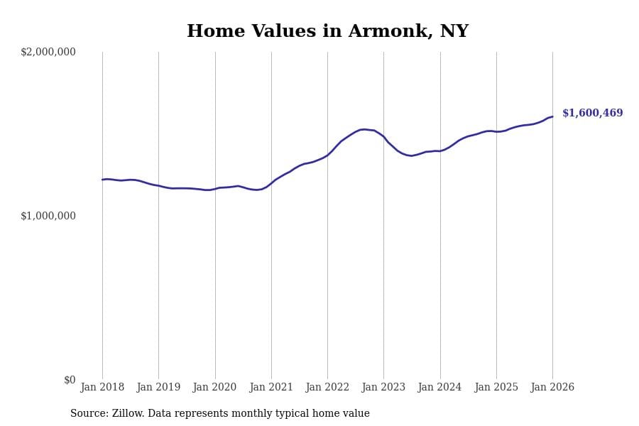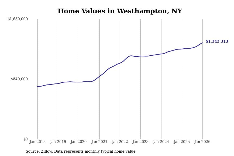 Stacker compiled a list of cities with the fastest-growing home prices in New York using data from Zillow. Cities are ranked by the dollar change in the Zillow Home Values Index for all homes from the 12 months ending January 2026. The charts in this story were created automatically using Matplotlib. Data was available for 50 cities and towns in New York.