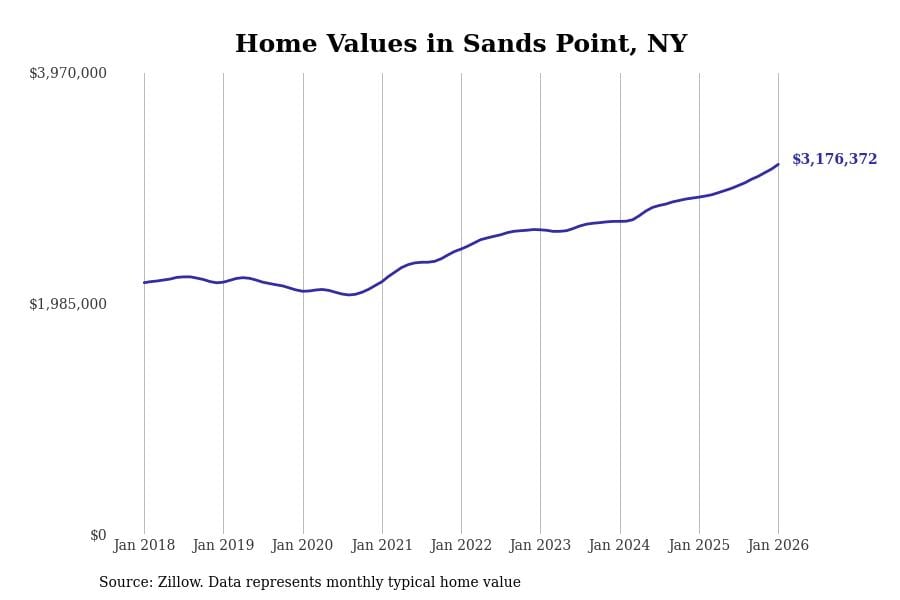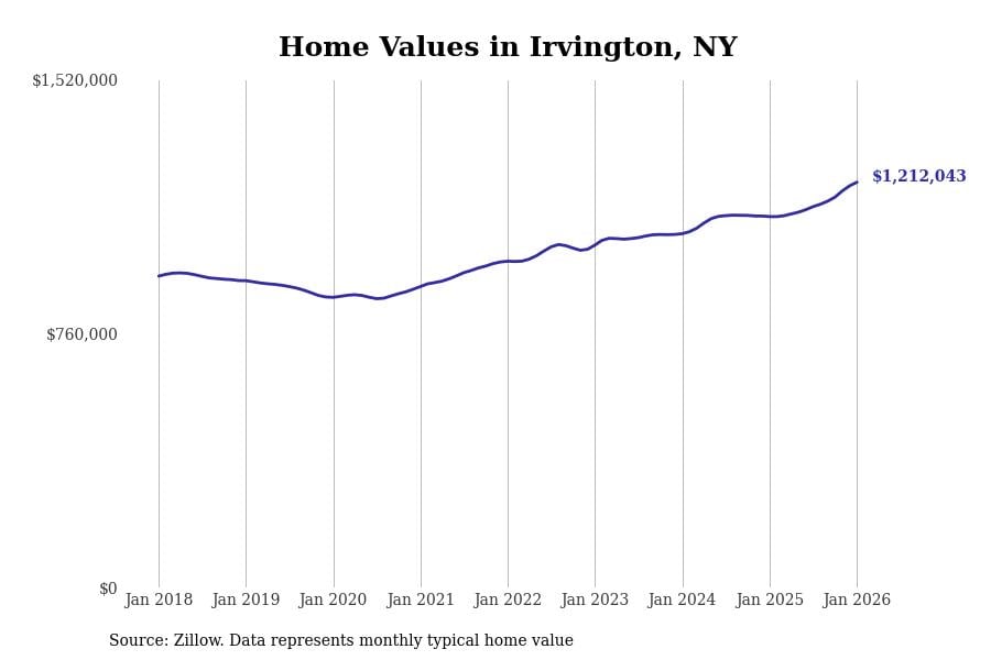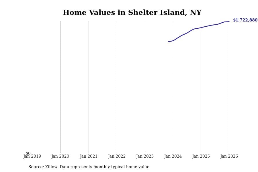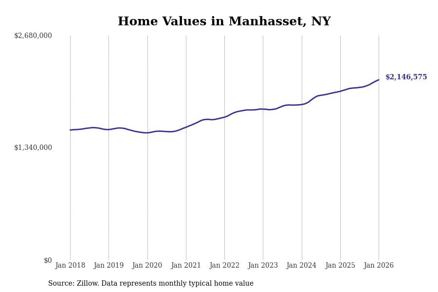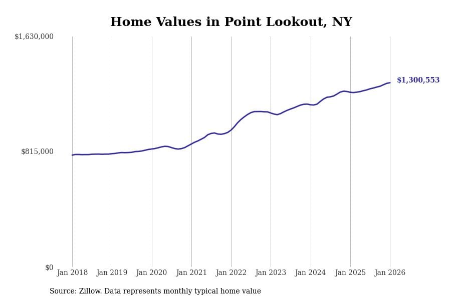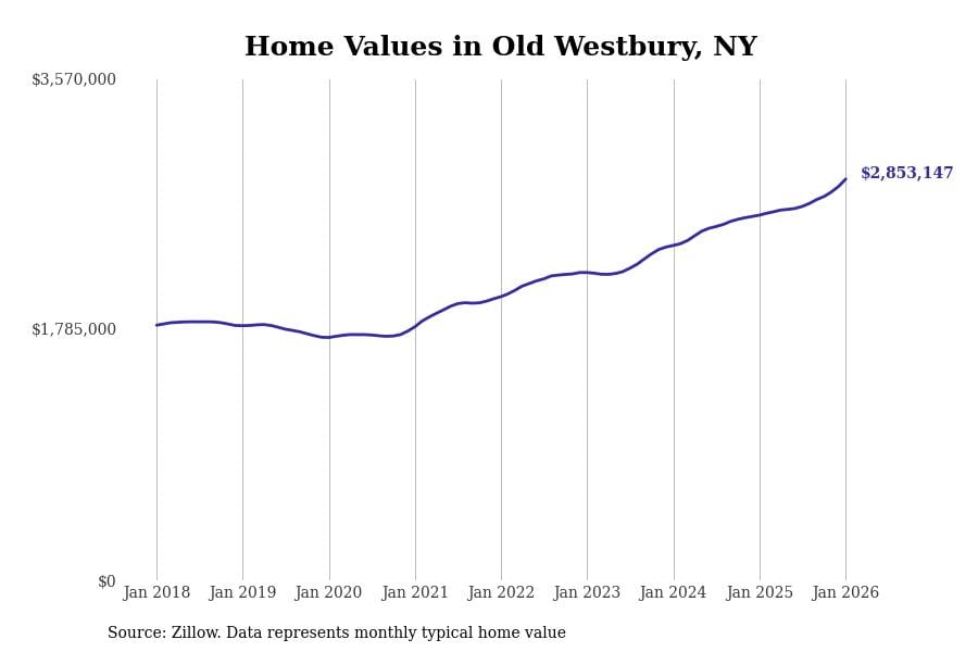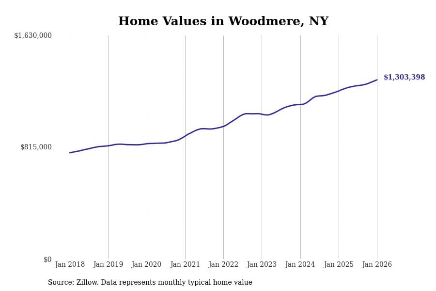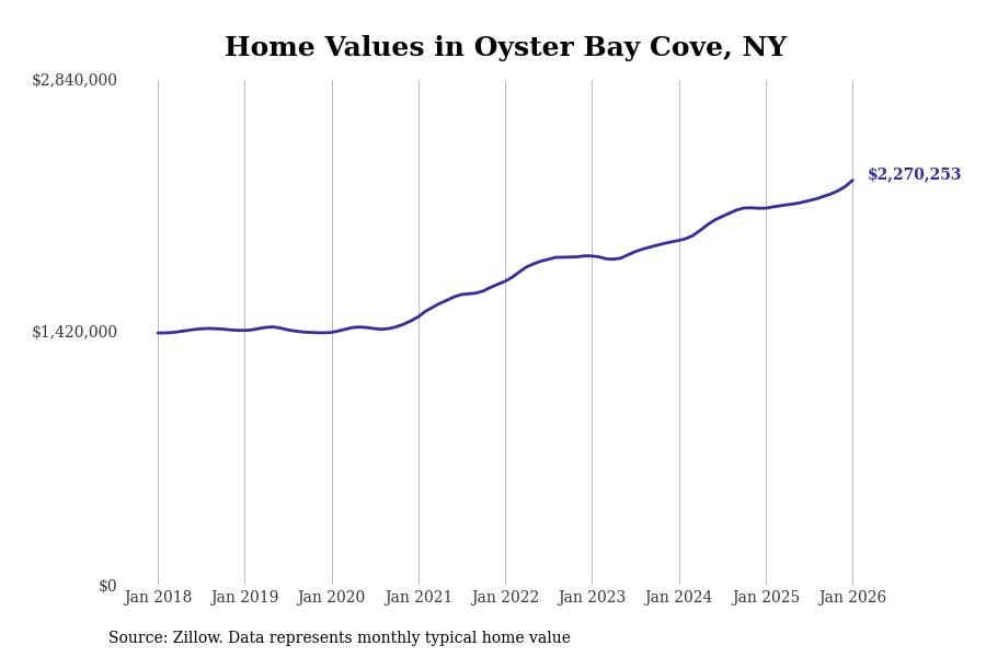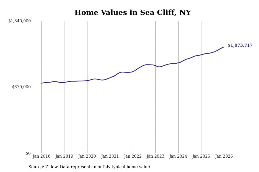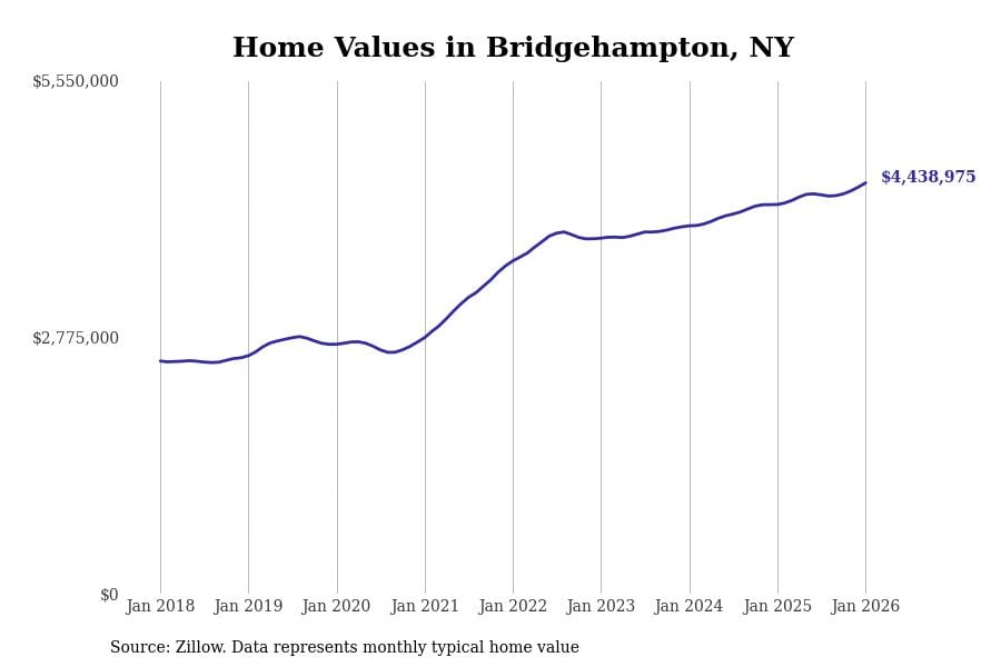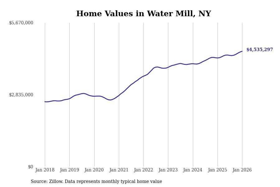 Stacker compiled a list of cities with the fastest-growing home prices in New York using data from Zillow. Cities are ranked by the dollar change in the Zillow Home Values Index for all homes from the 12 months ending January 2026. The charts in this story were created automatically using Matplotlib. Data was available for 50 cities and towns in New York.