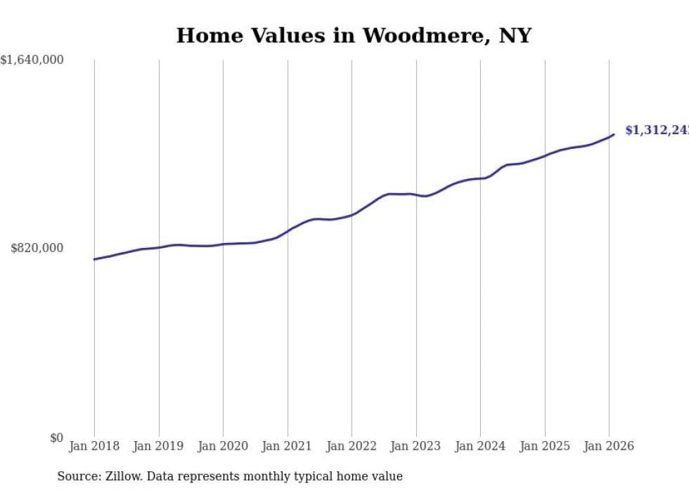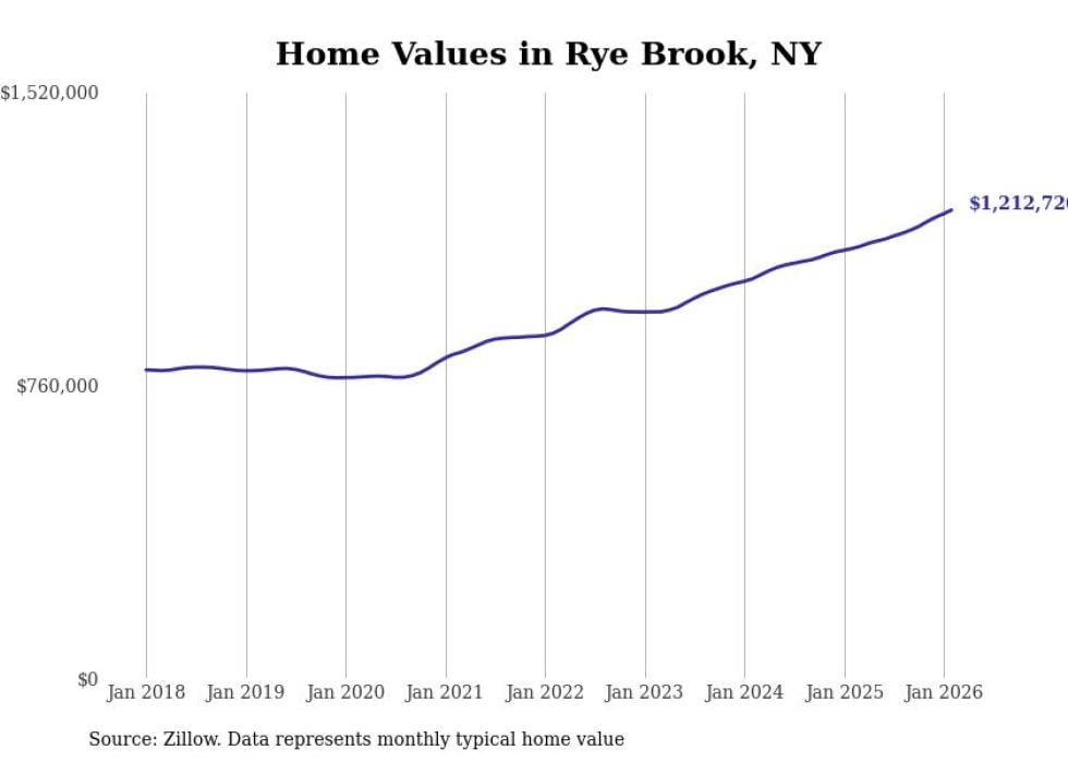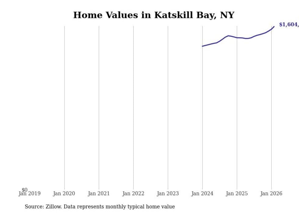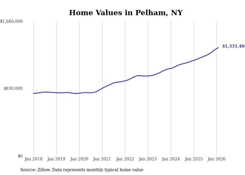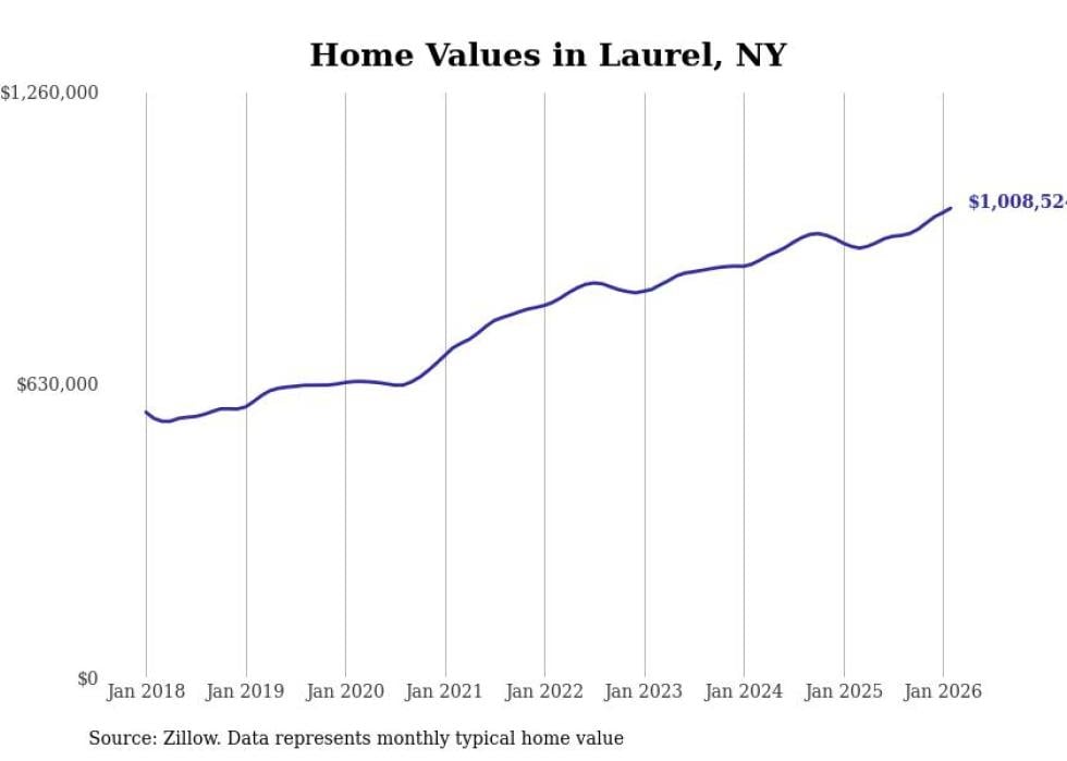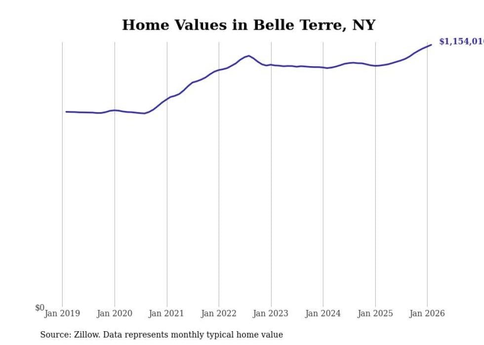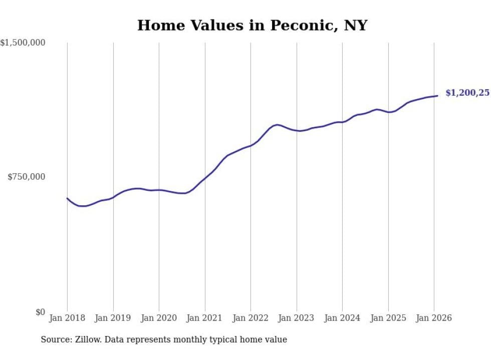 Stacker compiled a list of cities with the fastest-growing home prices in New York using data from Zillow. Cities are ranked by the dollar change in the Zillow Home Values Index for all homes from the 12 months ending February 2026. The charts in this story were created automatically using Matplotlib. Data was available for 50 cities and towns in New York.