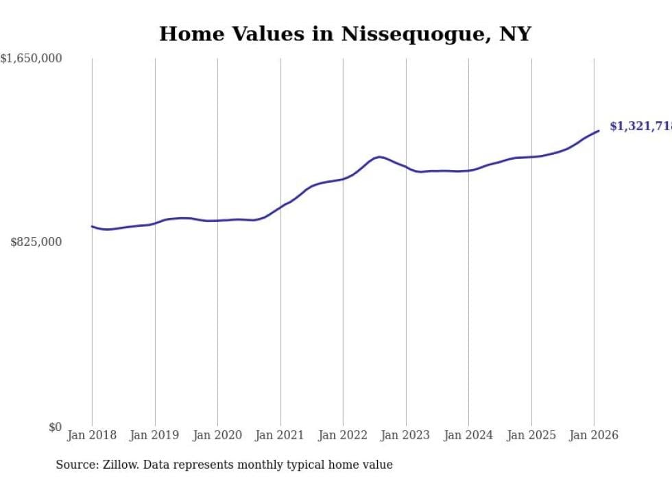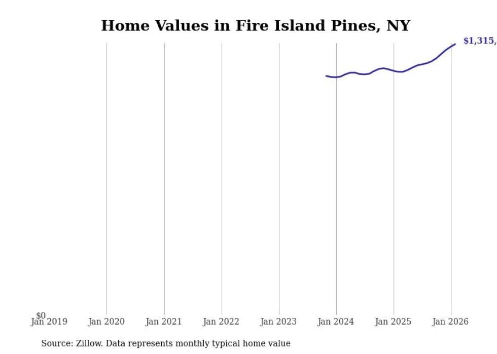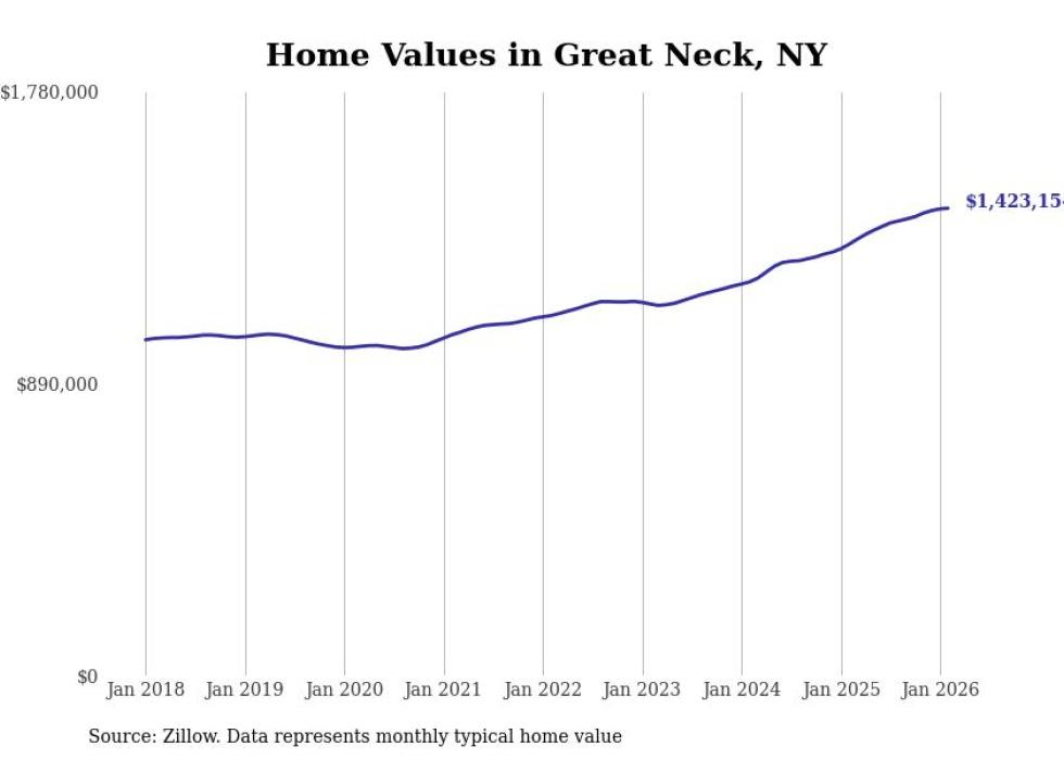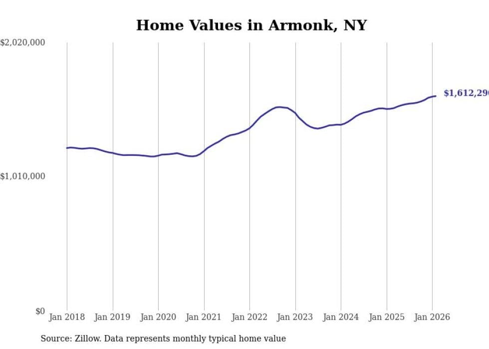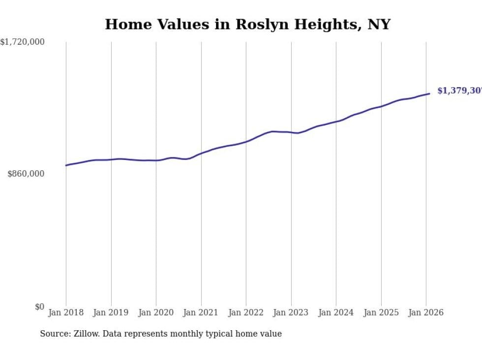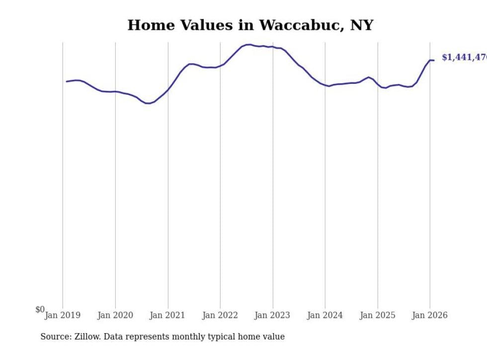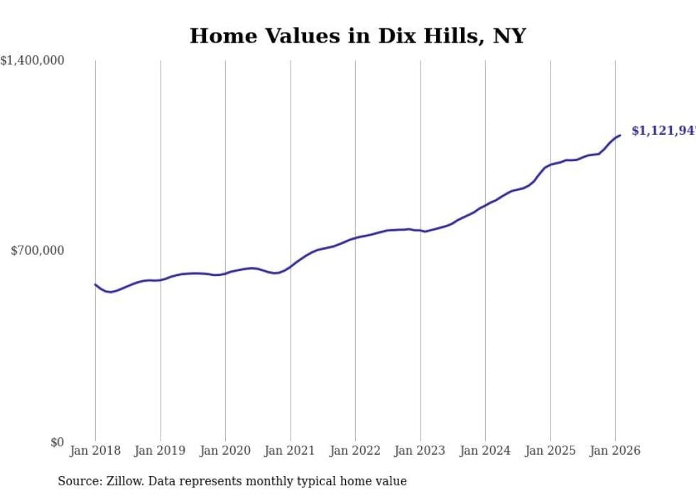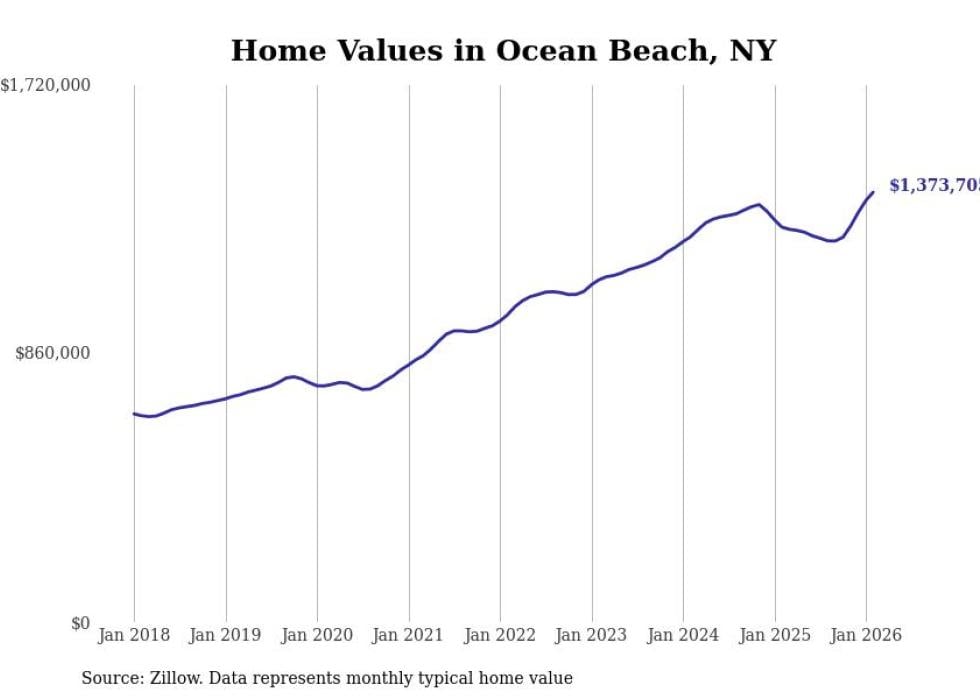 Stacker compiled a list of cities with the fastest-growing home prices in New York using data from Zillow. Cities are ranked by the dollar change in the Zillow Home Values Index for all homes from the 12 months ending February 2026. The charts in this story were created automatically using Matplotlib. Data was available for 50 cities and towns in New York.