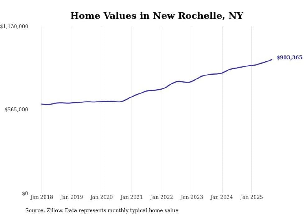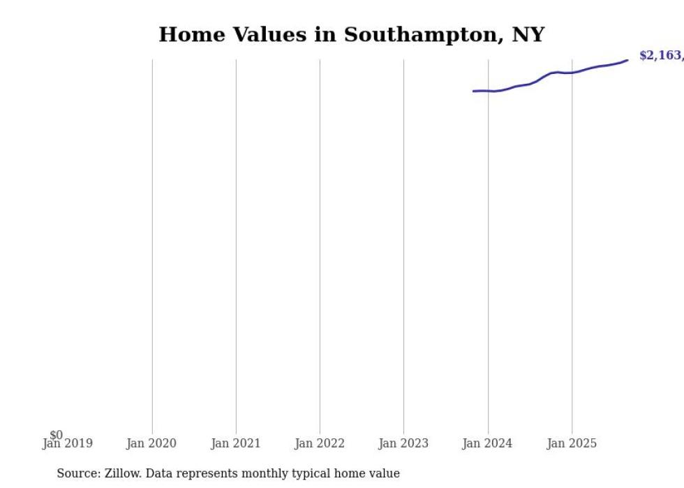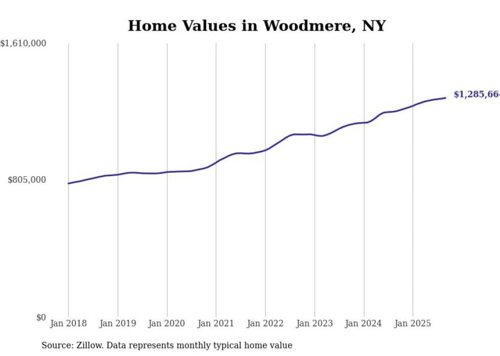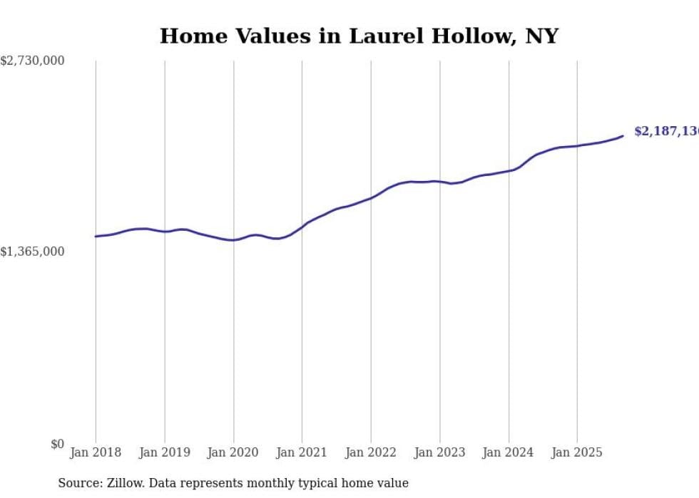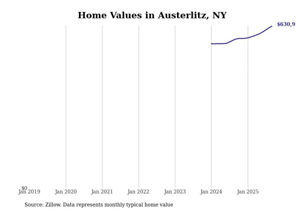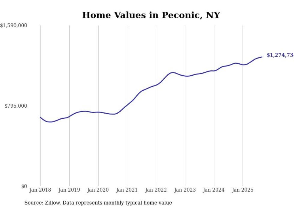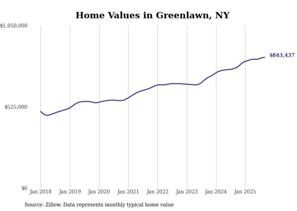 Stacker compiled a list of cities with the fastest-growing home prices in New York using data from Zillow. Cities are ranked by the dollar change in the Zillow Home Values Index for all homes from the 12 months ending September 2025. The charts in this story were created automatically using Matplotlib. Data was available for 50 cities and towns in New York.