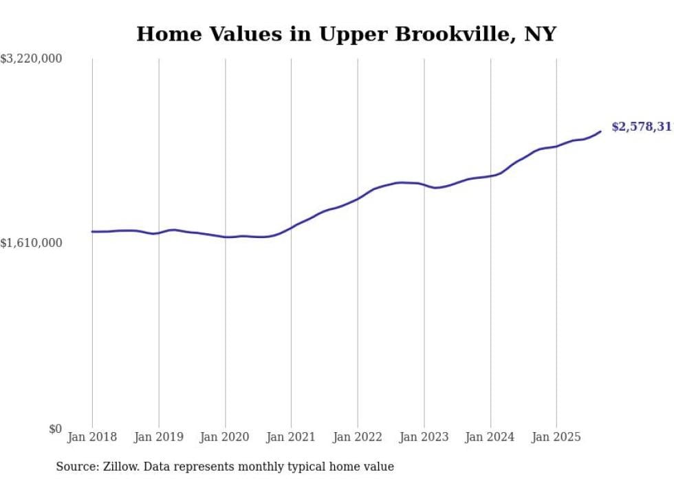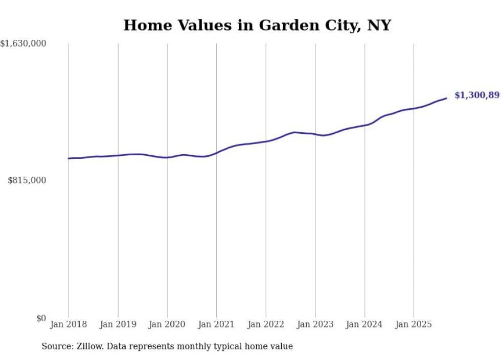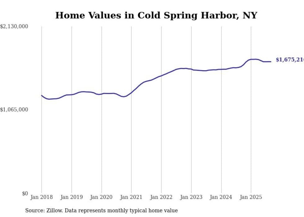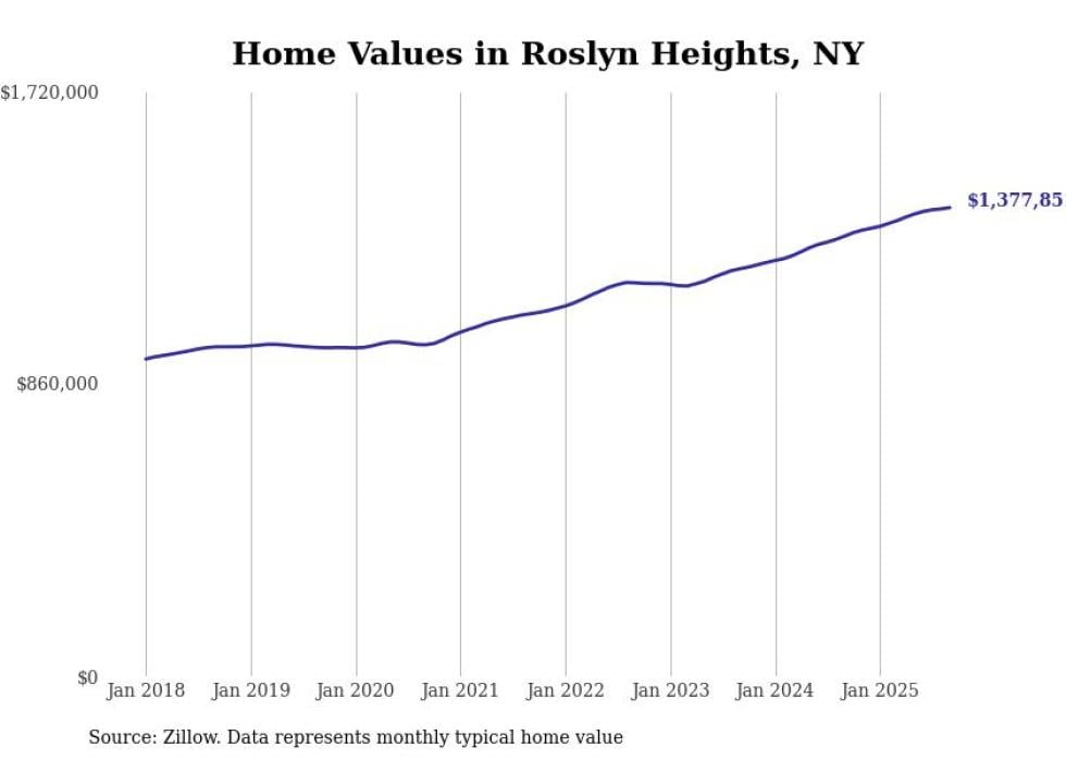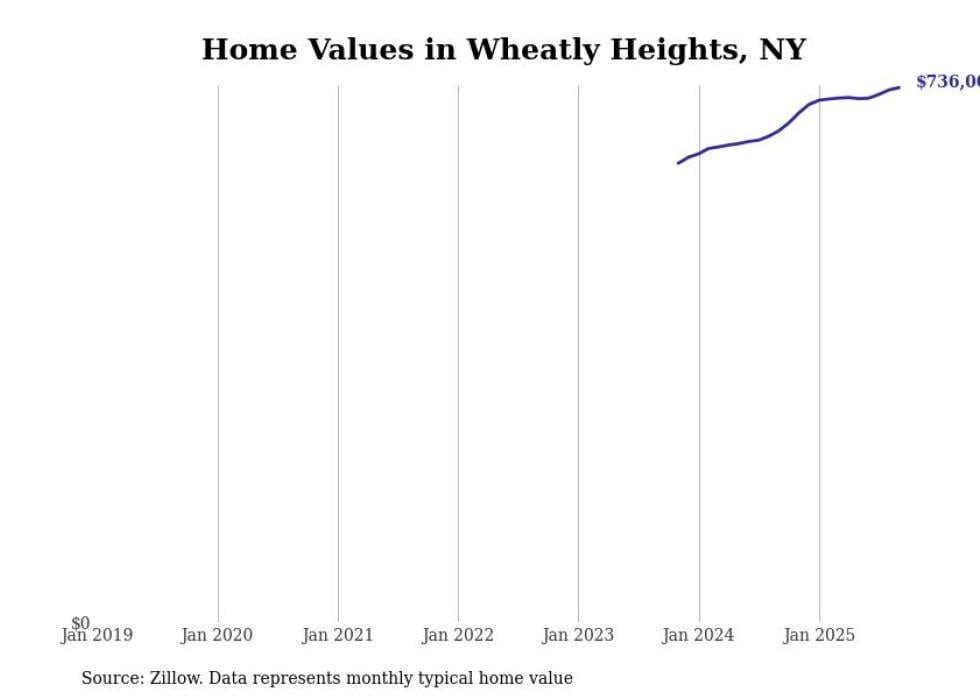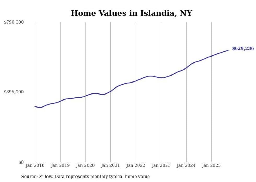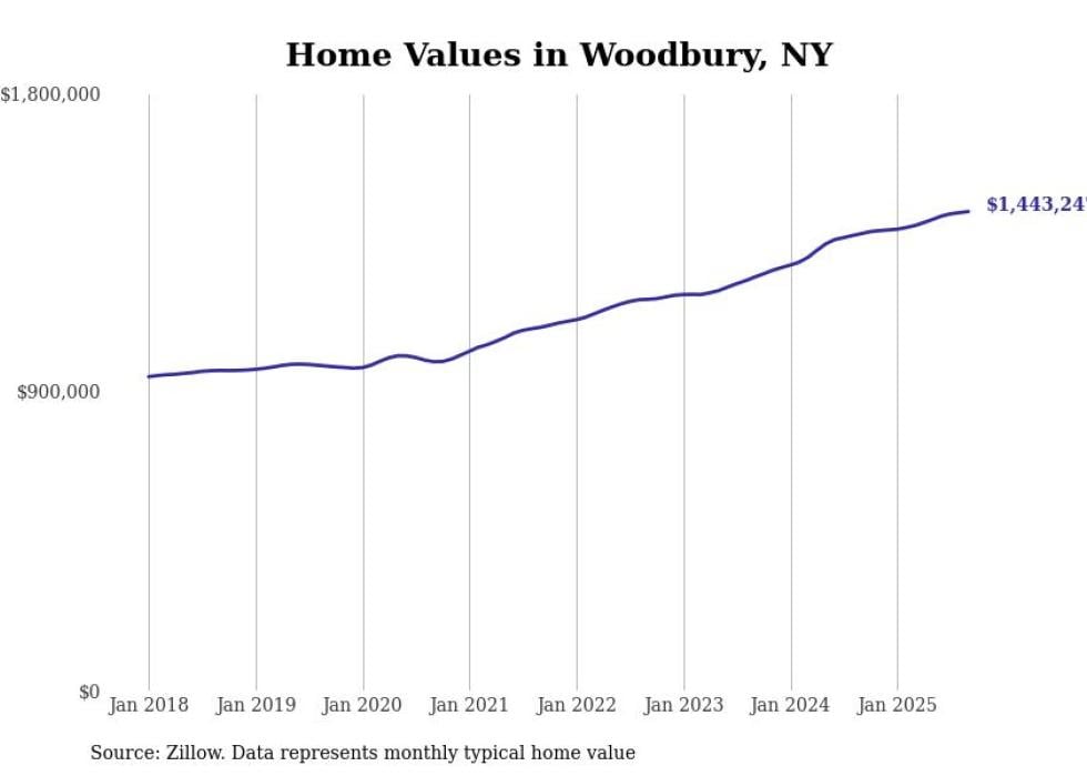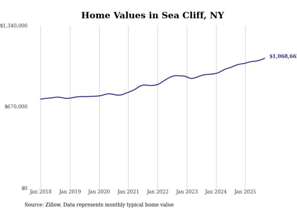 Stacker compiled a list of cities with the fastest-growing home prices in New York using data from Zillow. Cities are ranked by the dollar change in the Zillow Home Values Index for all homes from the 12 months ending September 2025. The charts in this story were created automatically using Matplotlib. Data was available for 50 cities and towns in New York.