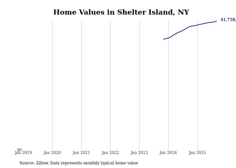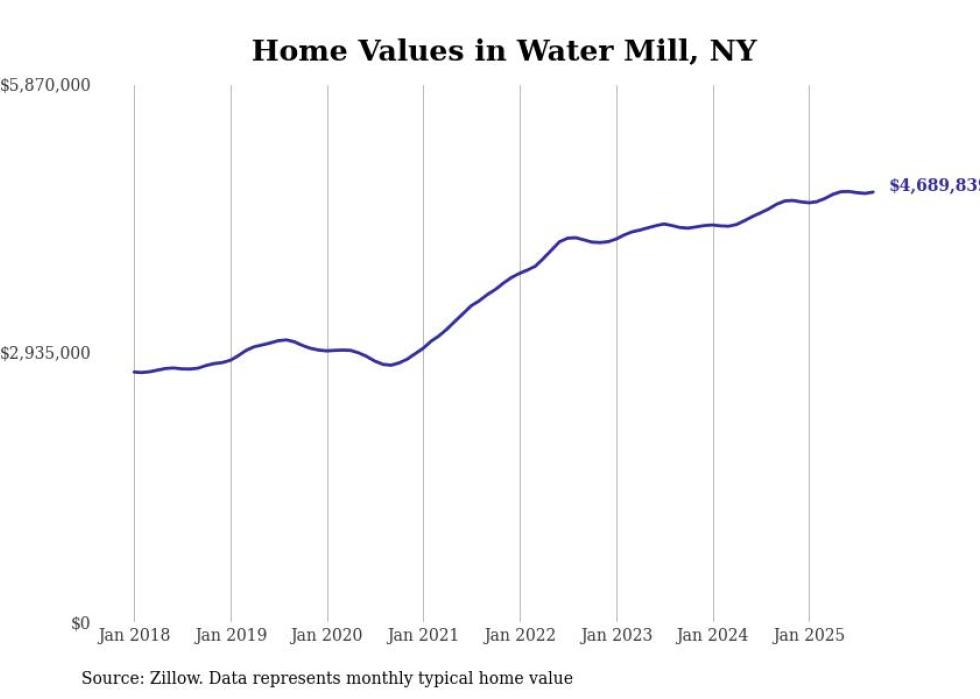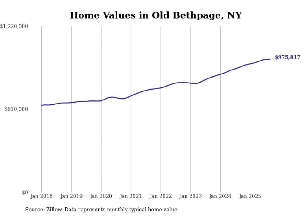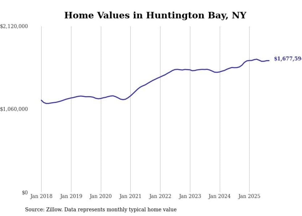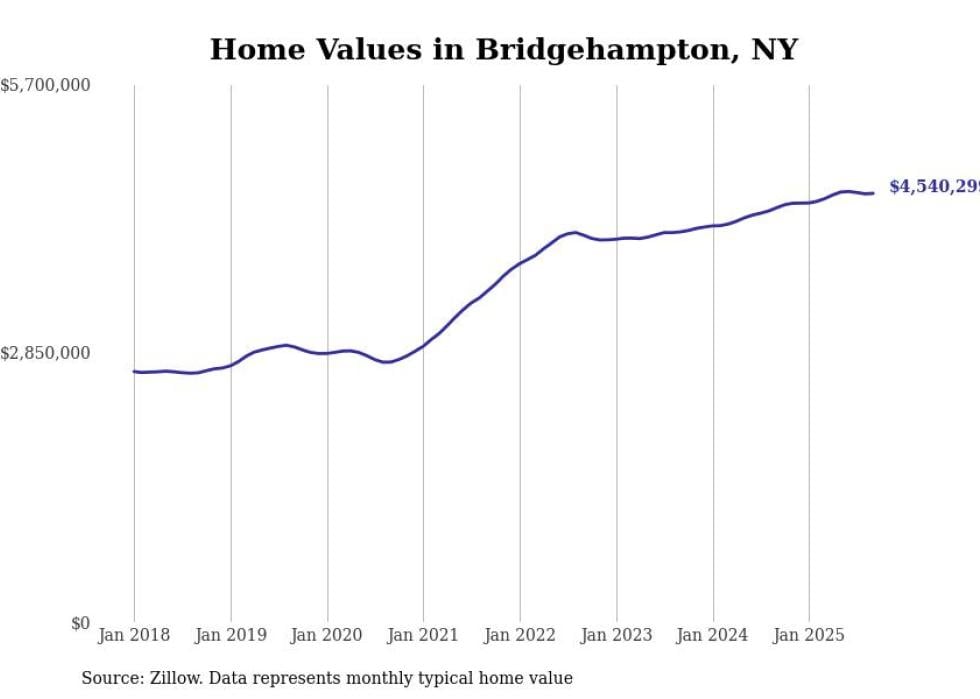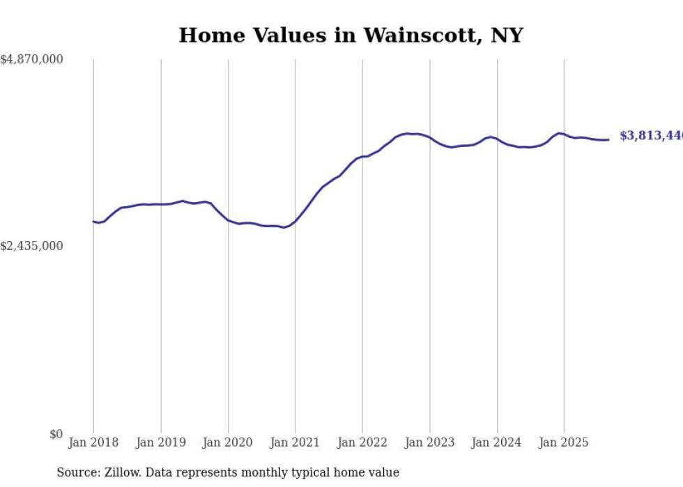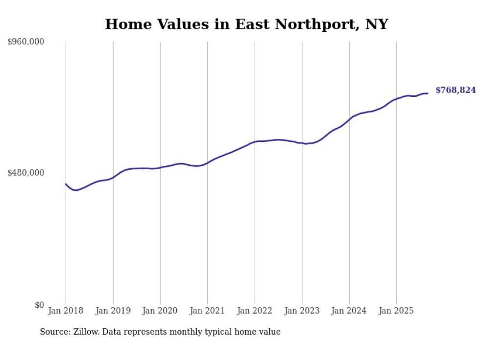 Stacker compiled a list of cities with the fastest-growing home prices in New York using data from Zillow. Cities are ranked by the dollar change in the Zillow Home Values Index for all homes from the 12 months ending September 2025. The charts in this story were created automatically using Matplotlib. Data was available for 50 cities and towns in New York.